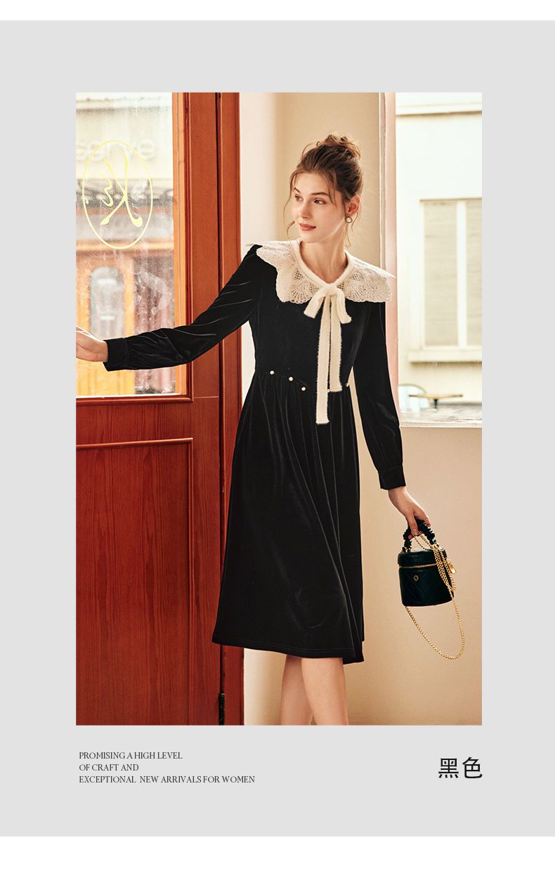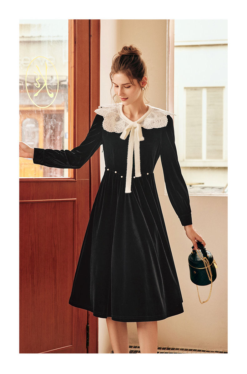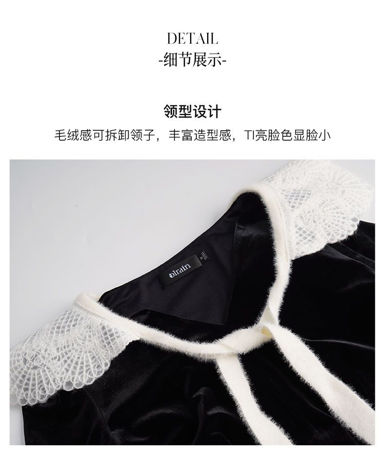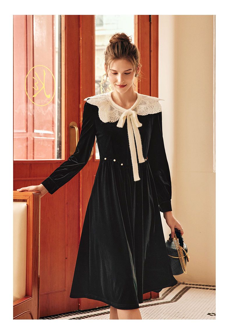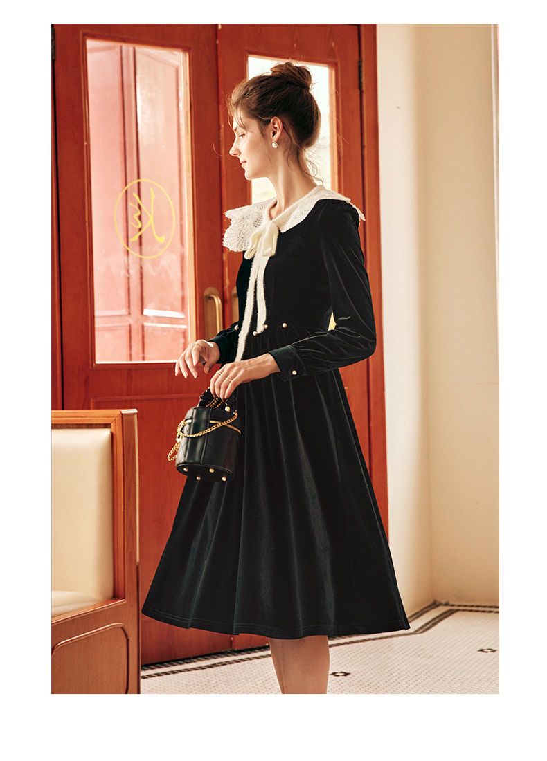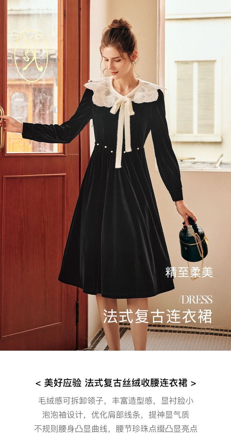 OLrain欧芮儿法式黑色丝绒连衣裙女秋季2022年新款收腰赫本风裙子