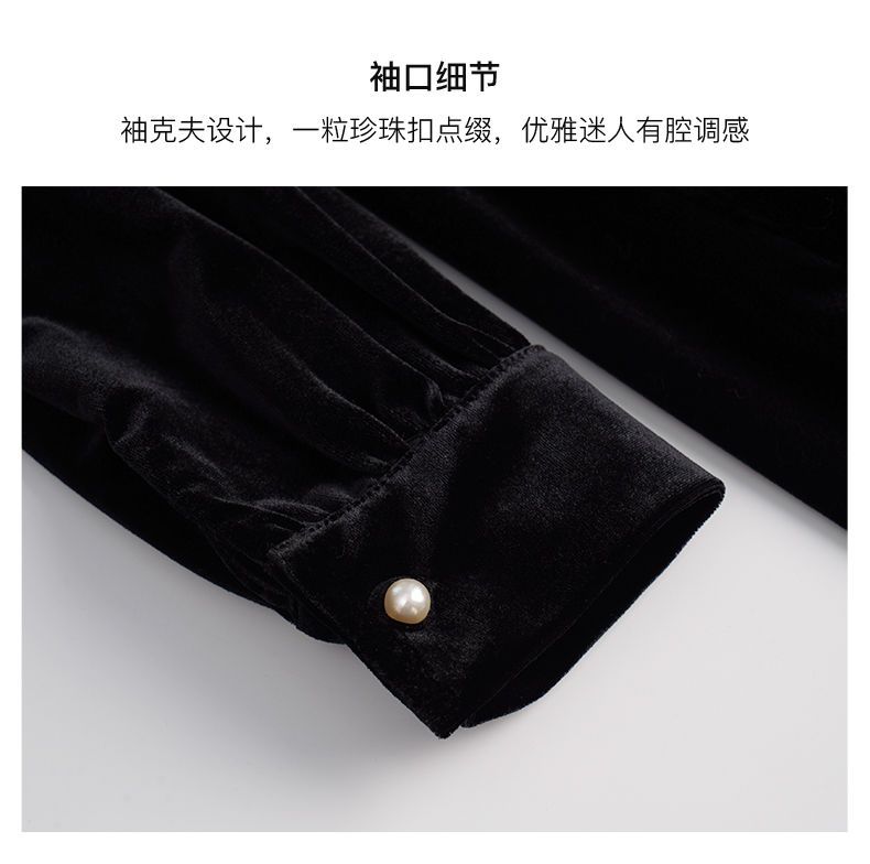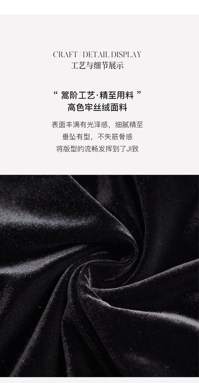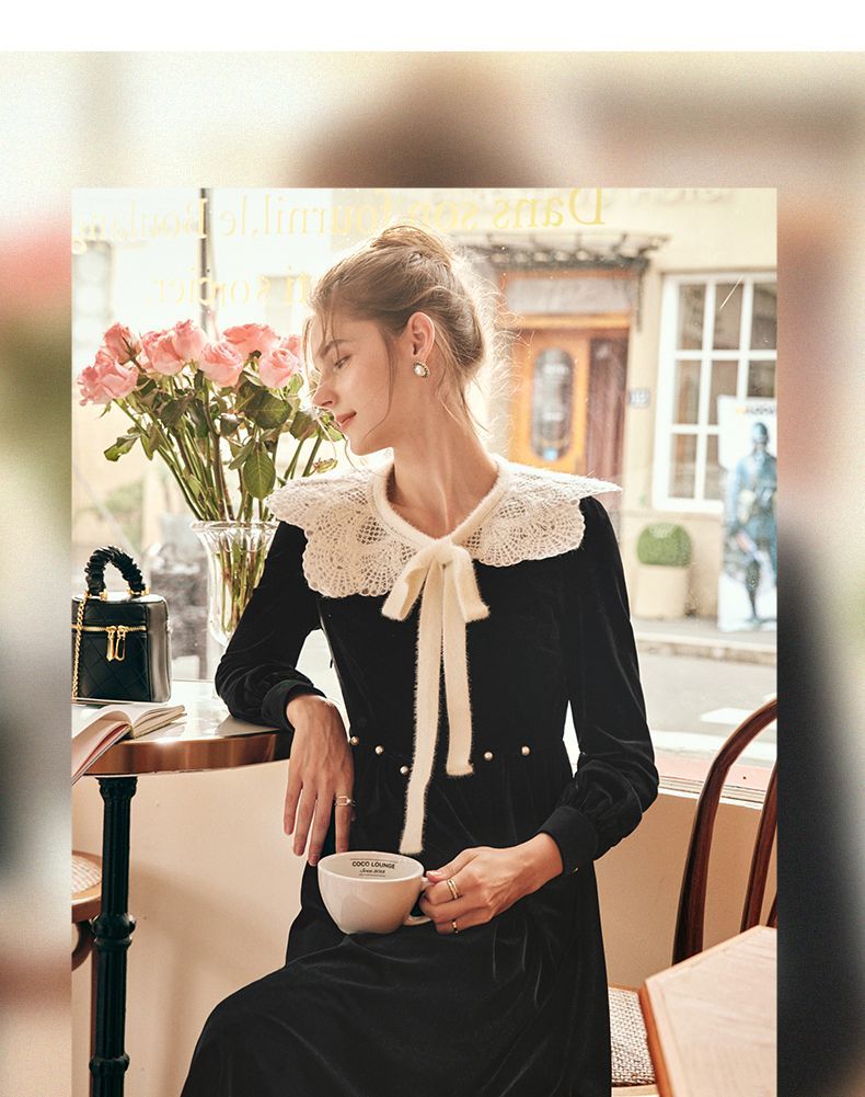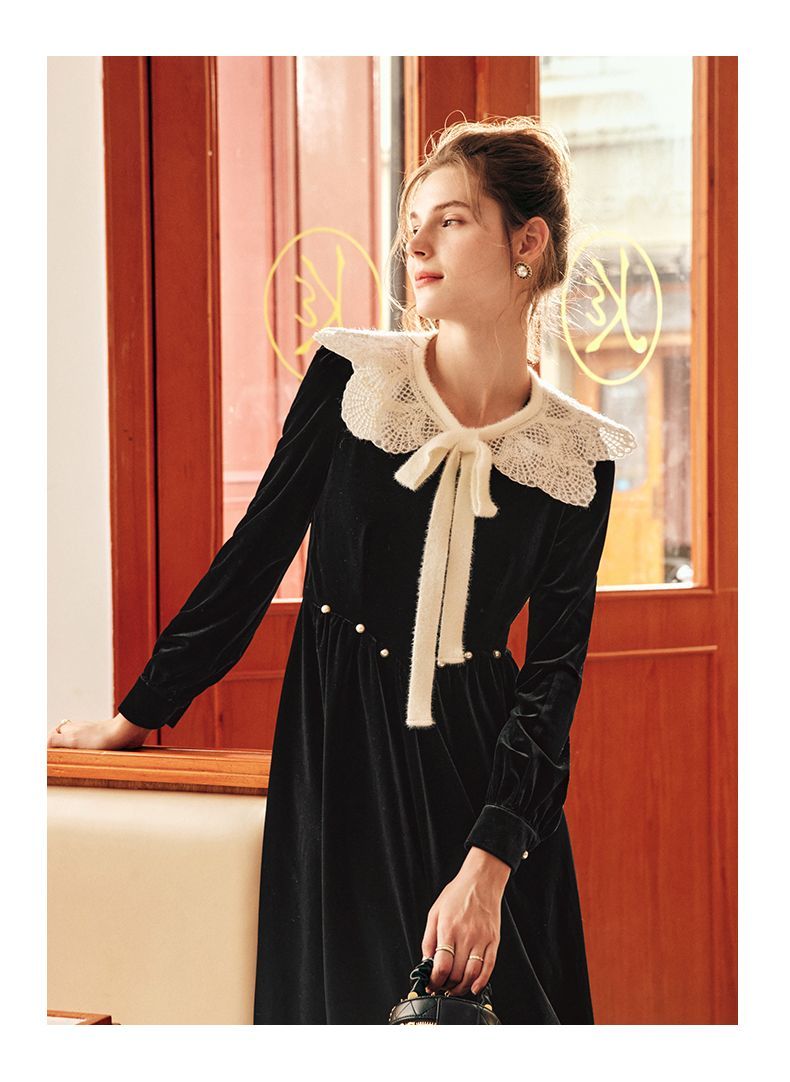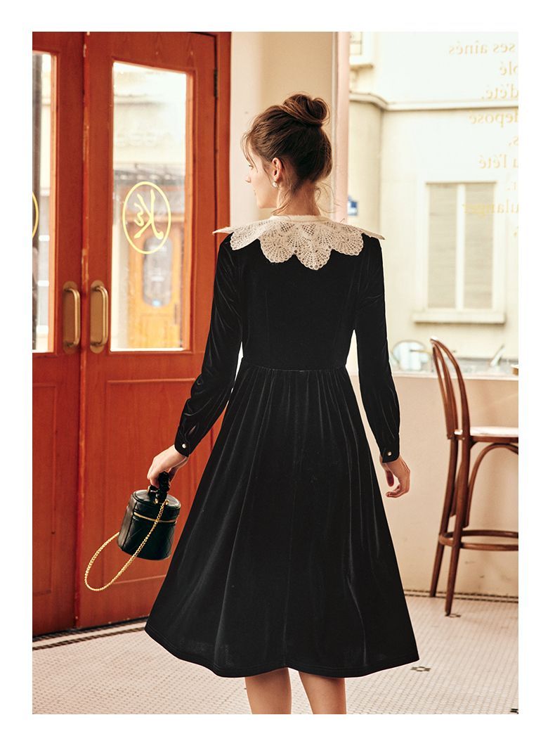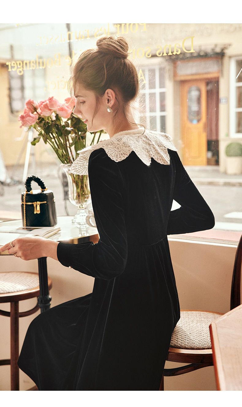 OLrain欧芮儿法式黑色丝绒连衣裙女秋季2022年新款收腰赫本风裙子
