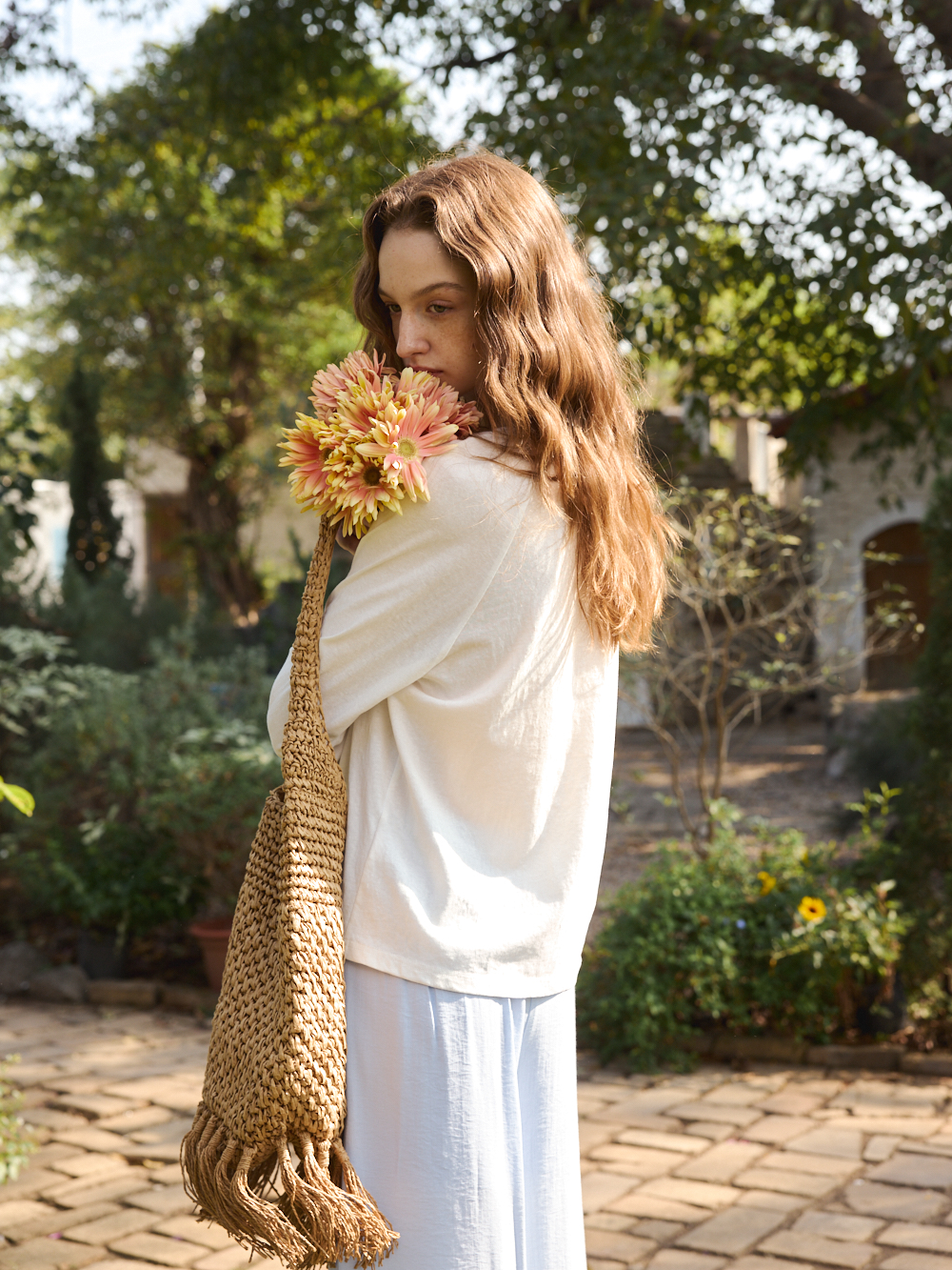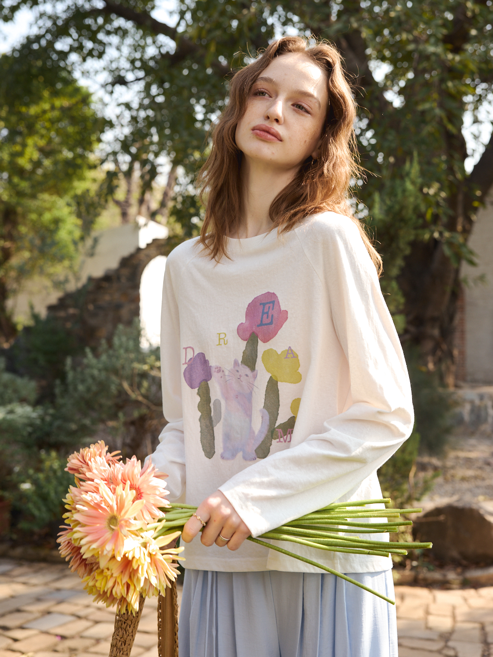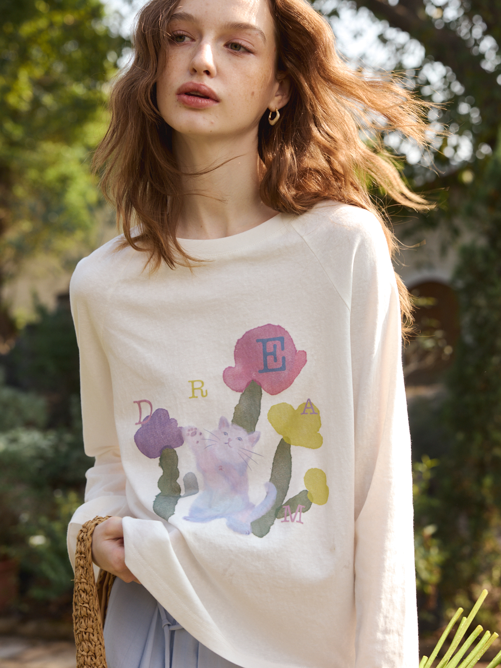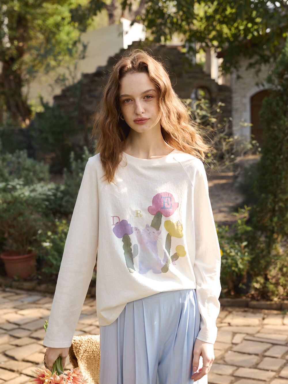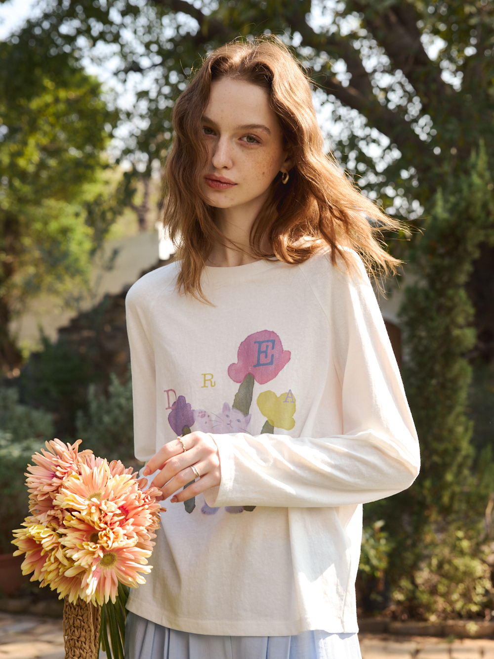 OLrain欧芮儿2026春白色宽松慵懒长袖印花T恤