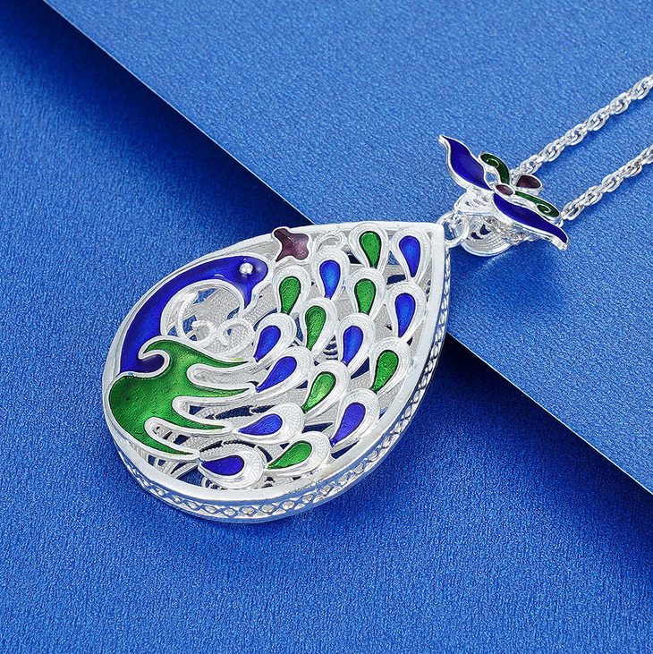【寓意】:捕捉孔雀飞舞姿态,以银花丝编织水滴形吊坠,辅以珐琅彩点染,绚丽丛生,吉祥美好。寓意幸福圆满。