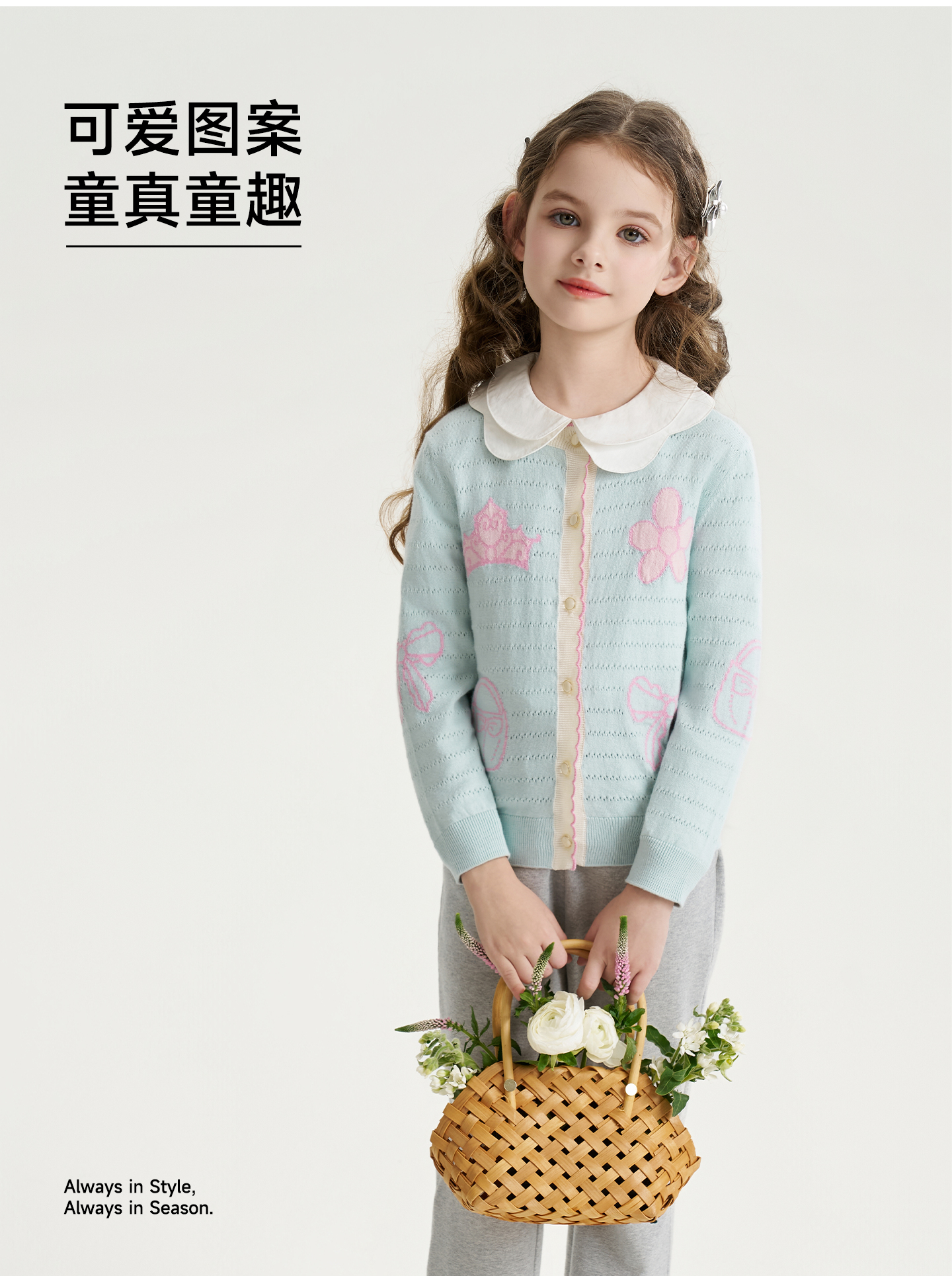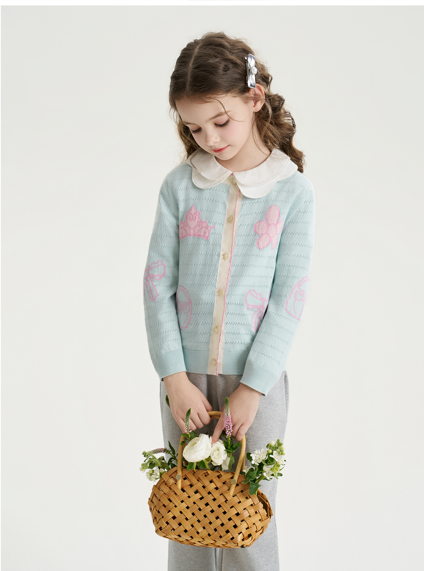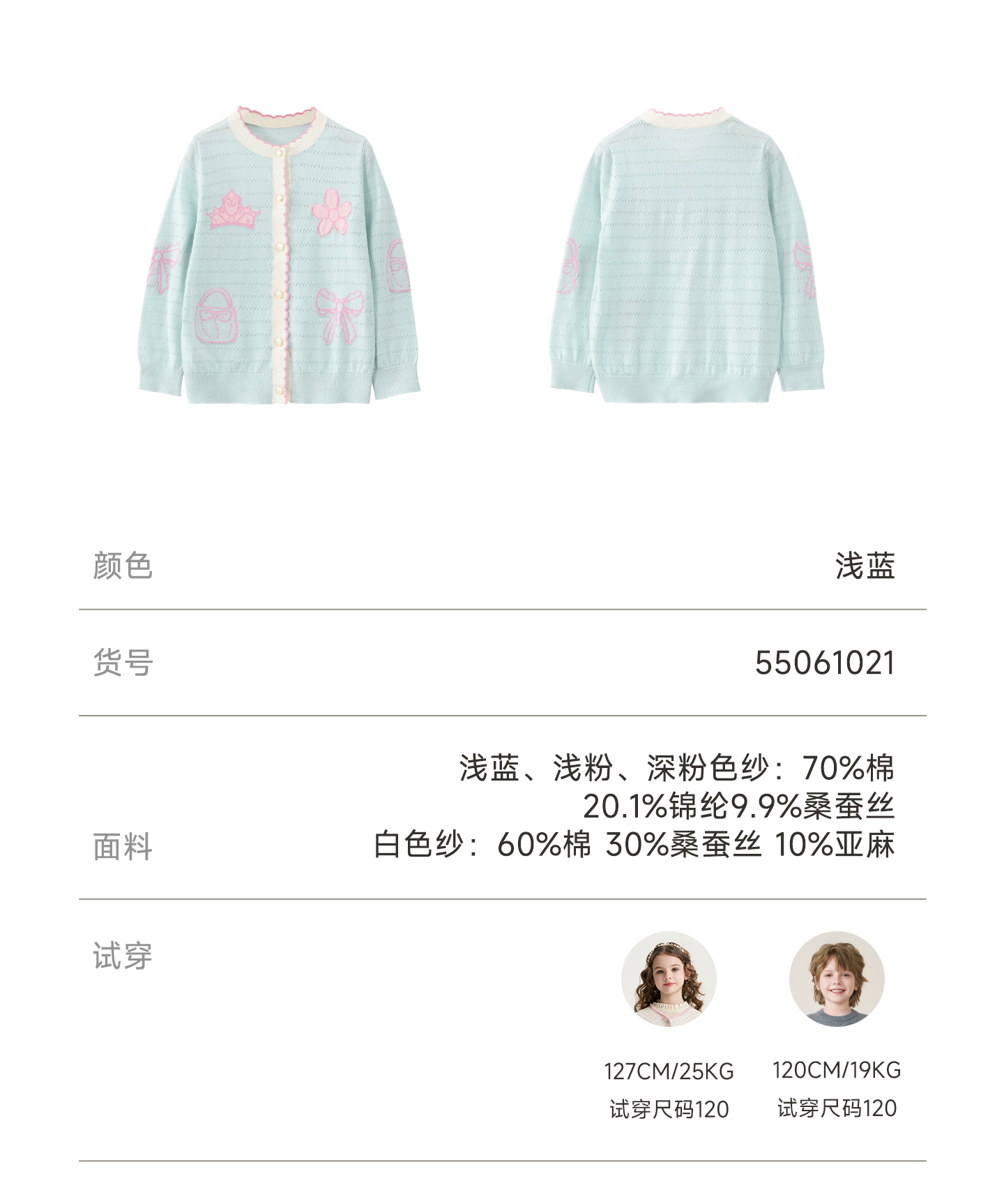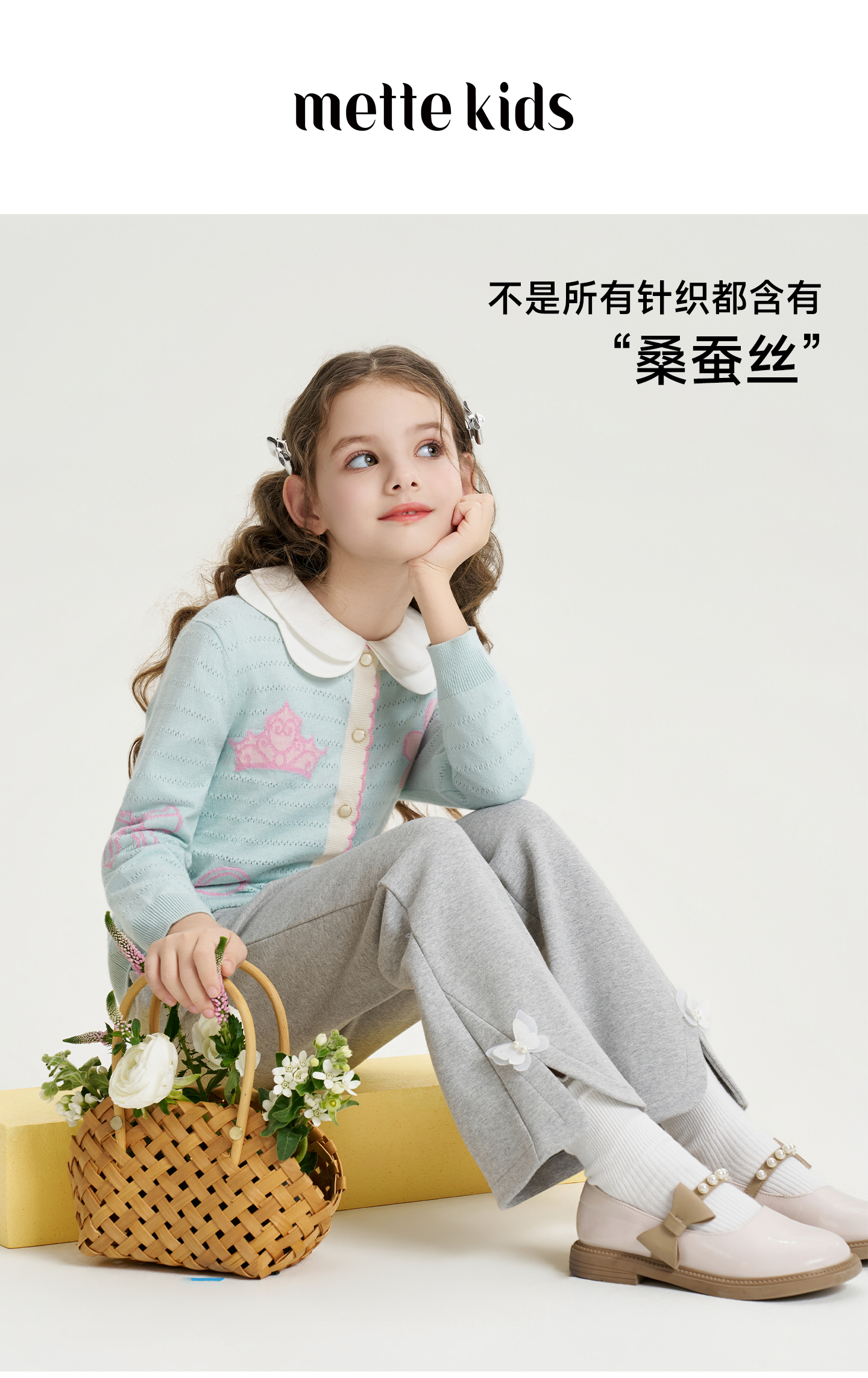 mettekids儿童针织衫2026春季新款女童蓝色花边桑蚕丝毛衣开衫