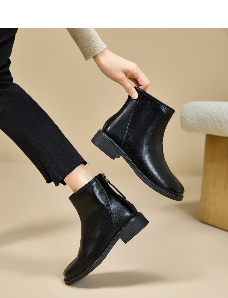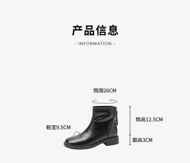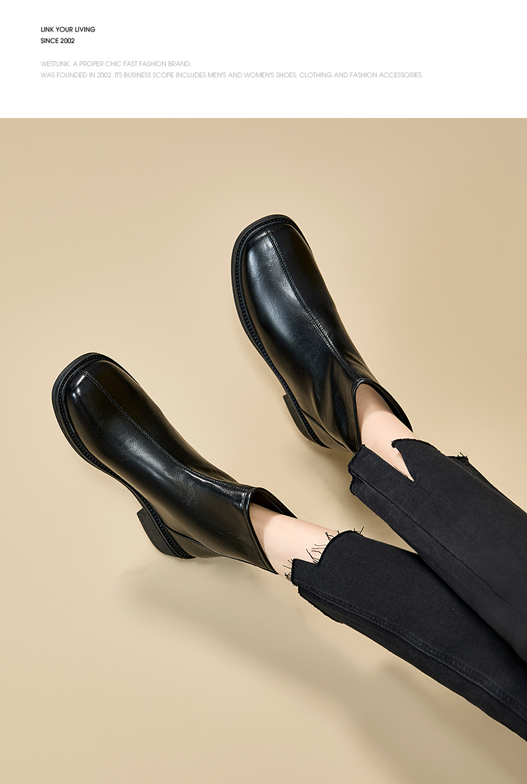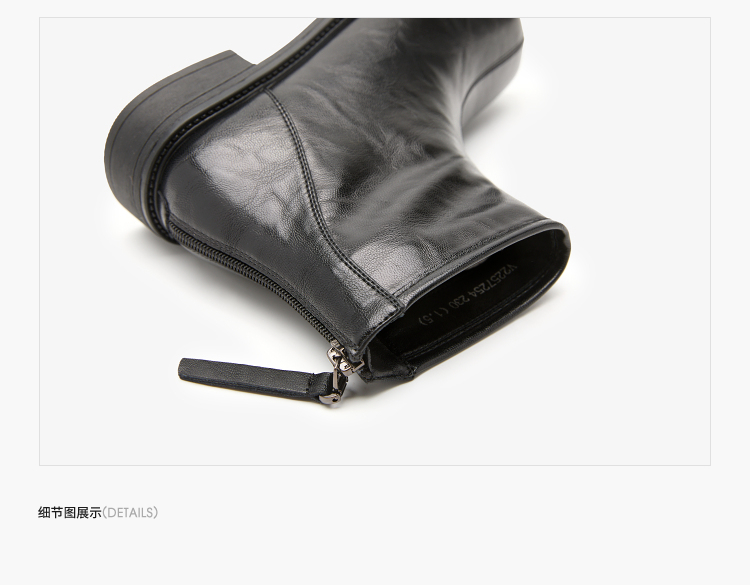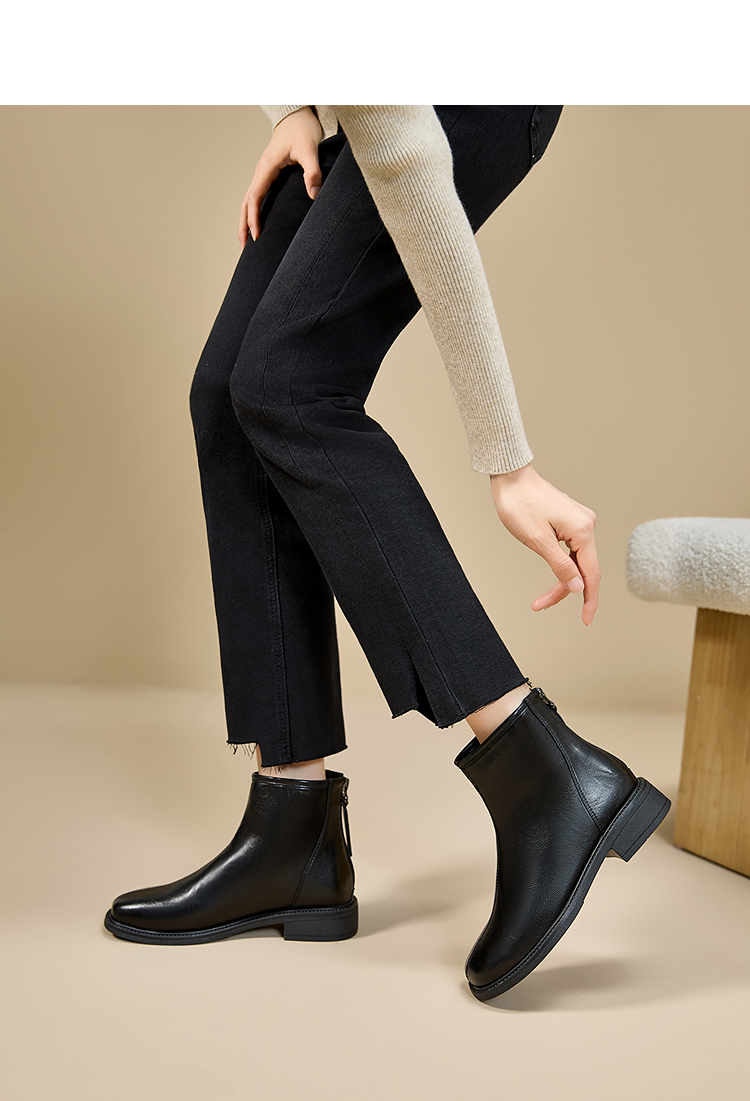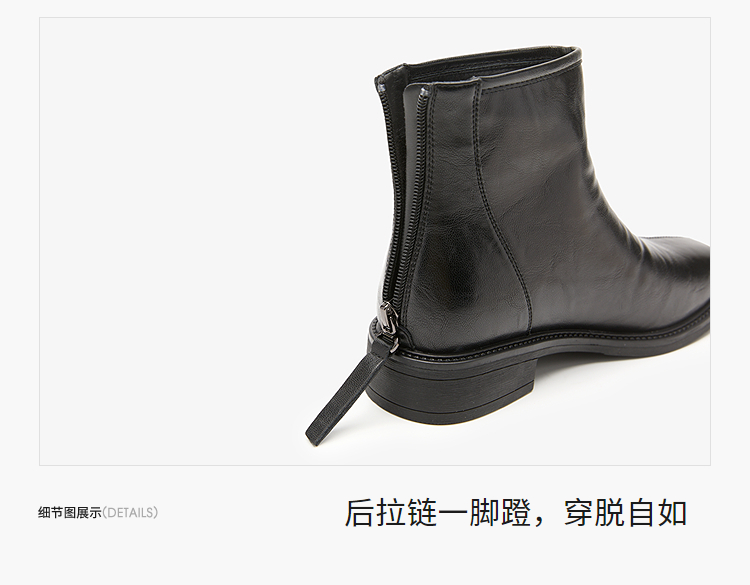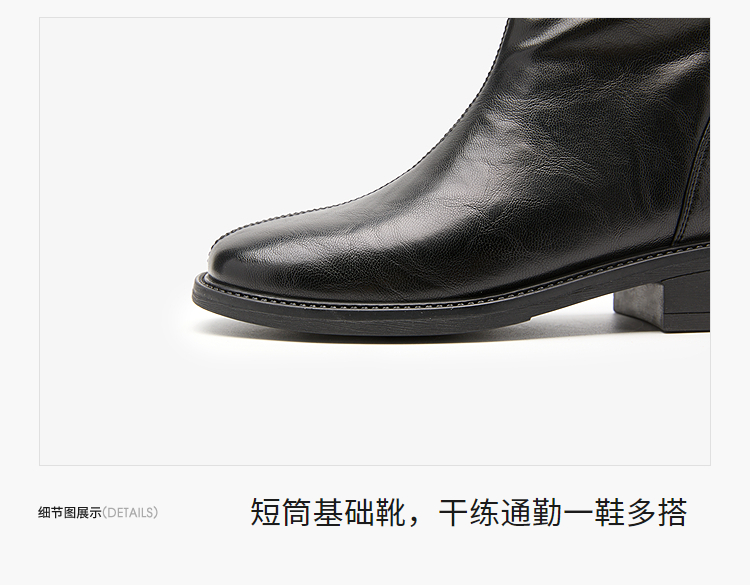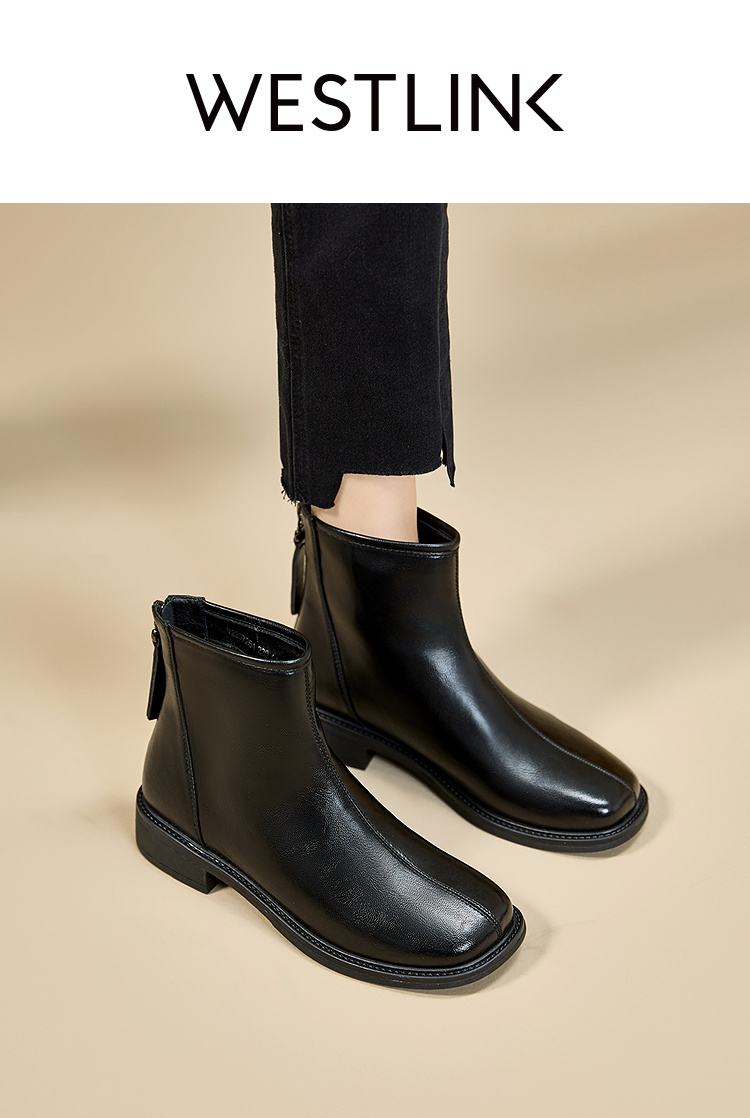 西遇粗跟瘦瘦靴女新款秋冬舒适中跟通勤单靴子圆头黑色短靴V2257254