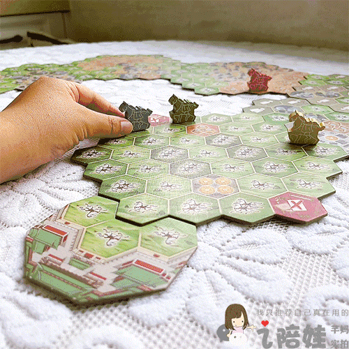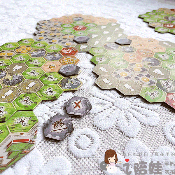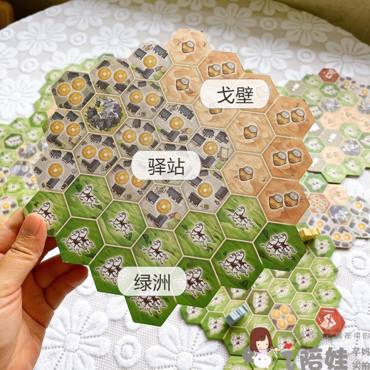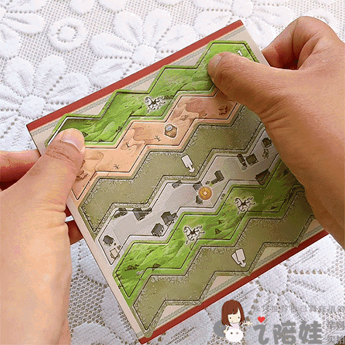 游戏的底板还是双面的,上面图标的数量越多,则通过该区域的难度越大。规则书给了6个推荐摆法,可以从推荐的开始玩;之后孩子就可以自己设计版图(芊芊特爱一上来就整高难度的,让大家都走很慢,有利于她这种爱前期囤牌的)。