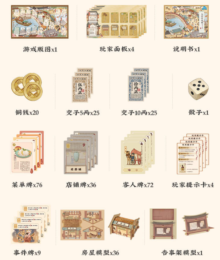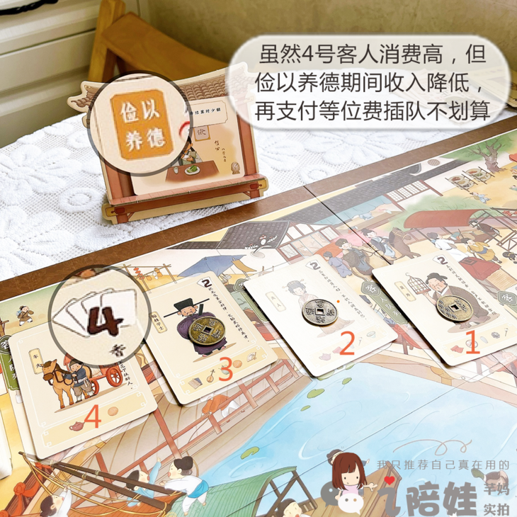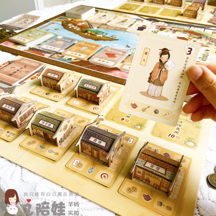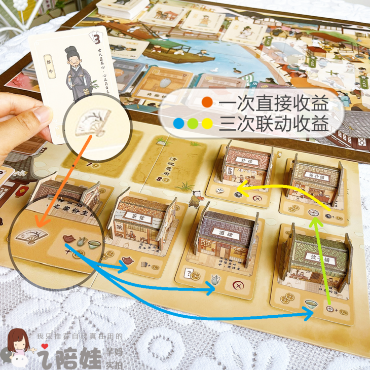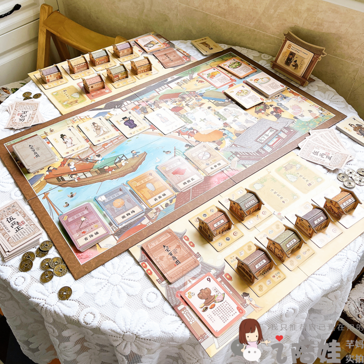 闺蜜说孩子能想到这一步,还得是因为我最近推荐她的一款桌游《大宋百商图》。里面有一个联动挣钱的机制,就是客人逛了一家店后,会在其他联动店铺里也产生收益。