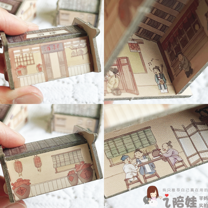 但是这一看,竟发现好多细节。房子不仅是外面有图案,里面的图案也是对应的。比如这个酒肆的内堂,有散桌、有雅间、还有唱曲助兴的,连窗户、窗帘、屏风都是里外对应的,太细节控了。