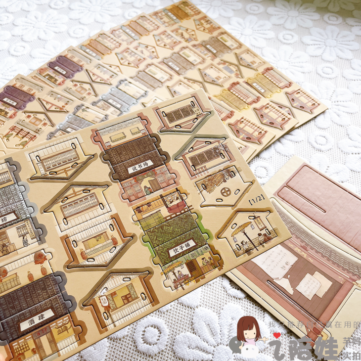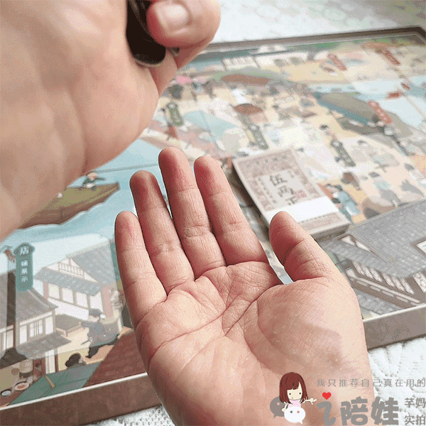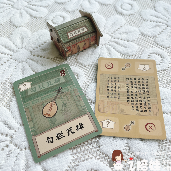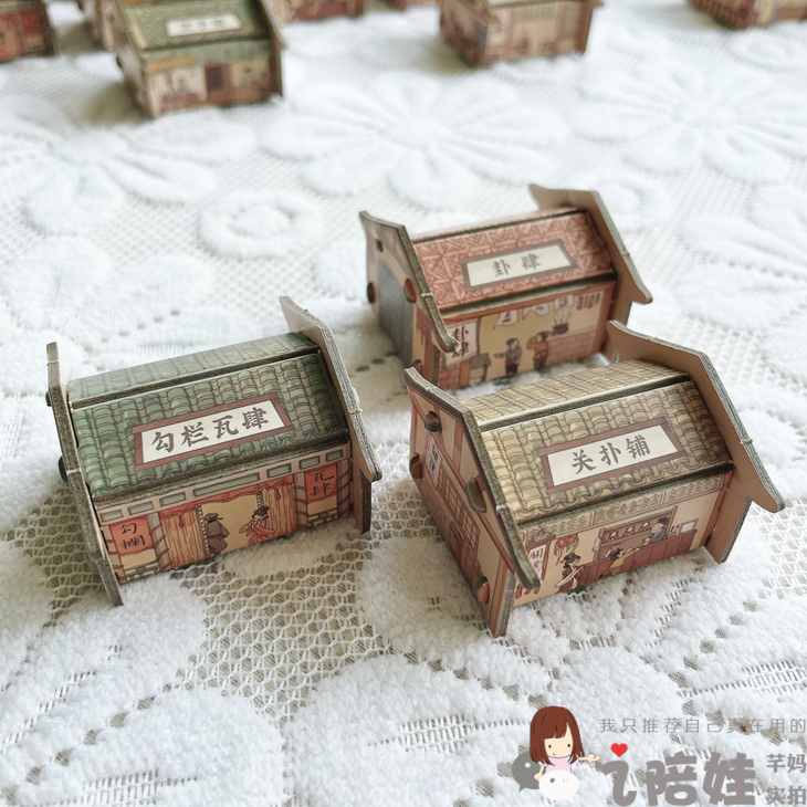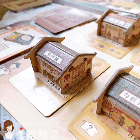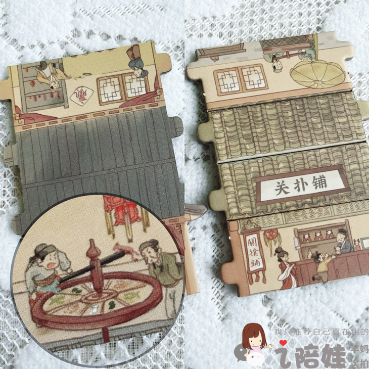 像《大宋百商图》里的店铺,是需要手动拼装的,芊芊第一次把整版都扣下来了,结果发现弄混了,只能通过图案来一一对应。