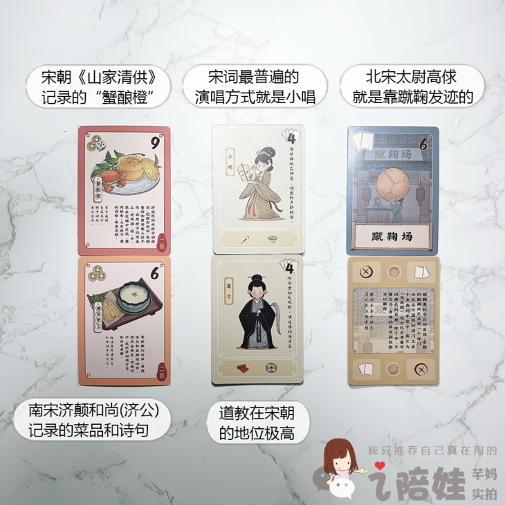 每一张游戏手牌都细节满满,比如人物牌上,都有相配的诗词;食物牌上有具体的做法;店铺牌上也有诗词和相关背景。我刚玩的时候,真是放下这张拿起那张,看都看不过来。