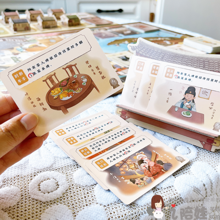 游戏中还有事件牌,赶上“时和年丰”,会有额外奖励;赶上“无奸不商”“苛捐杂税”,就是小惩罚;还有“张灯结彩”和“银装素裹”,会改变客人顺序,可能刚为了迎接某个大户做好的准备,转脸大户就走了。