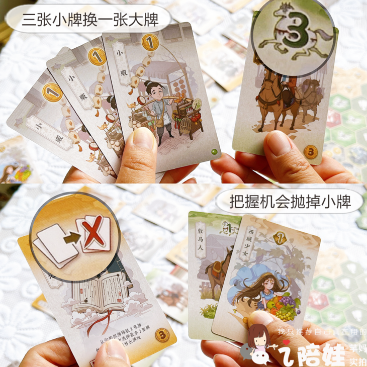 随着游戏的进程,会有越来越多的功能牌被启用,这时候就需要孩子有一个招募的思路,不是看哪个顺眼就拿哪张。比如前面快要到戈壁了,就要提前储备“水”牌,并且可以适当扔掉些“马”,加快手牌中“水”出现的频次。