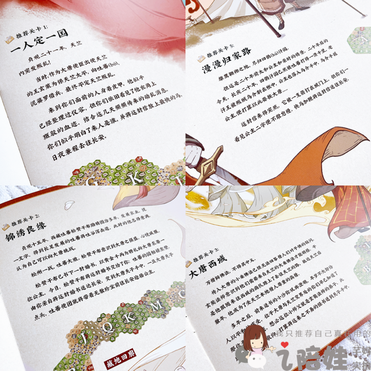 规则书除了介绍具体的游戏流程和手牌规则,还有每个推荐关卡的历史背景故事。孩子感兴趣的话,可以找相关的视频/纪录片,丰富下知识储备。(当然不了解这些历史,也不影响玩哈)