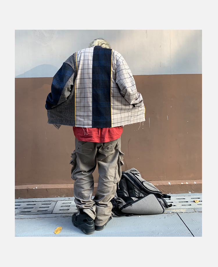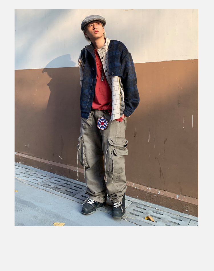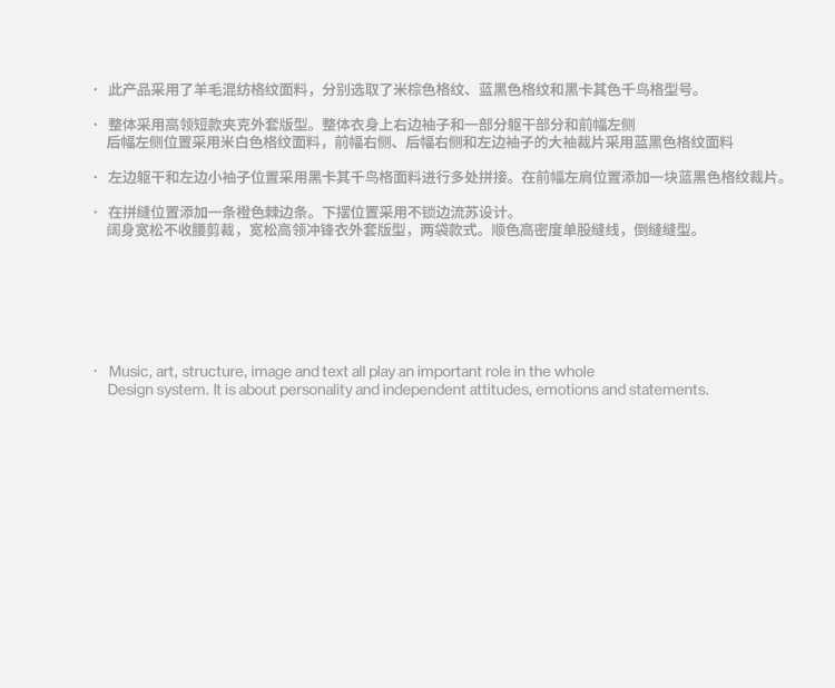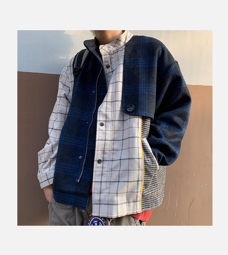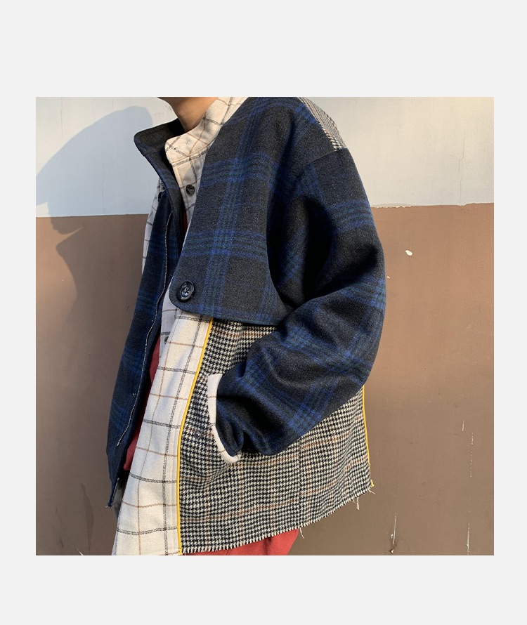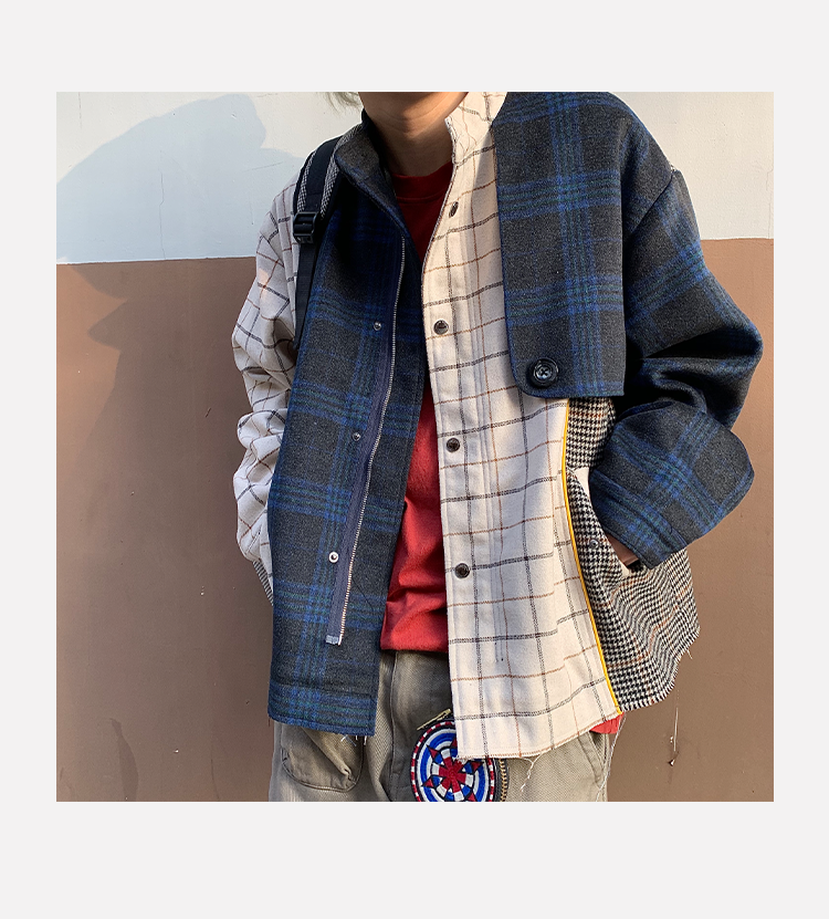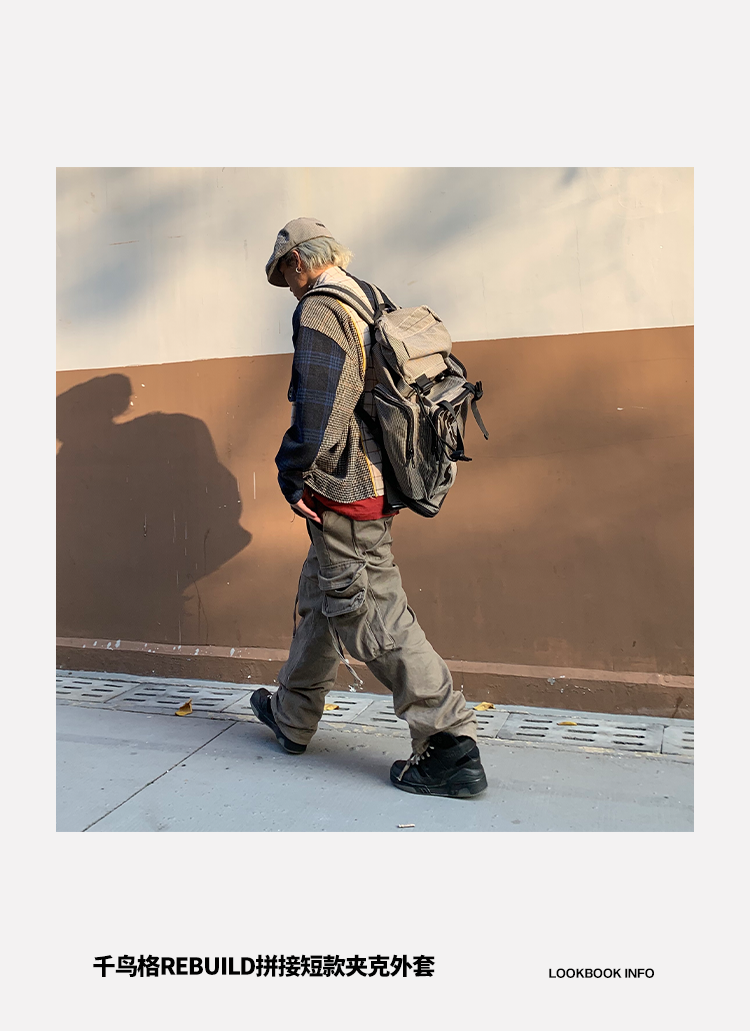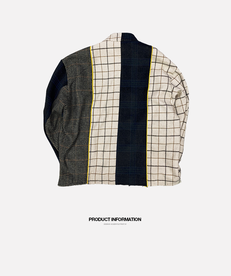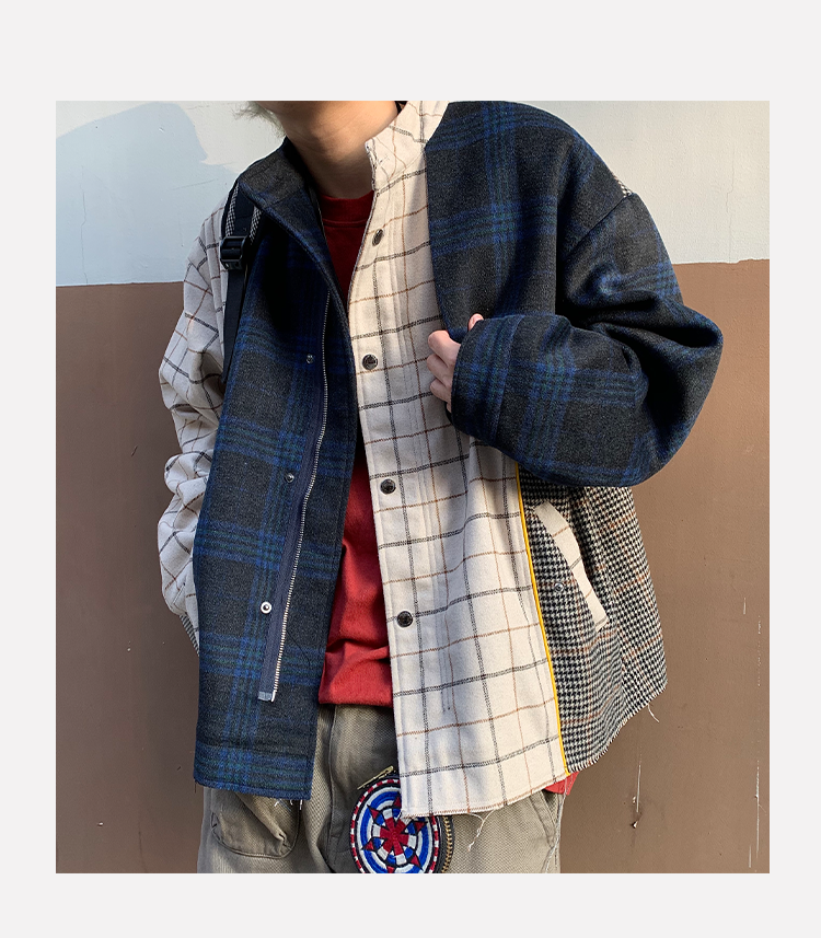 POH千鸟格子纹短款夹克男Rebuild撞色条拼接须边茄克设计感外套男