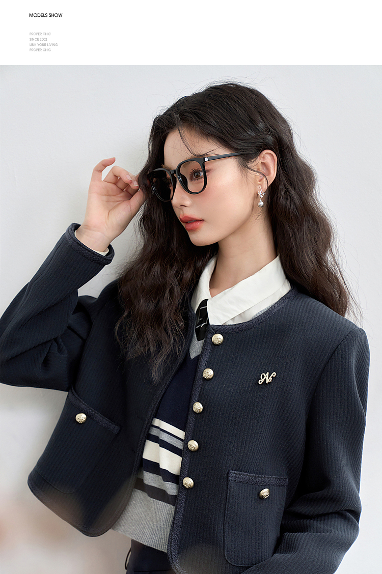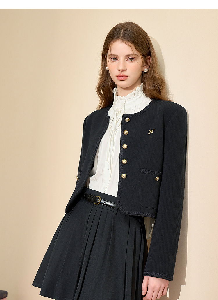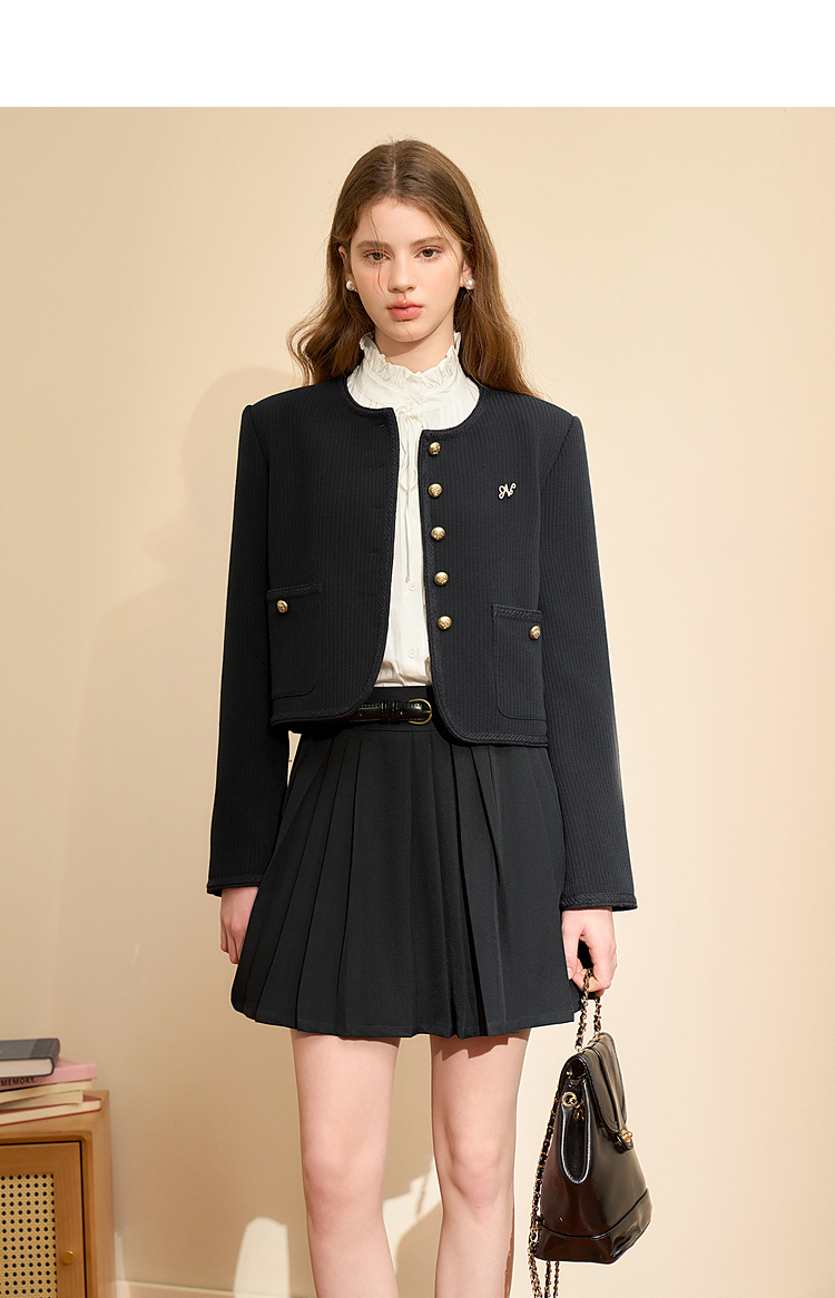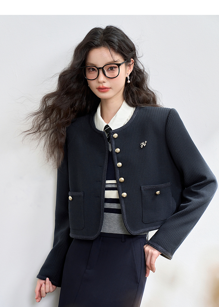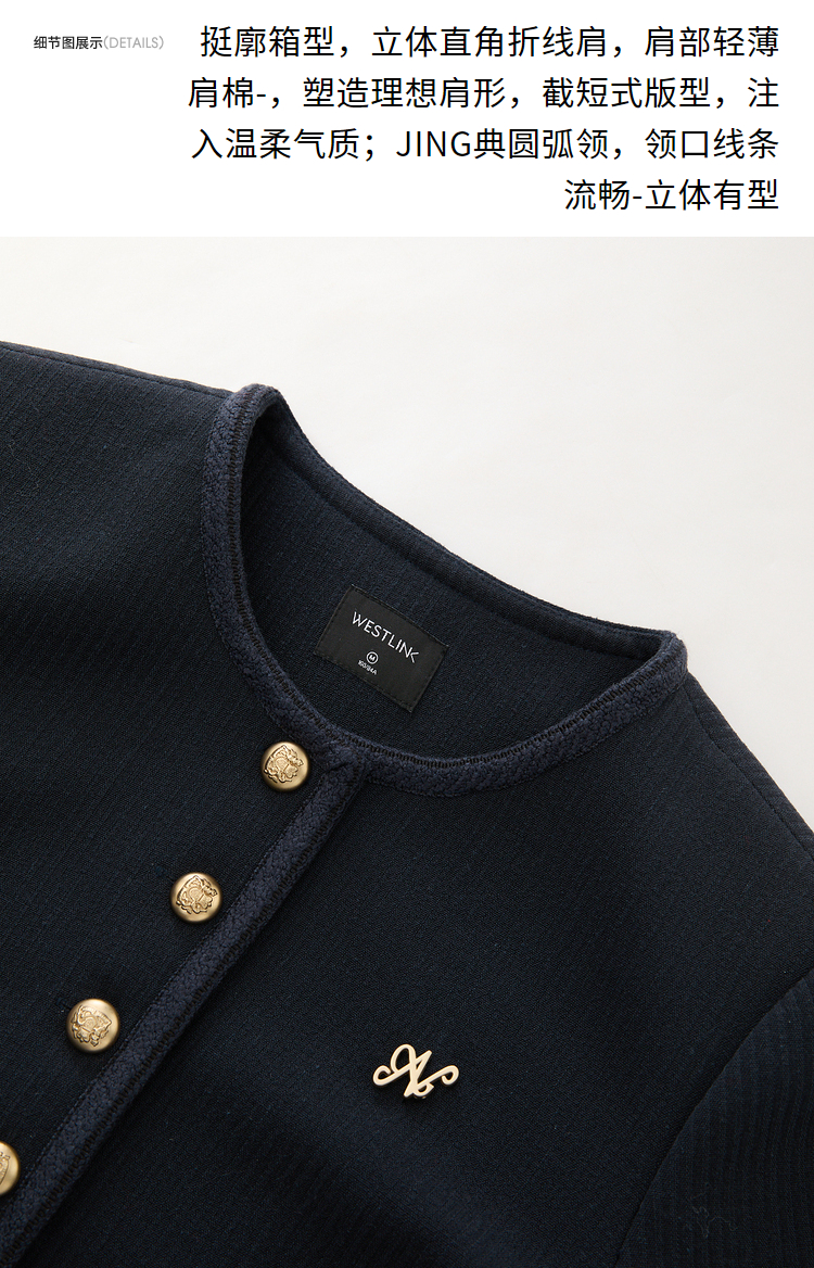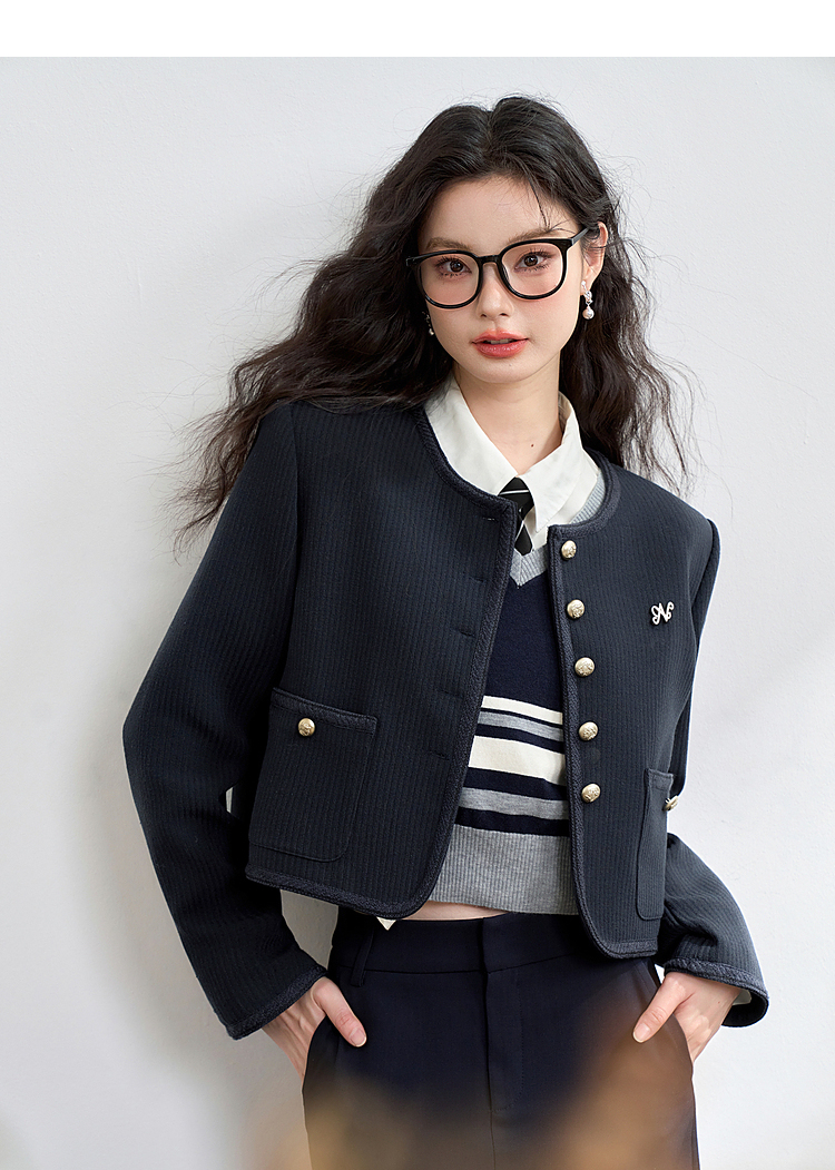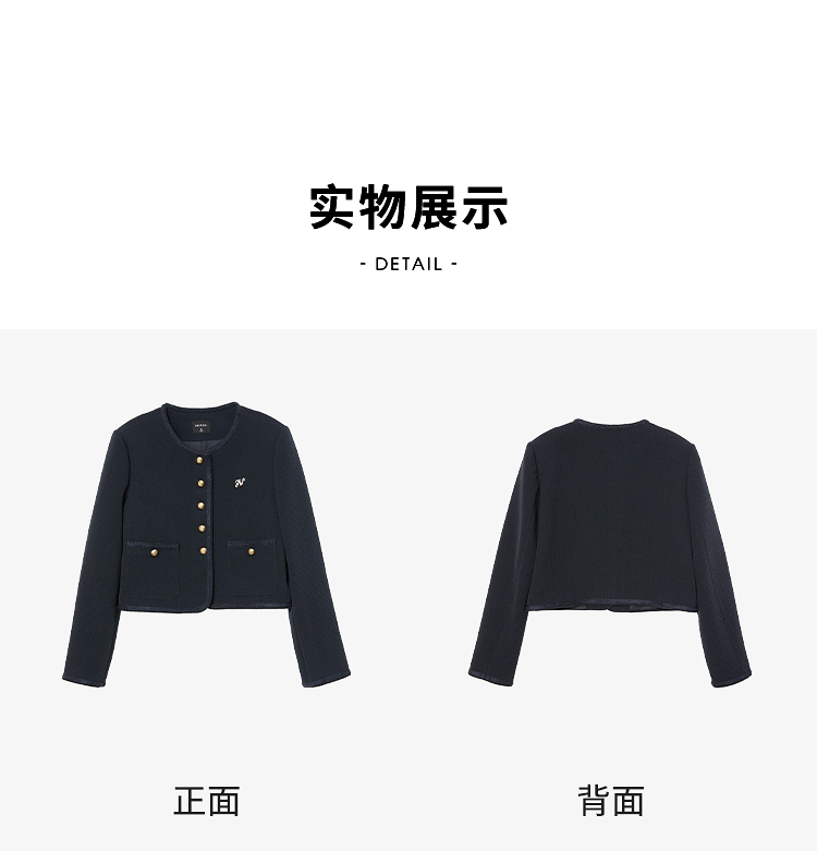 经典优雅小香风学院风短款外套女秋高级感徽章扣提花外套V3442507
