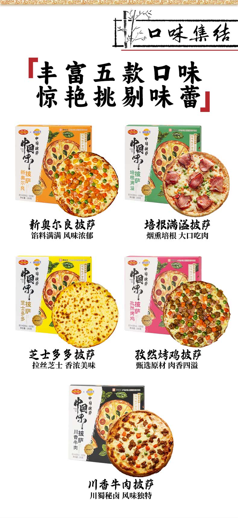 套餐4全家福组合:(孜然烤鸡披萨1+新奥尔良披萨1+芝士多多披萨1+香肠狂欢披萨1+黑椒烤肉披萨1) 赠随机口味1盒