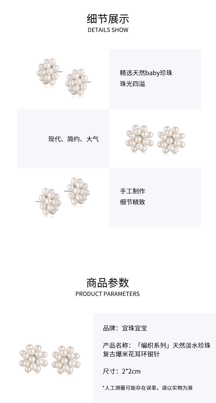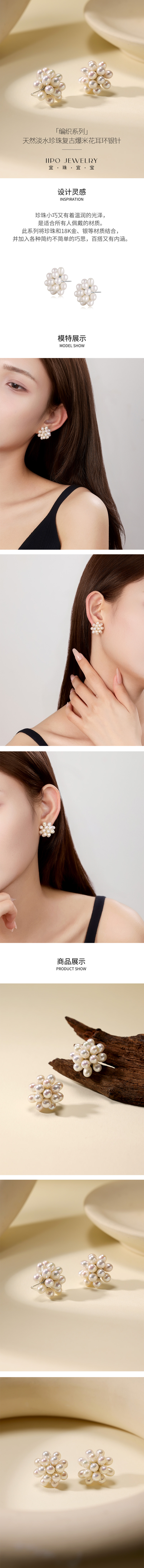 IIPO宜珠宜宝「编织系列」天然淡水珍珠复古爆米花耳环银针(礼盒装)