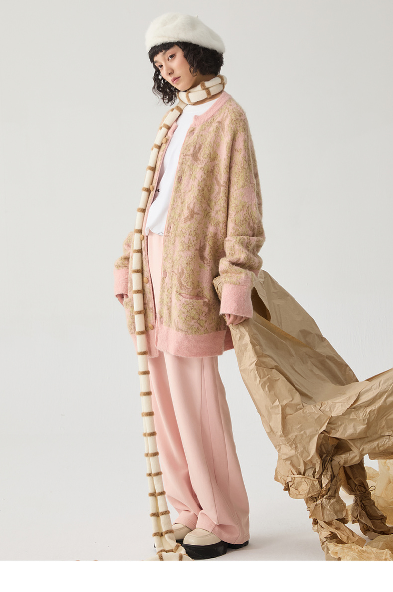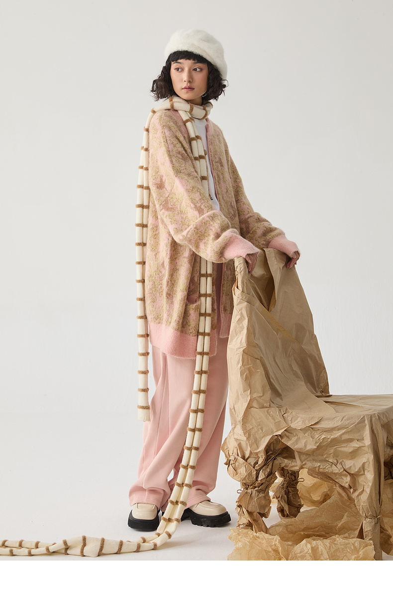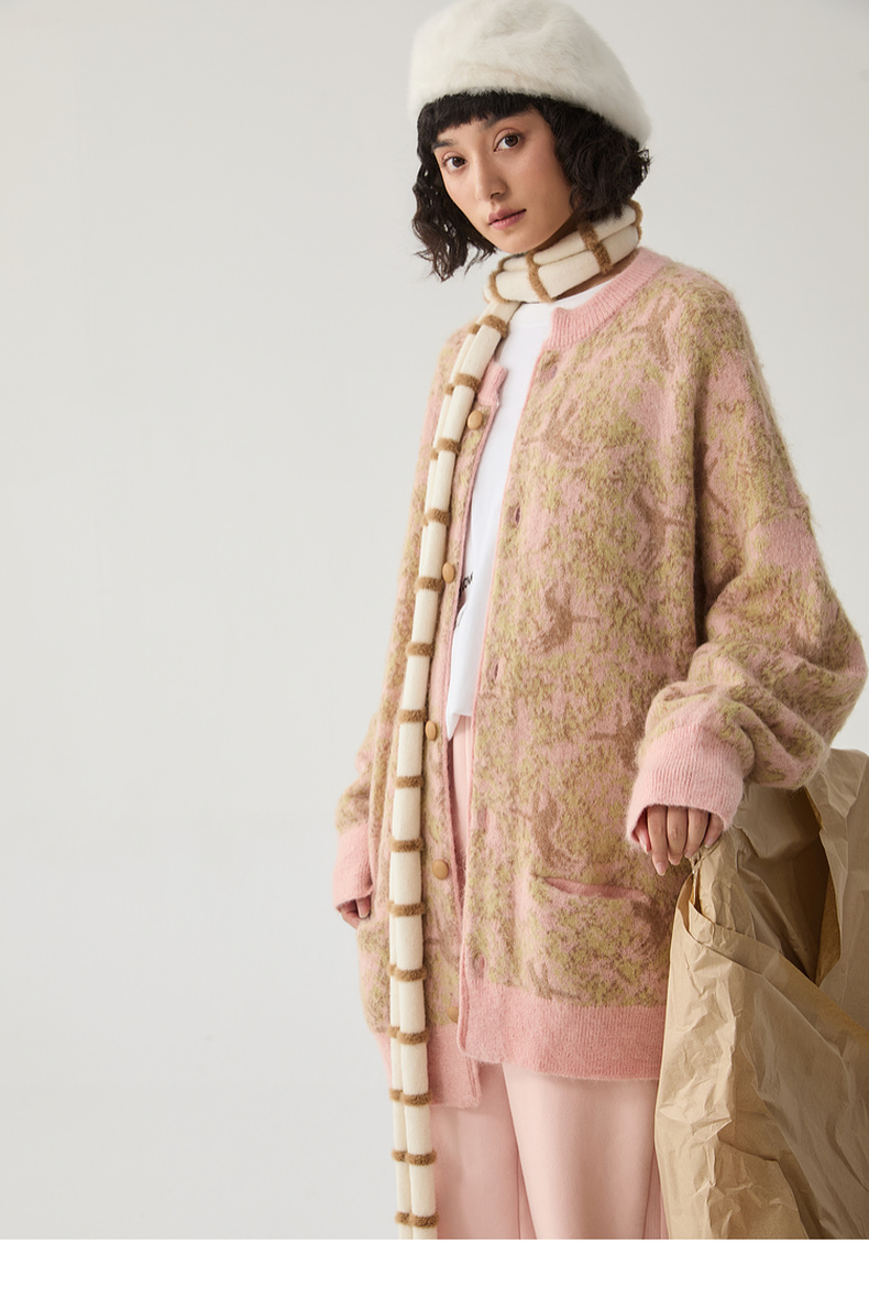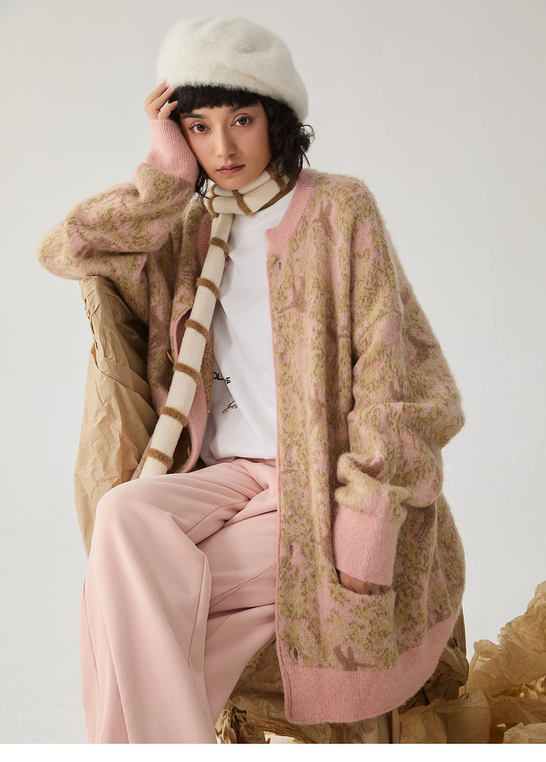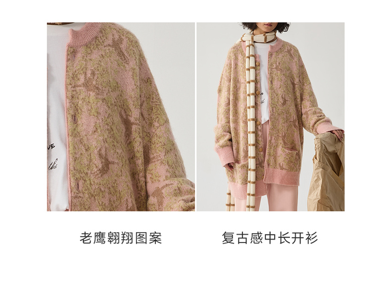 谜底针织开衫女2024冬季新品复古风提花中长款宽松毛衣244MZ1859