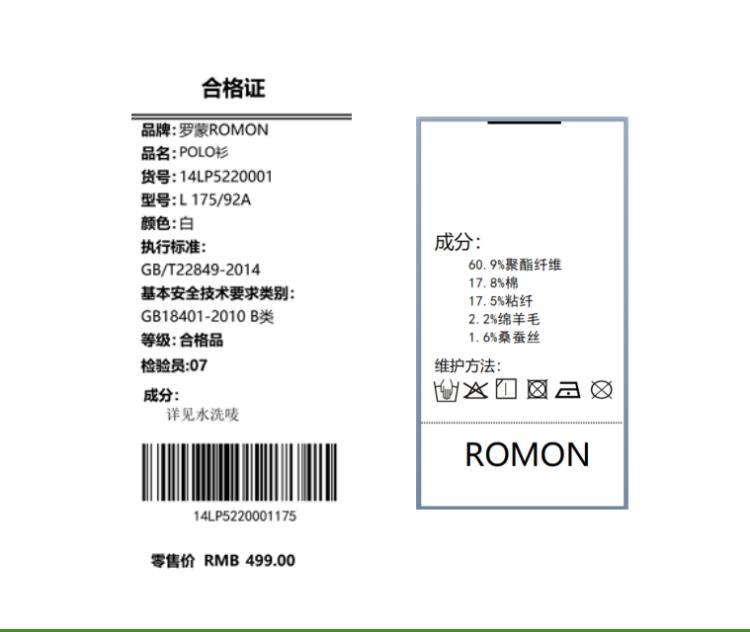 面料:60.9%聚酯纤维 17.8%棉 17.5%粘纤 2.2%绵羊毛 1.6%桑蚕丝