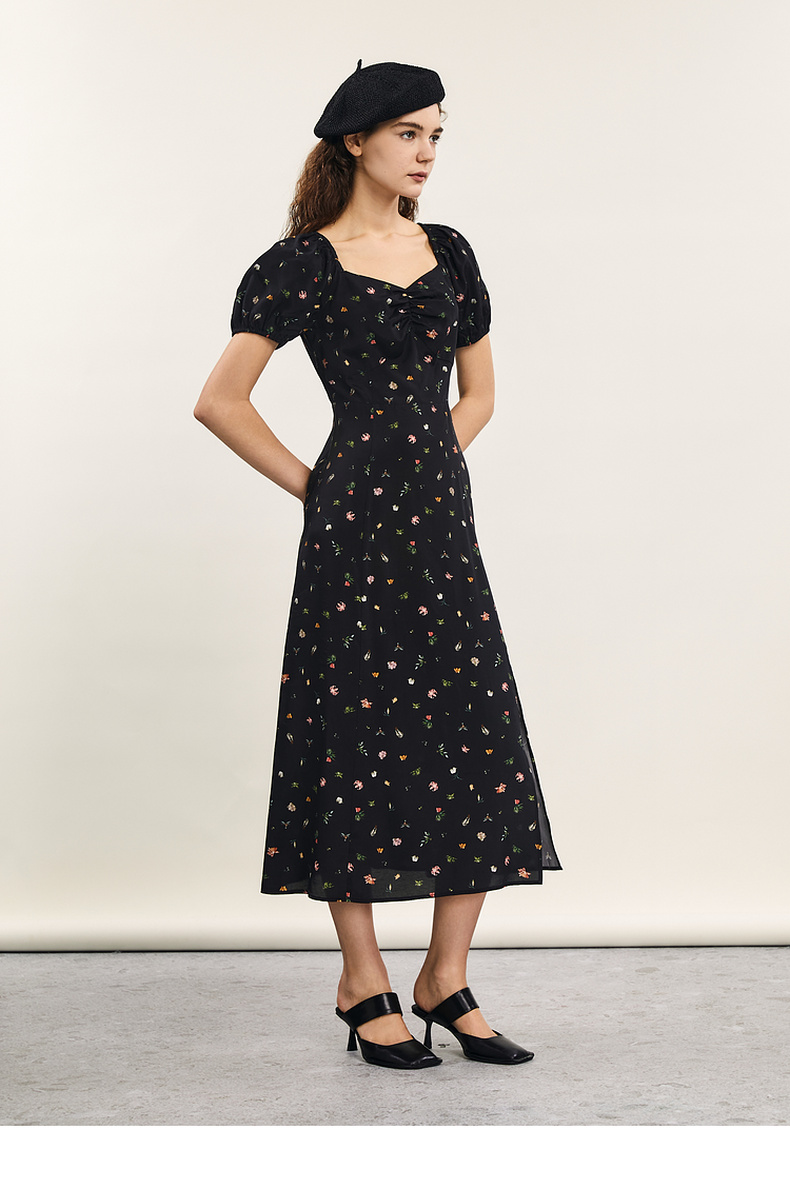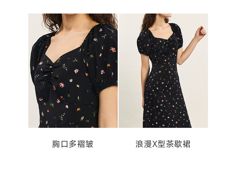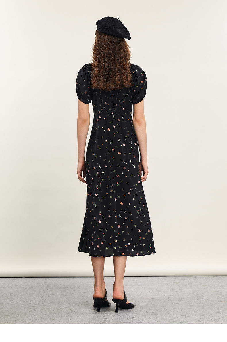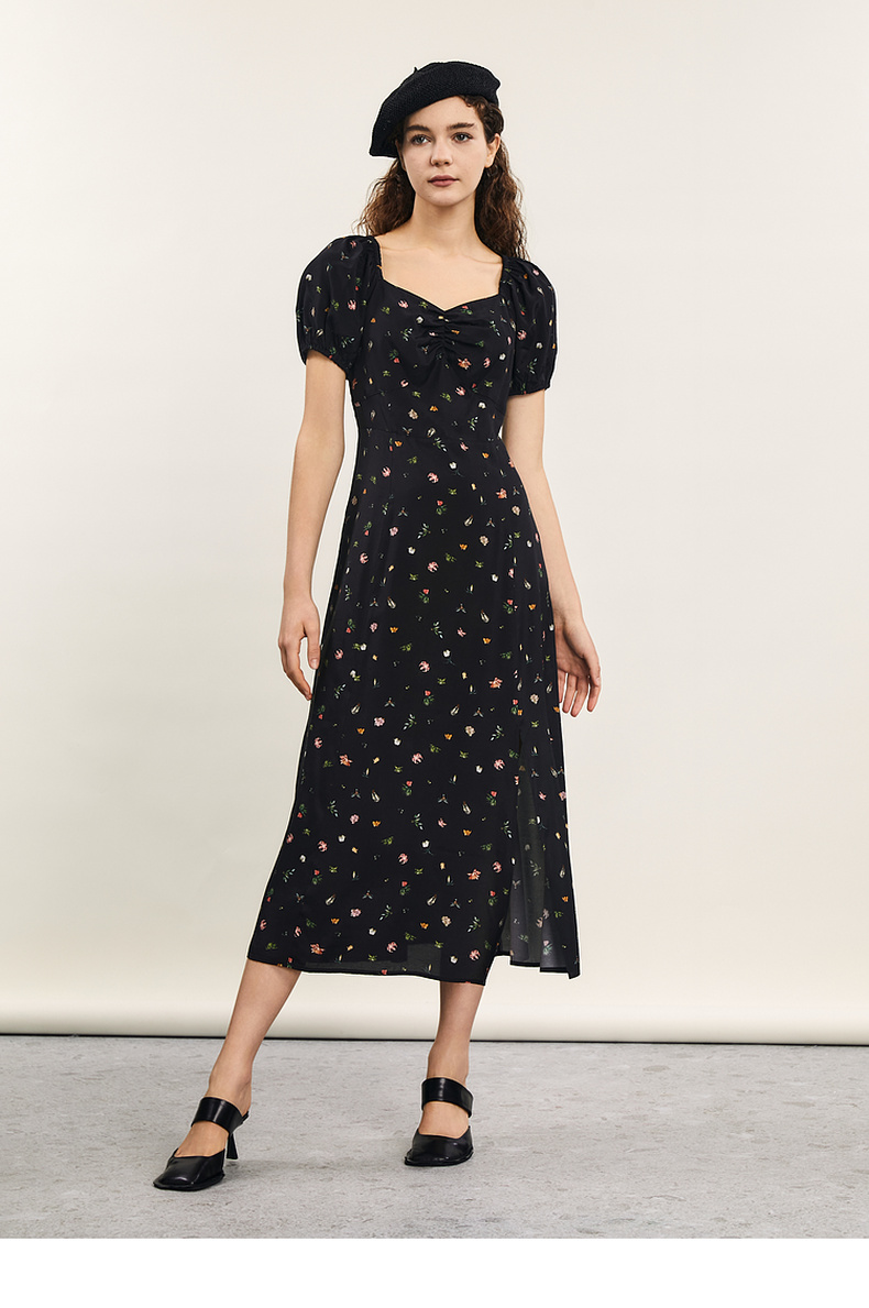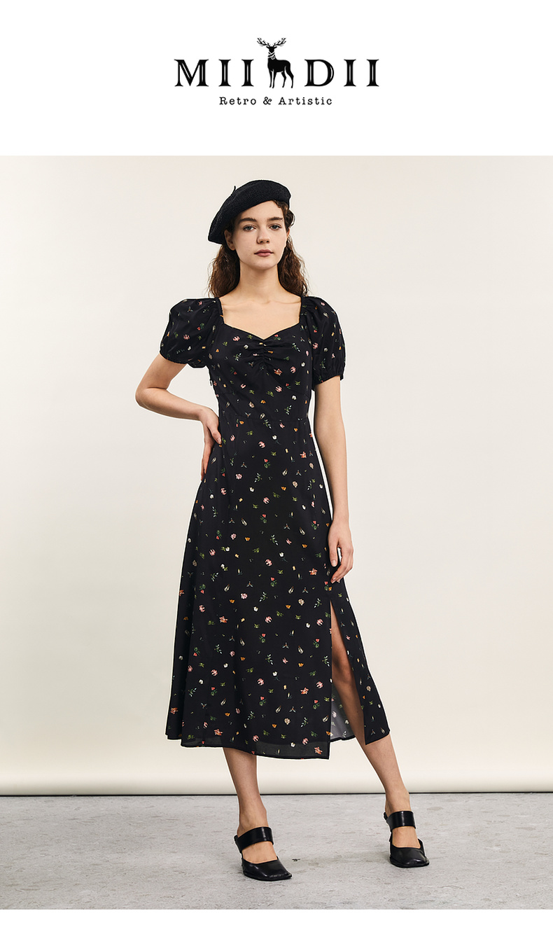 谜底碎花连衣裙短袖女2024夏季新品优雅浪漫前开叉长裙242ML0699