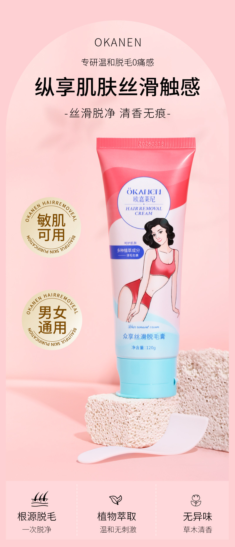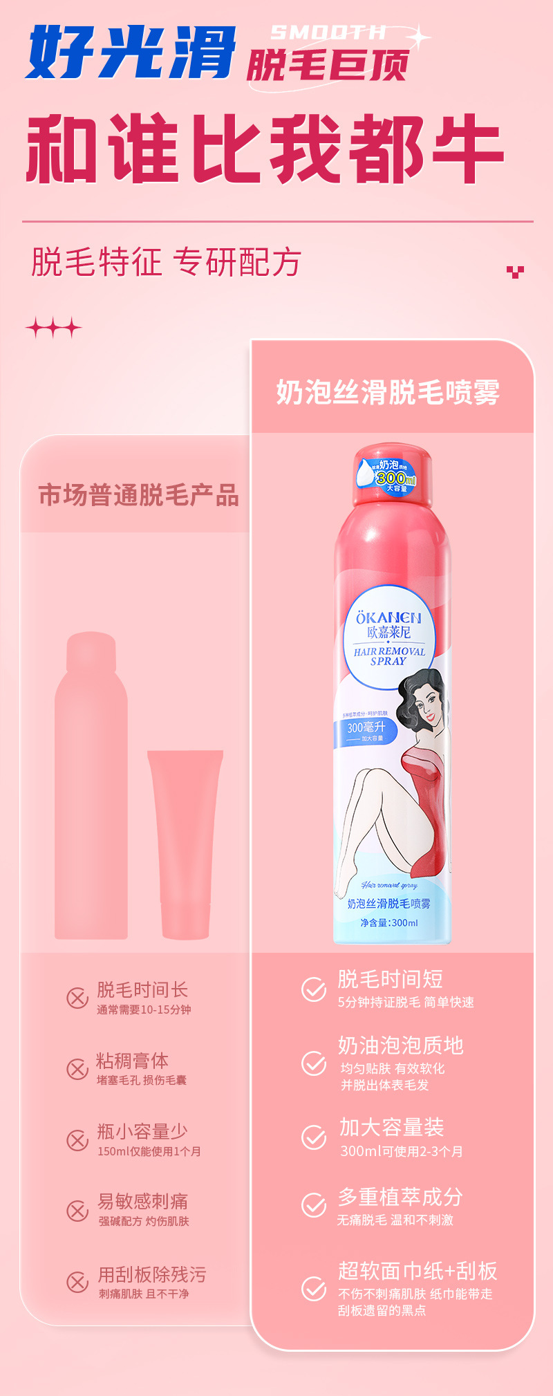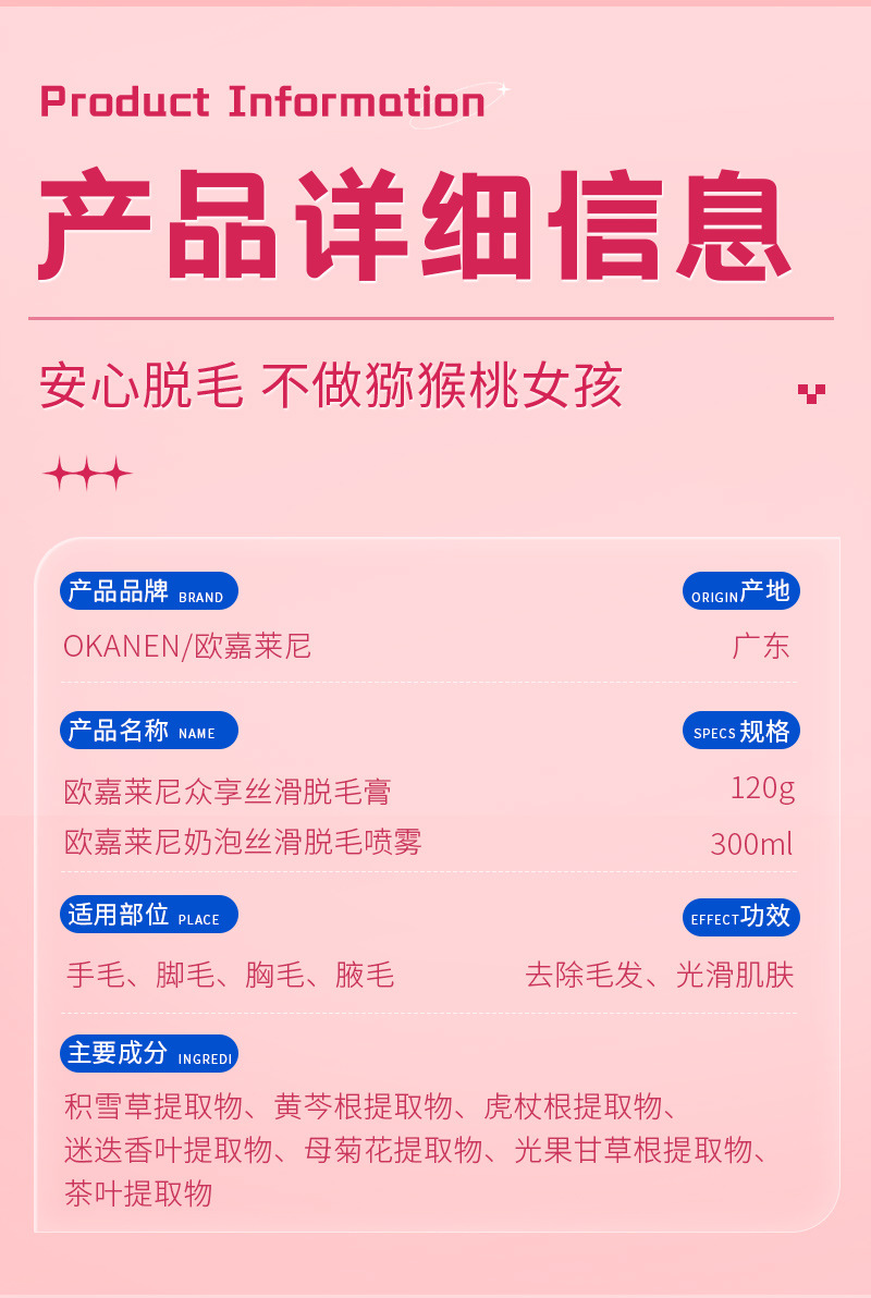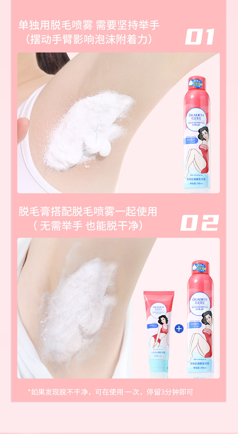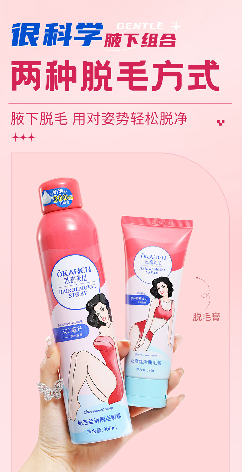 【赠刮板】欧嘉莱尼丝滑脱毛膏,无剌激刺激,安全温和。奶油脱毛喷雾和慕斯泡泡让您在家也能享受顶级美容服务。男女同款全身脱毛,不伤皮肤、无过敏反应,一毛不剩让您轻松拥有娇美的肌肤!