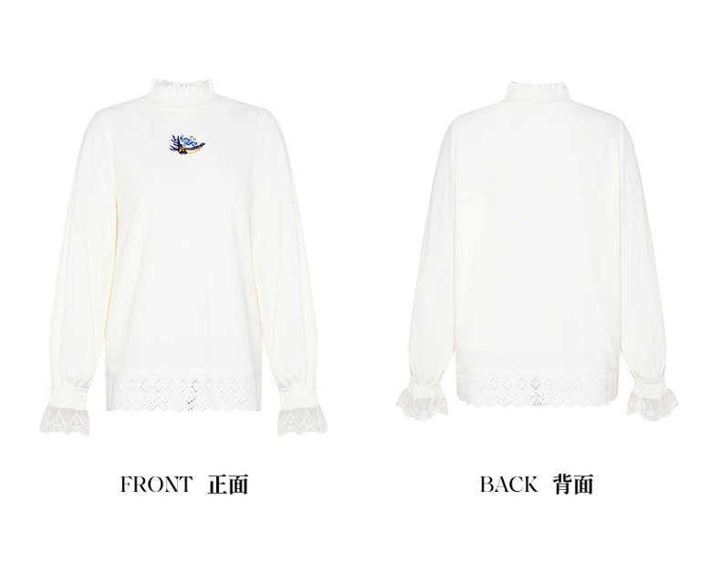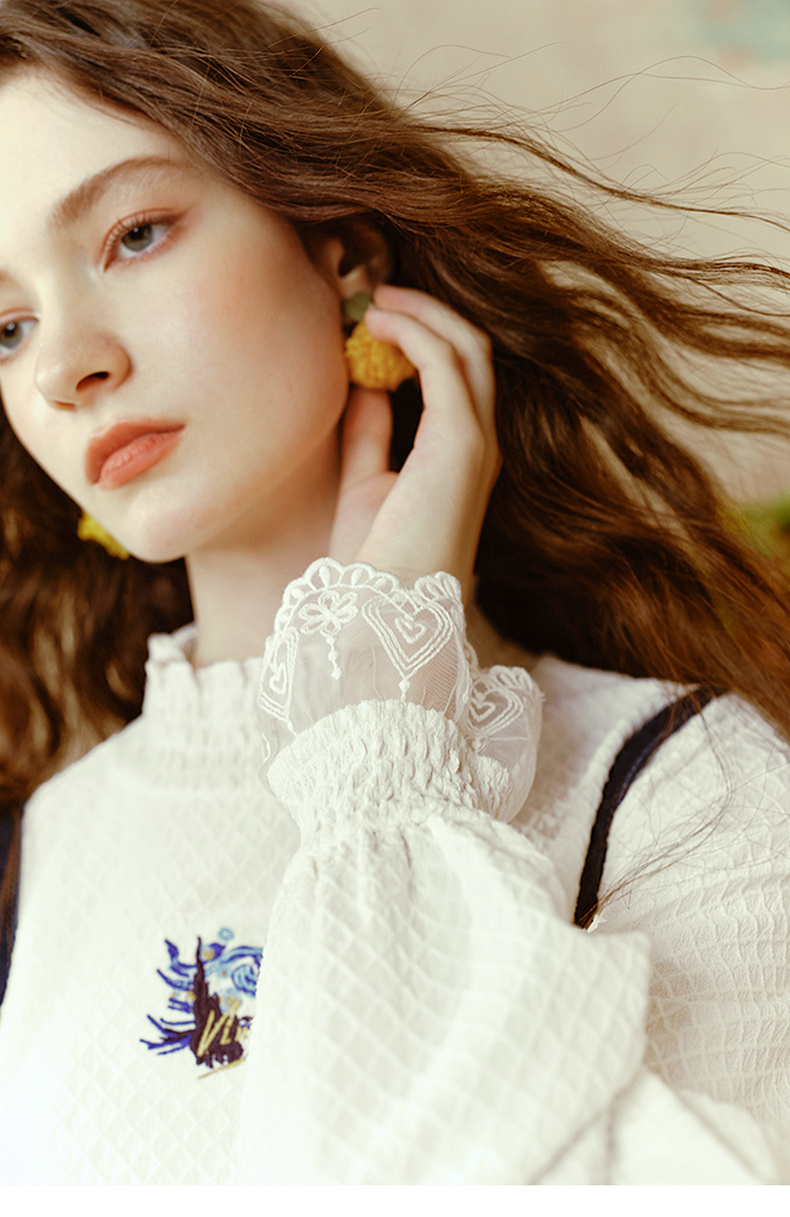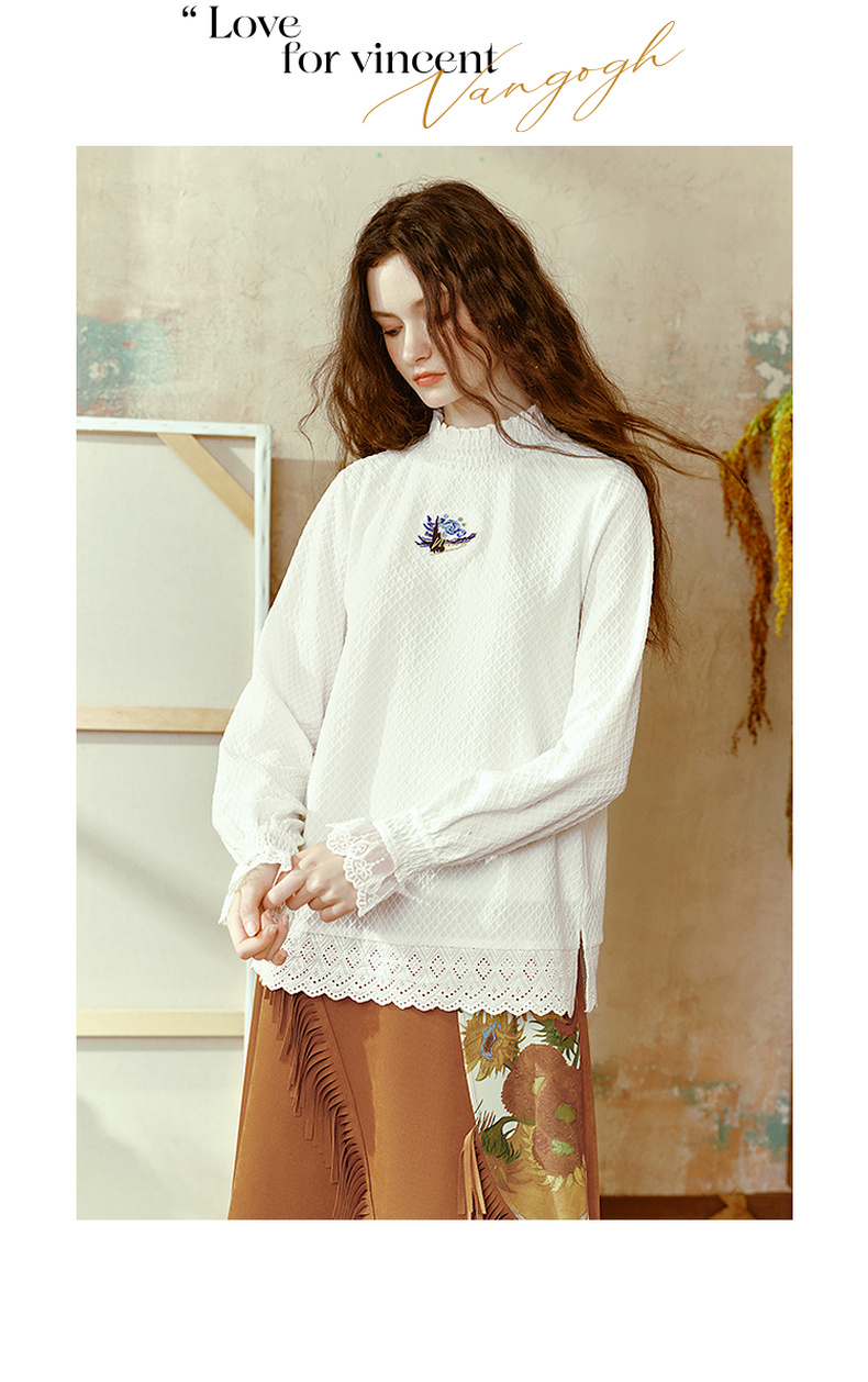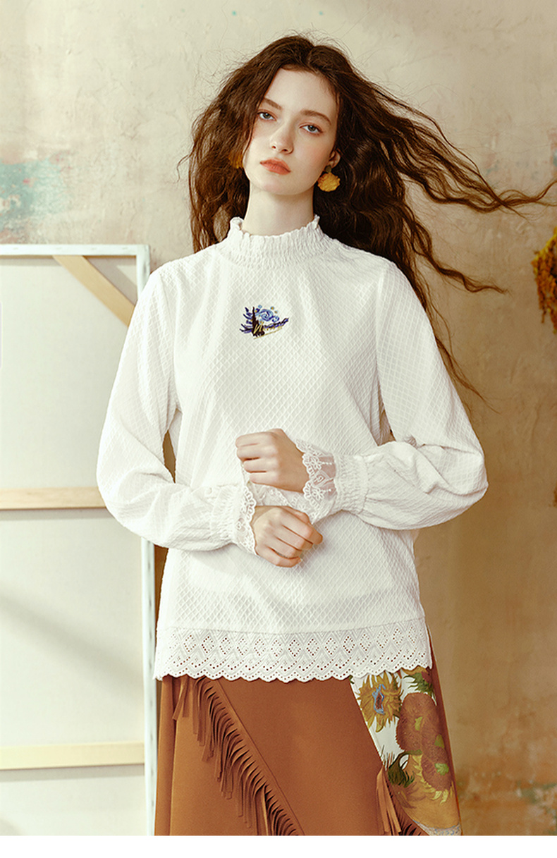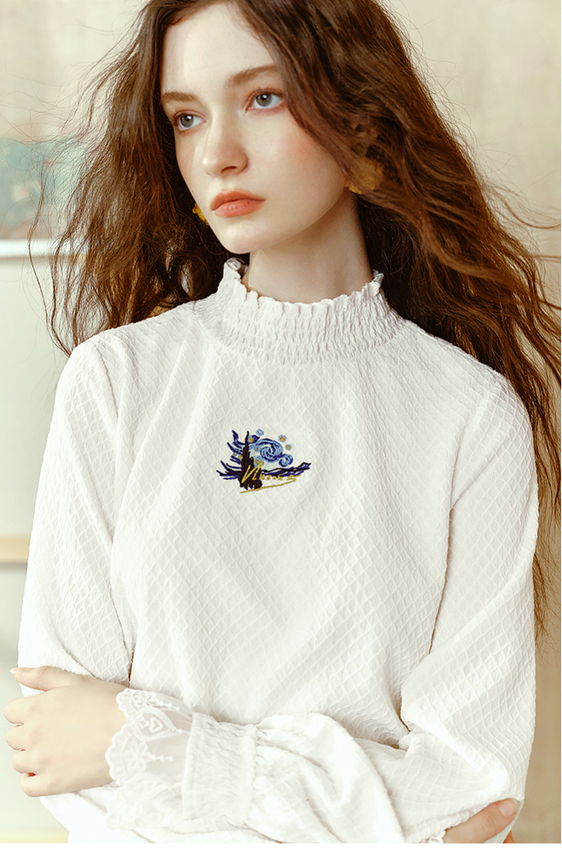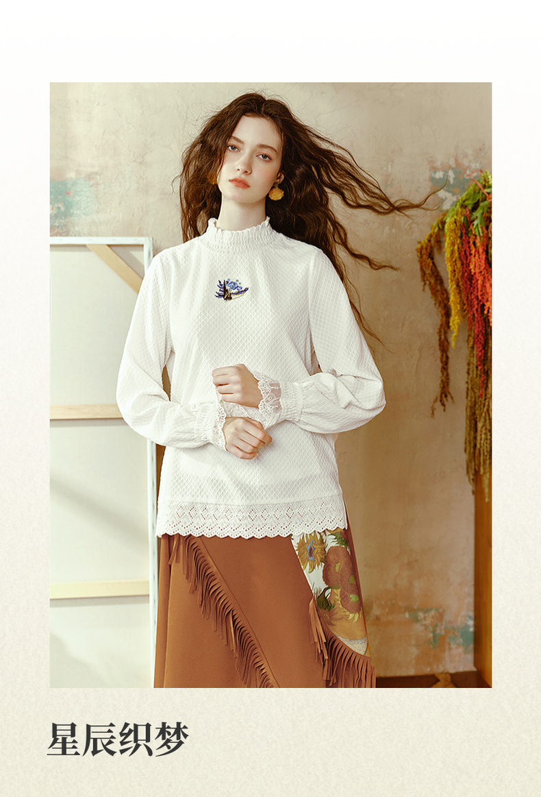 两三事梵高文艺星辰织梦2024冬季新款绣花蕾丝拼接袖口打底t恤女