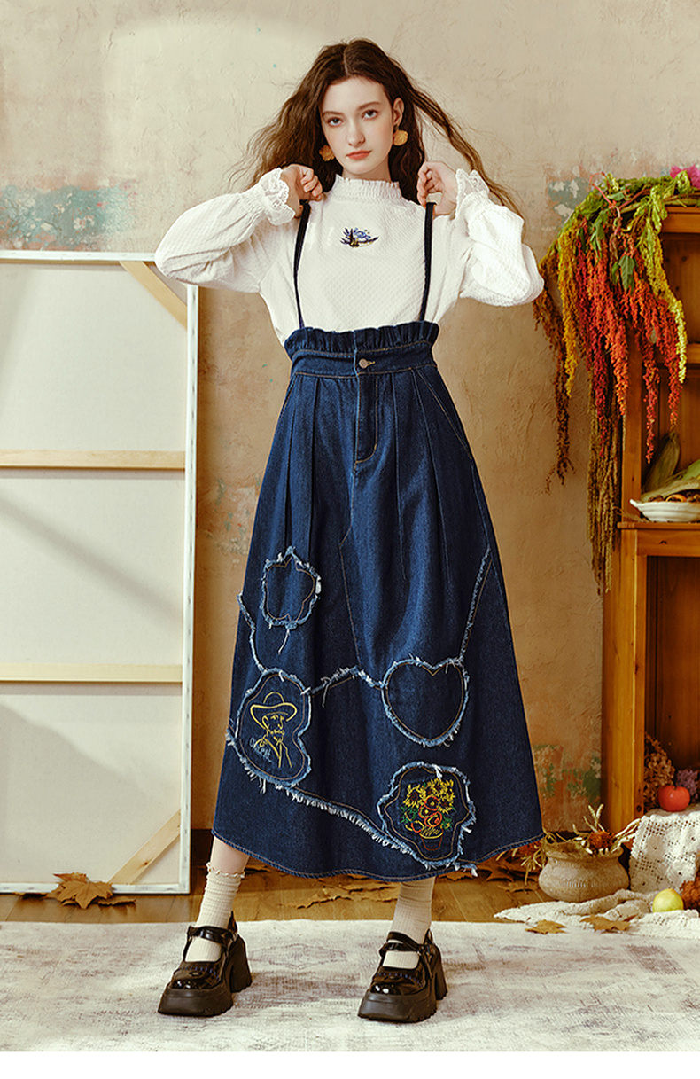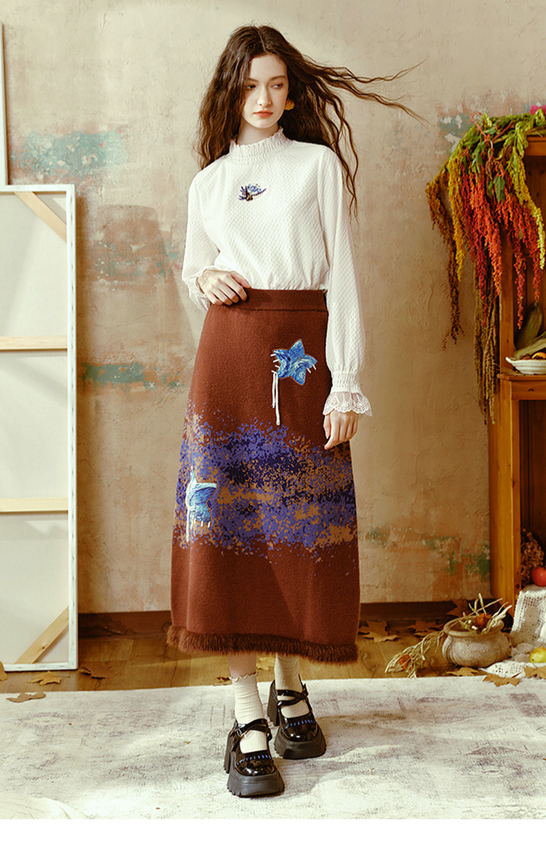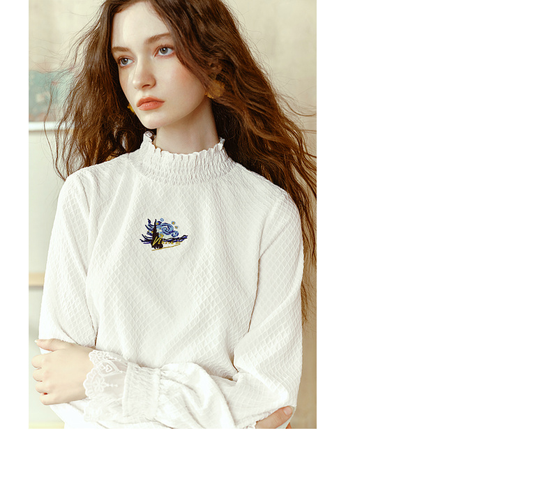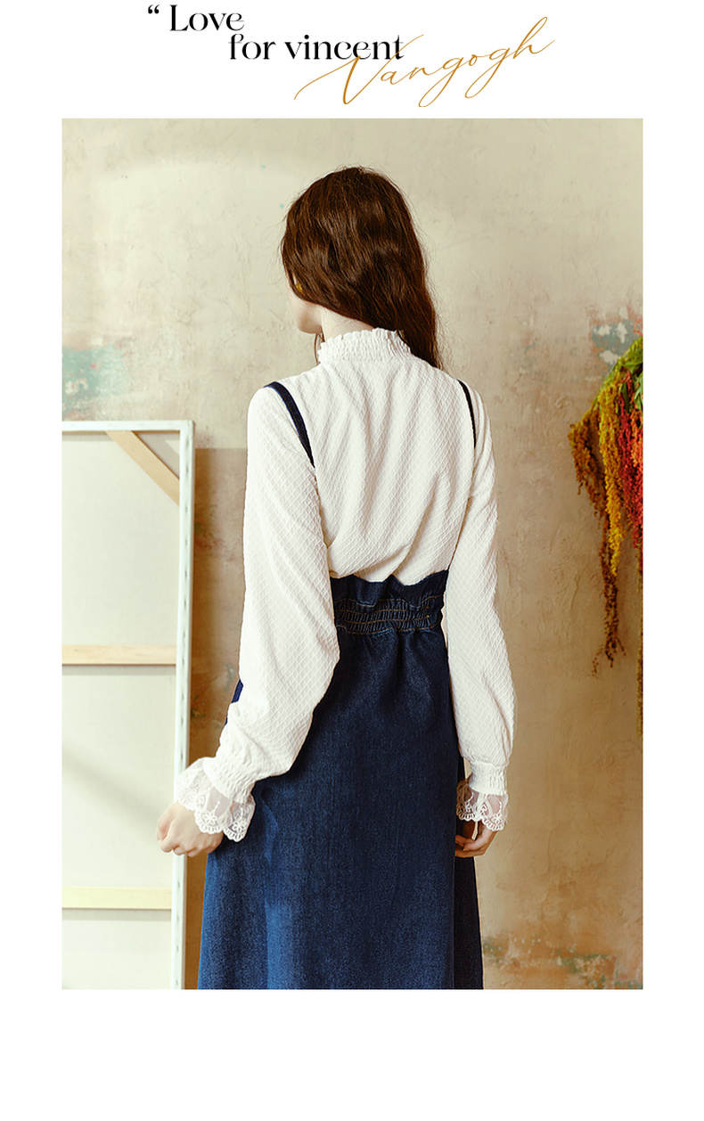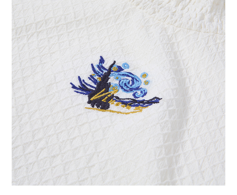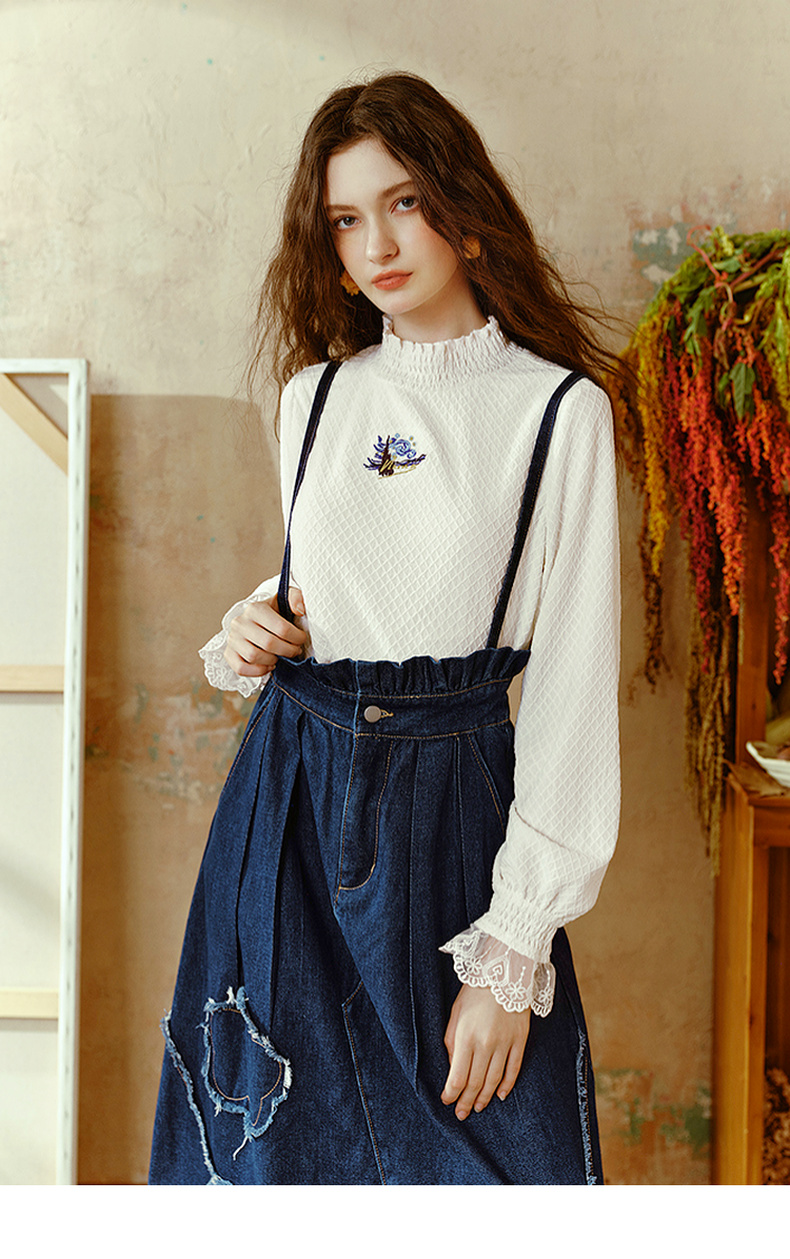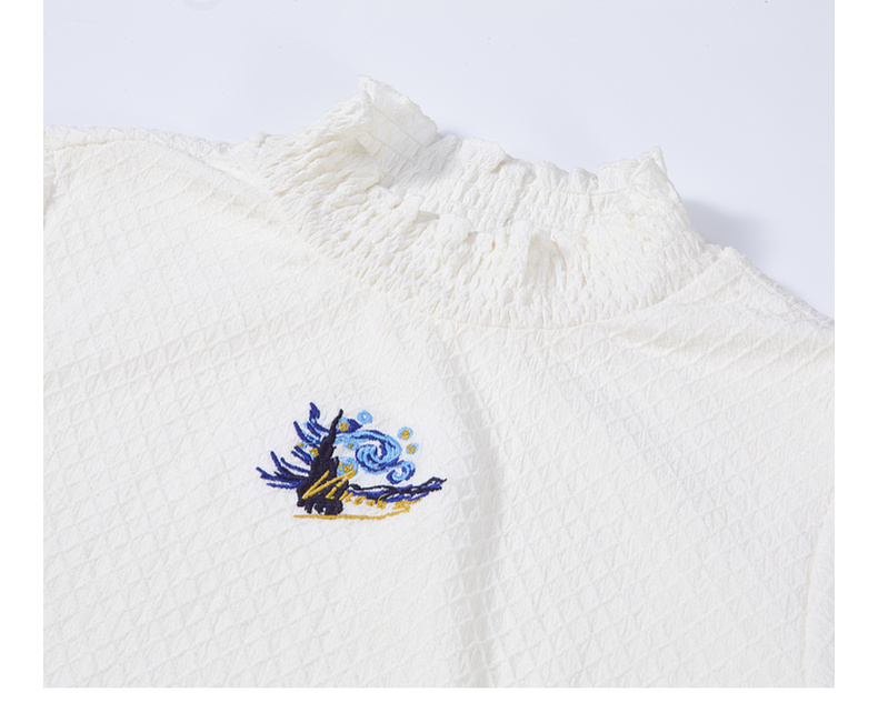 两三事梵高文艺星辰织梦2024冬季新款绣花蕾丝拼接袖口打底t恤女