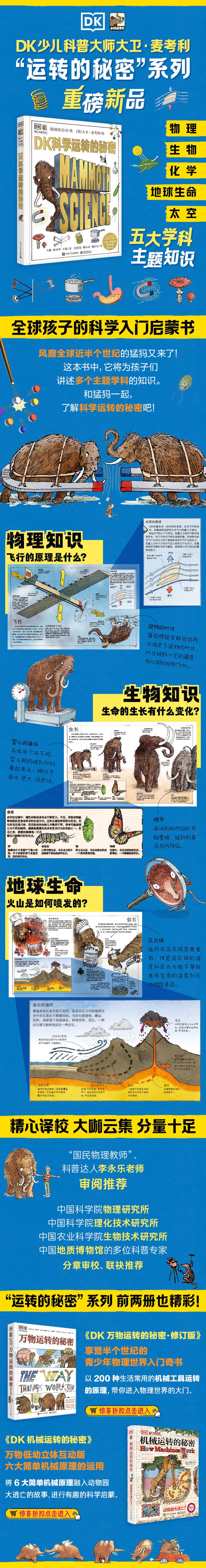 大卫麦考利“运转的秘密”系列重磅科普新品,万物运转和机械运转的秘密后续产品,万物三部曲的第三本——《科学运转的秘密》中文版上市!他笔下这个颇具标志性的猛犸,将走入学科知识海洋,为我们讲述物理、化学、地球生命、生物、太空等多个主题学科的好玩知识。 22 孩子都爱看的科学启蒙书 一本书5个方向,覆盖60多个核心科学主题内容,轻松了解科学运转的秘密:元素、原子、分子、密度、材料、化学反应、酸碱度、生物、细胞、植物、种子、消化、循环、肌眼睛、生长、进化、能量……每个知识点都由活泼可爱的猛犸带等