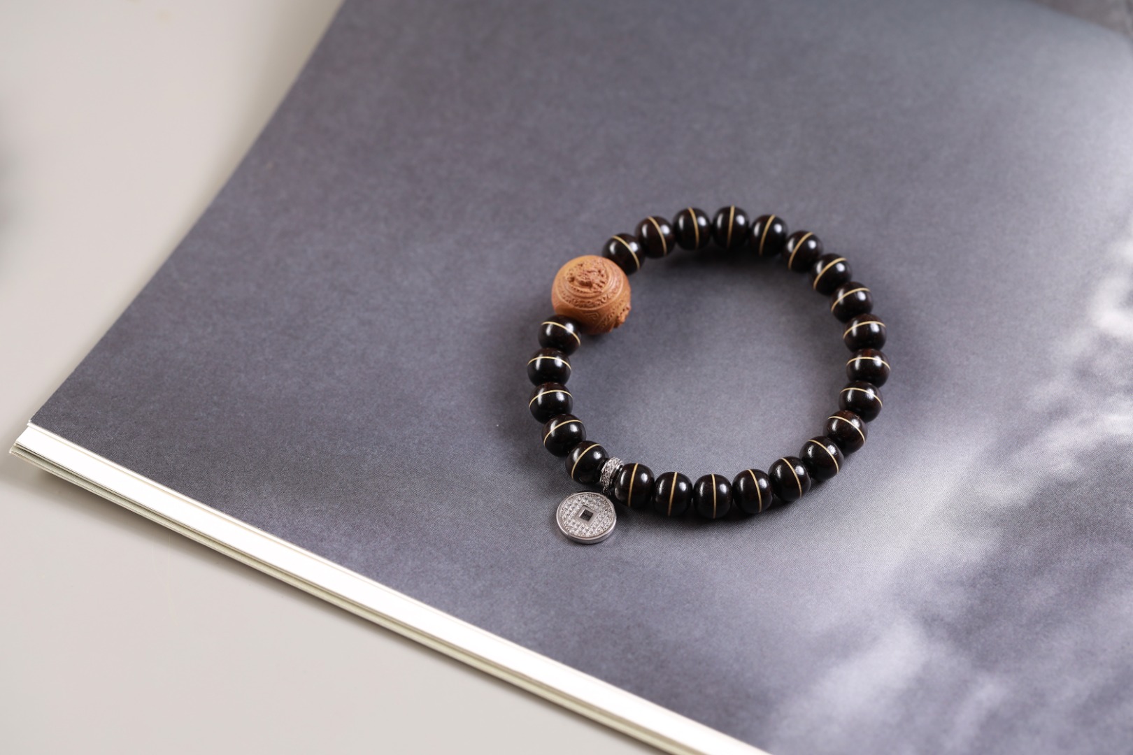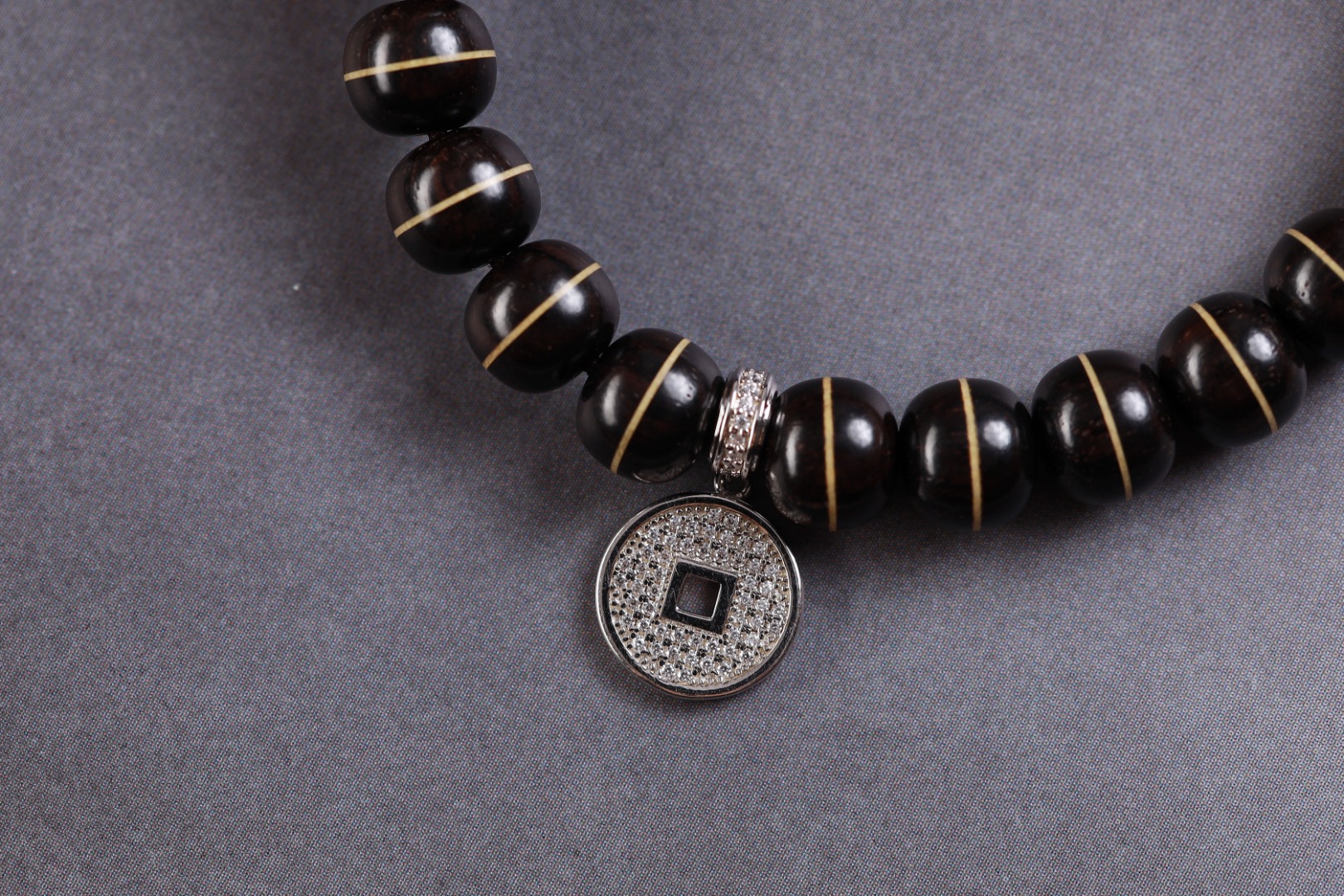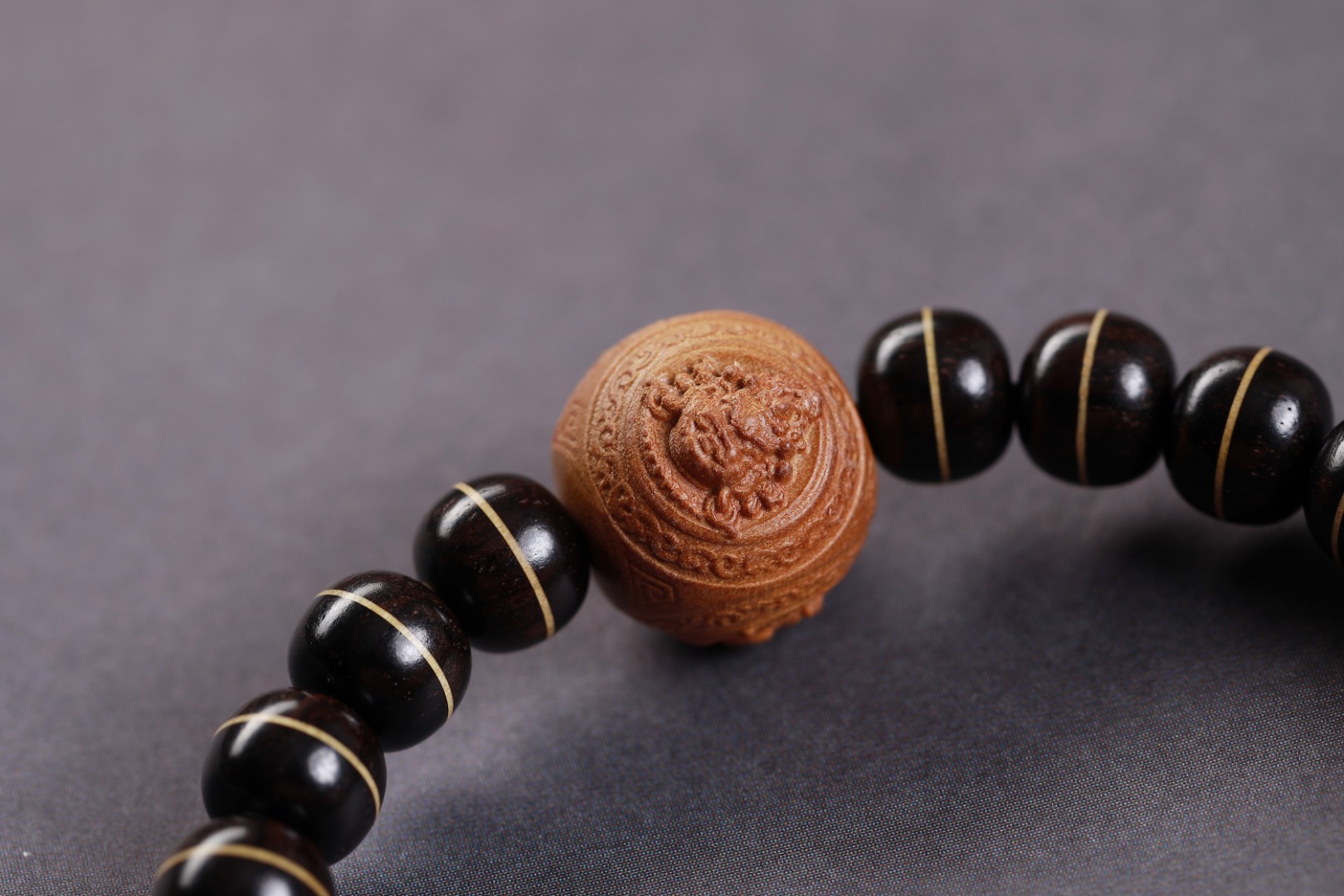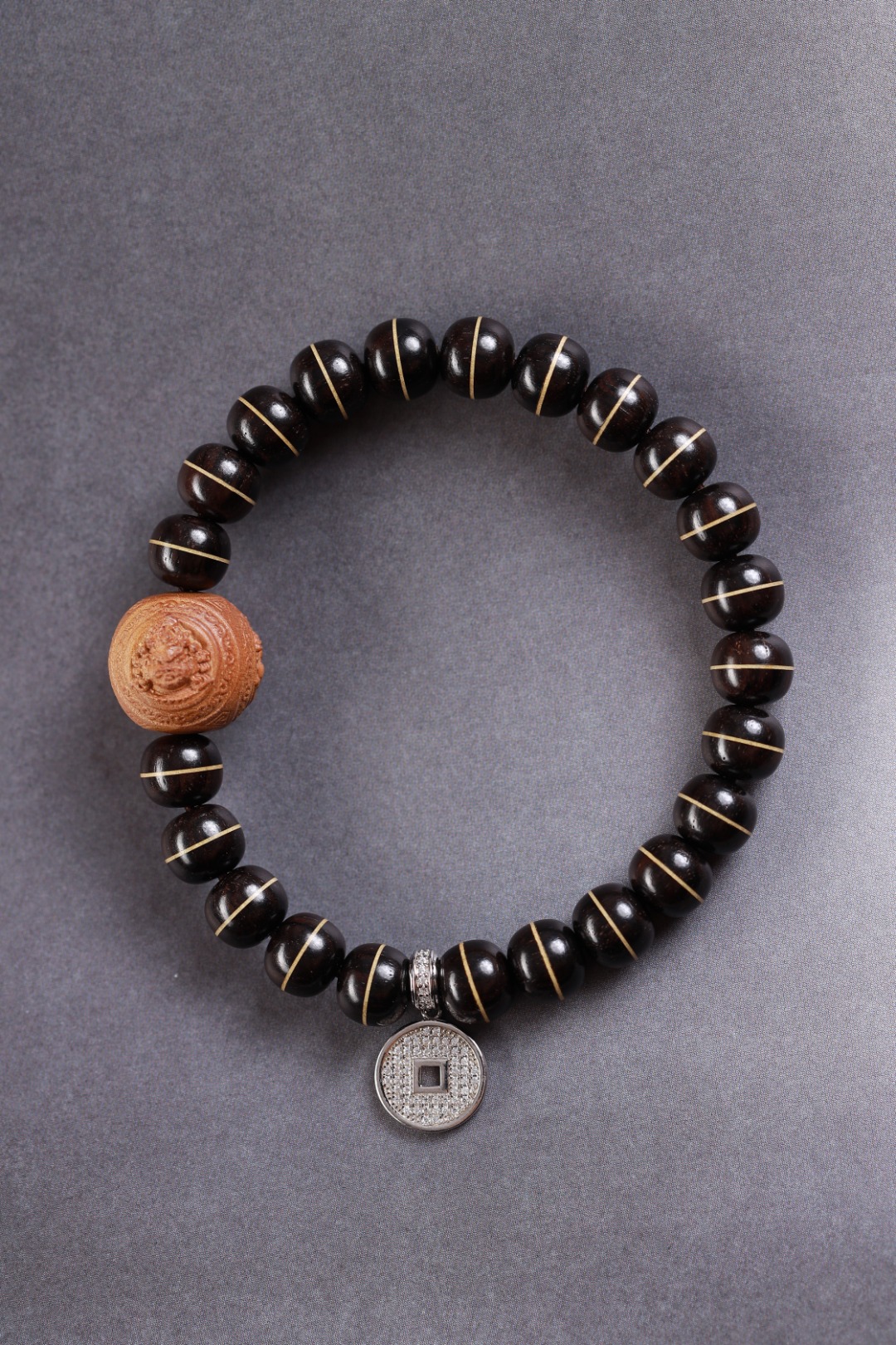 主珠以藏传一线药师珠为设计灵感,结合老山檀香六棱型而制,中间嵌入极薄工艺打造的“一线”,由鹿角和紫光檀重叠,整体线条笔直分明,光气十足,内部为传统直榫,银管镶嵌,饱满厚重,再现古朴株系的独特味道。药师珠为天珠旁系,象征诸佛众神护佑,吉祥如意,所求愿满。搭配老山檀香财神,是你的财富助力器。它散发出的香气将你与财富之间建立起一种特殊的联系,为你带来好运和机遇。它的存在让你成为财富的磁场,吸引着富贵与成功的能量。