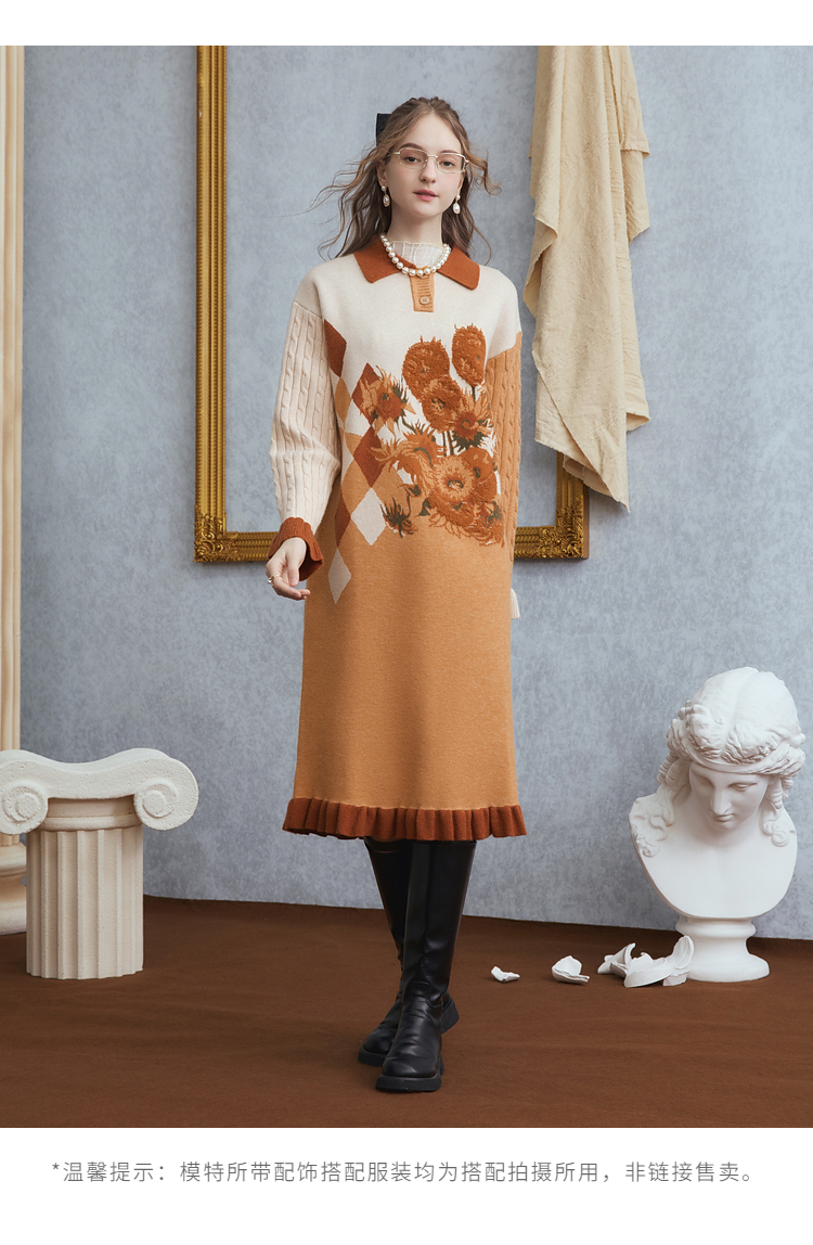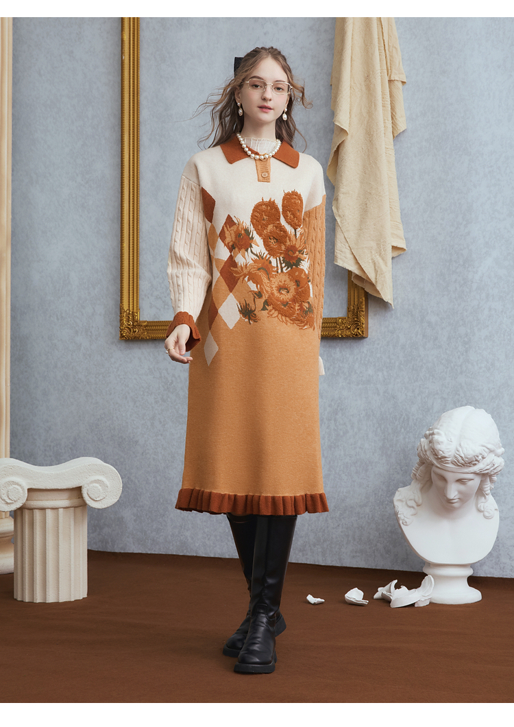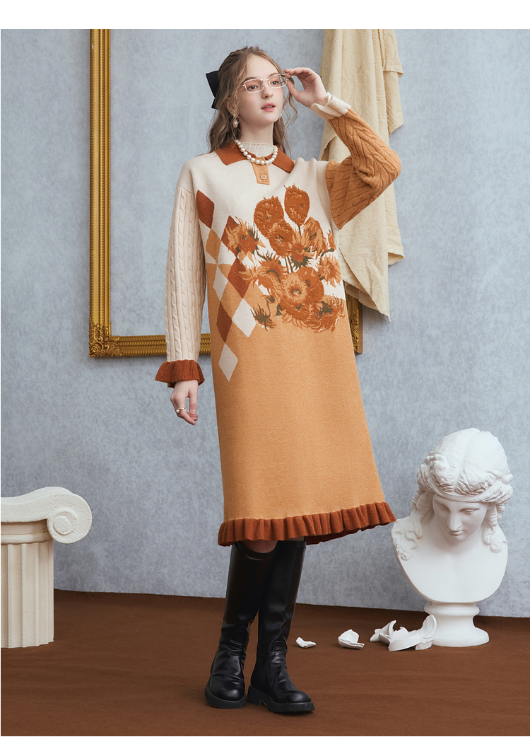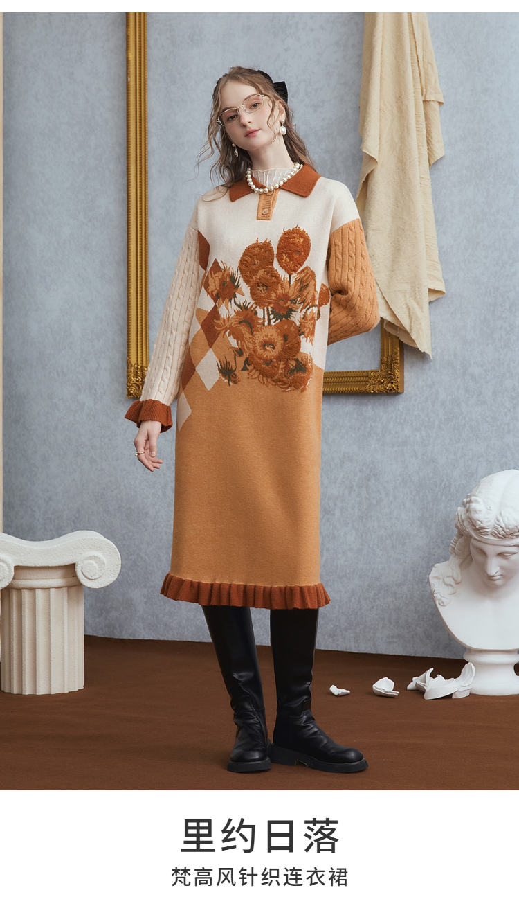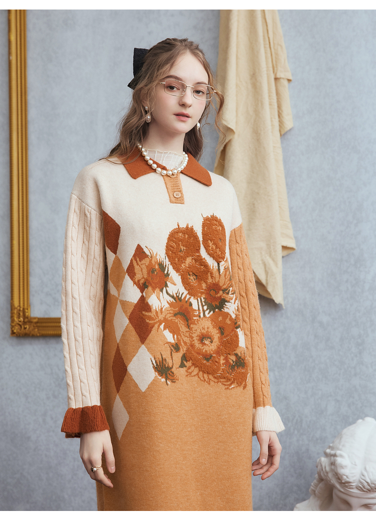 两三事梵高文艺 里约日落 2025冬季新款复古向日葵拼色针织连衣裙