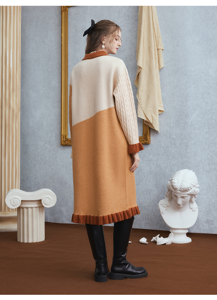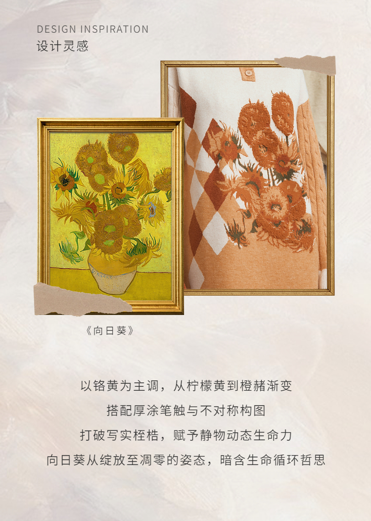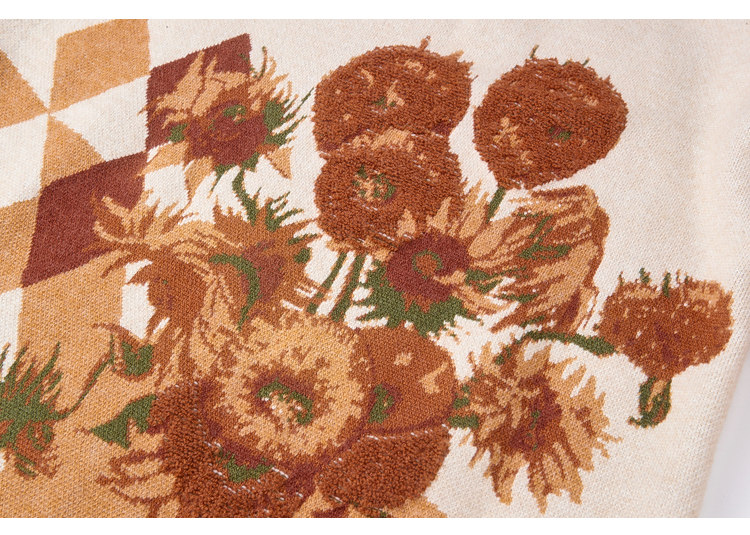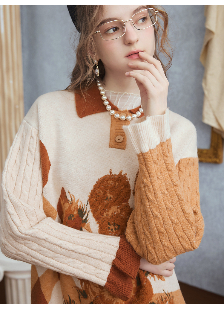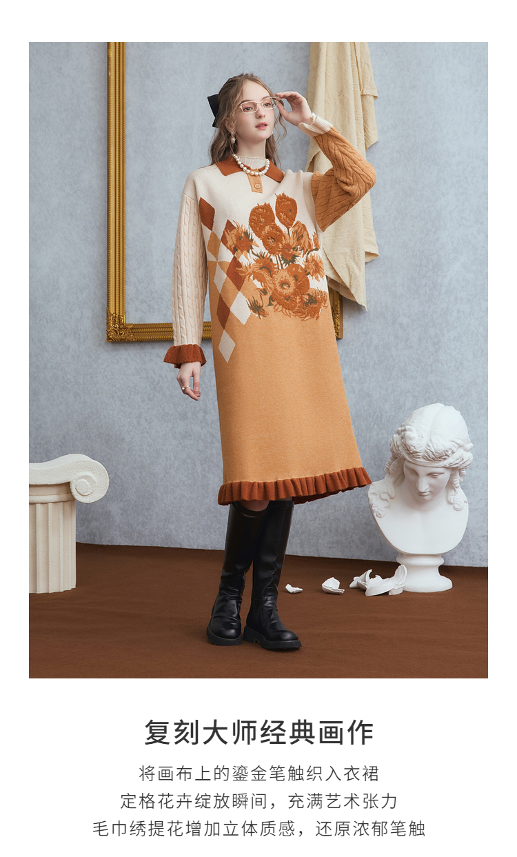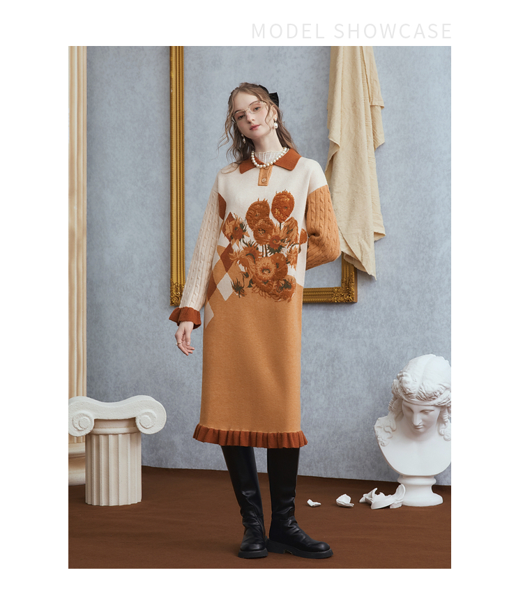 两三事梵高文艺 里约日落 2025冬季新款复古向日葵拼色针织连衣裙