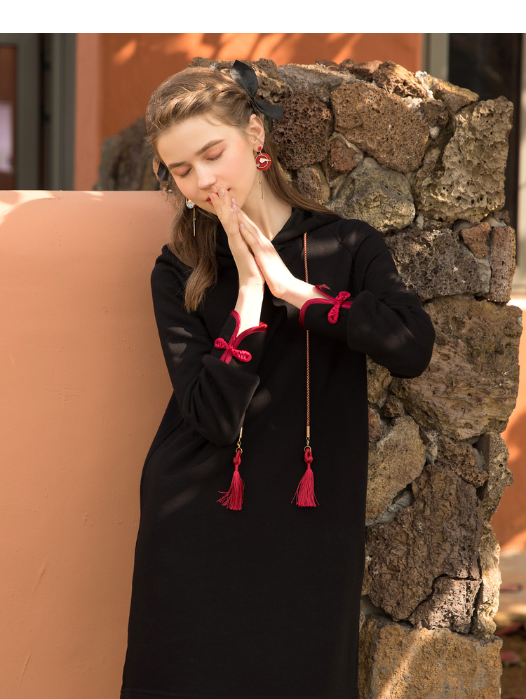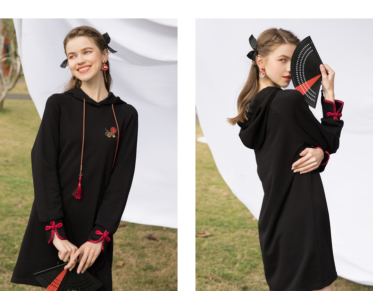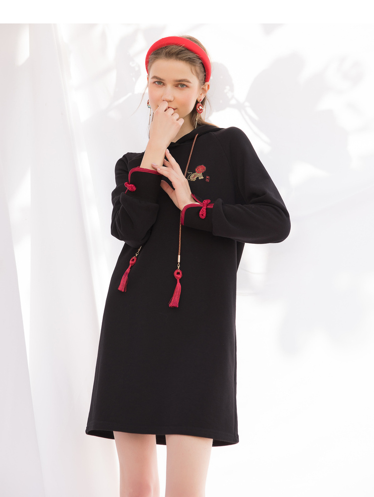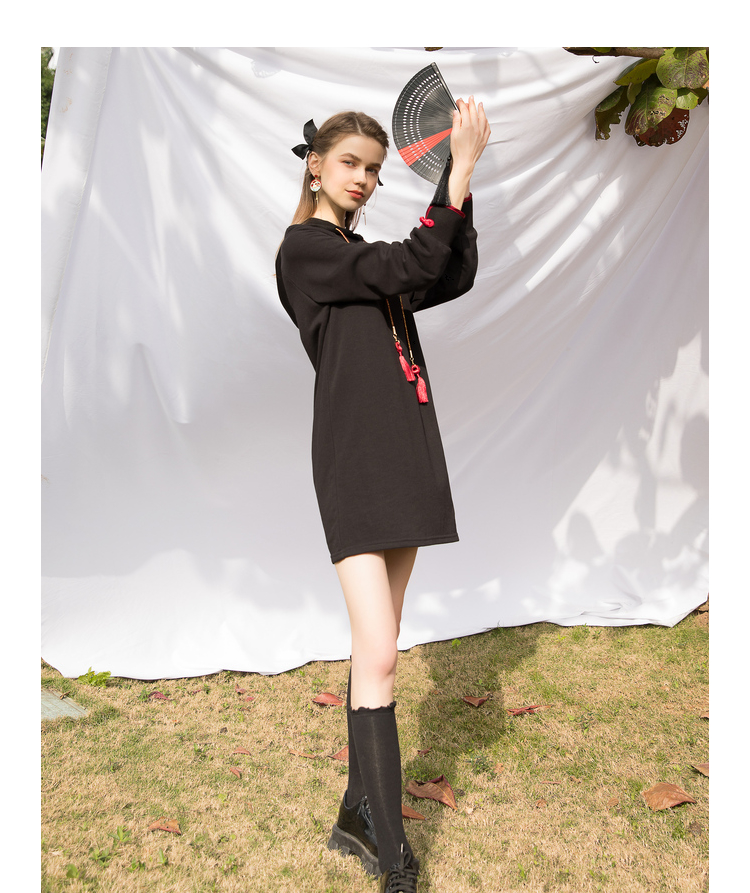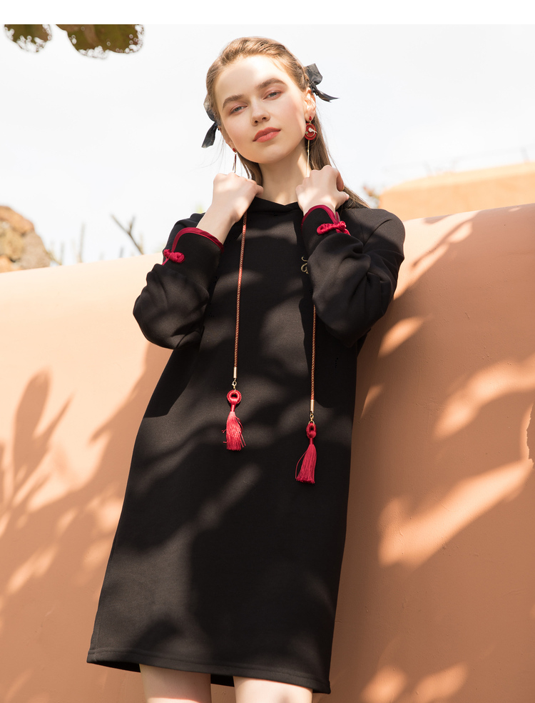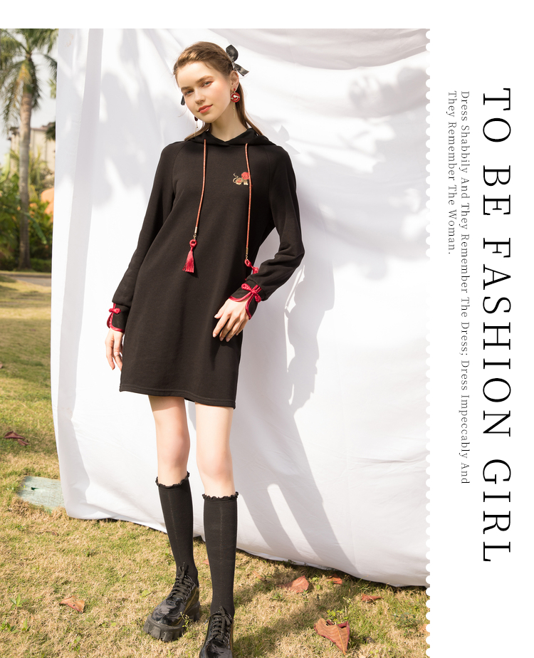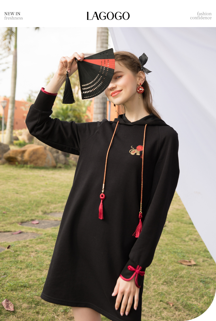 Lagogo2022新款连帽黑色插肩袖连衣裙女春季学院风LALL731C61