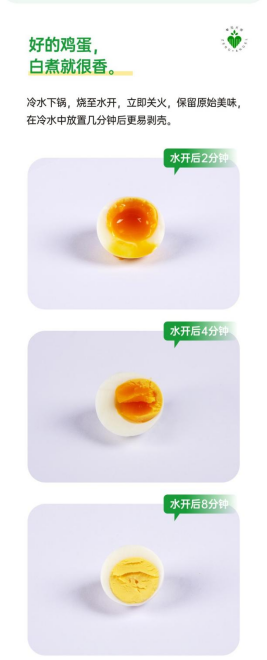 有些人不爱生食,可以根据自己的喜好,选择白煮,时间不同的效果不同。2分钟、4分钟、8分钟蛋黄会呈现不同的状态。