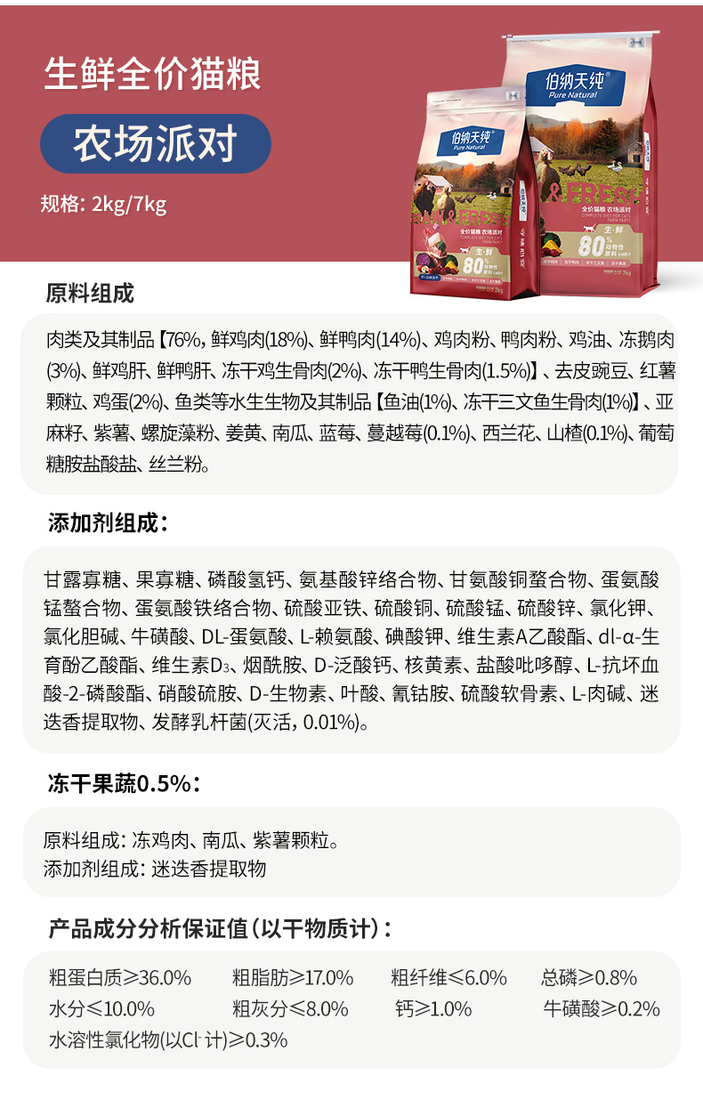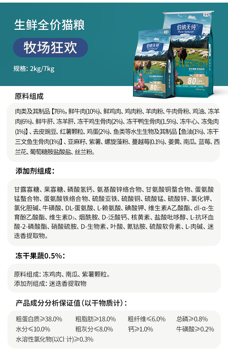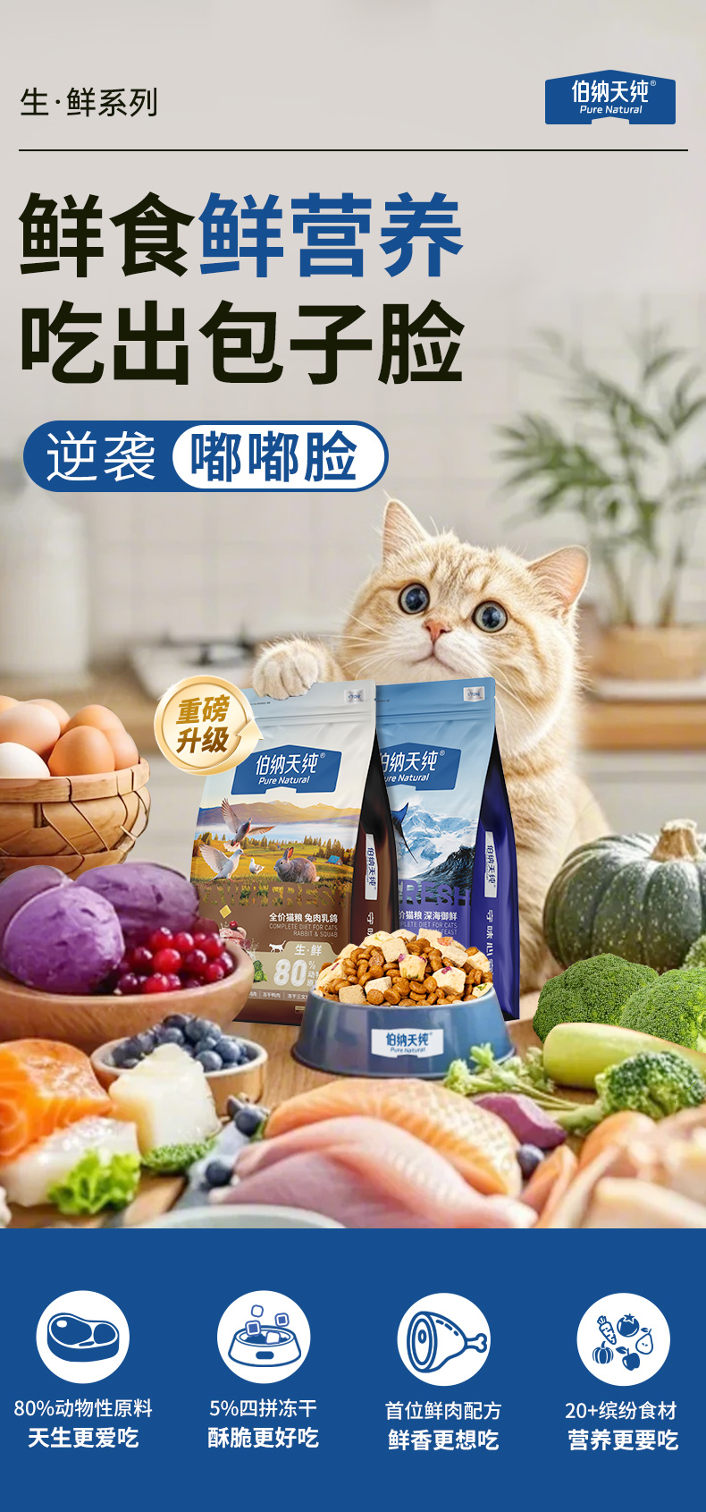 【升级款】伯纳天纯生鲜冻干猫粮7kg 全价全猫种通用天然粮美毛护肠胃泪痕管理