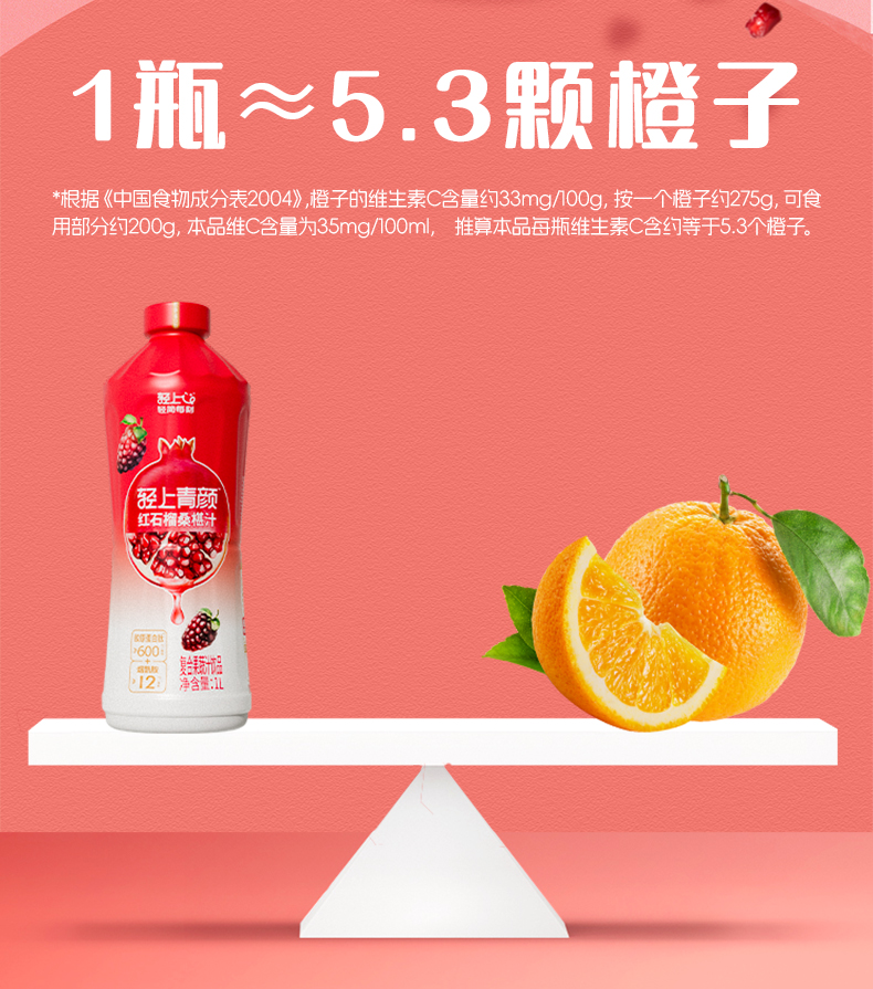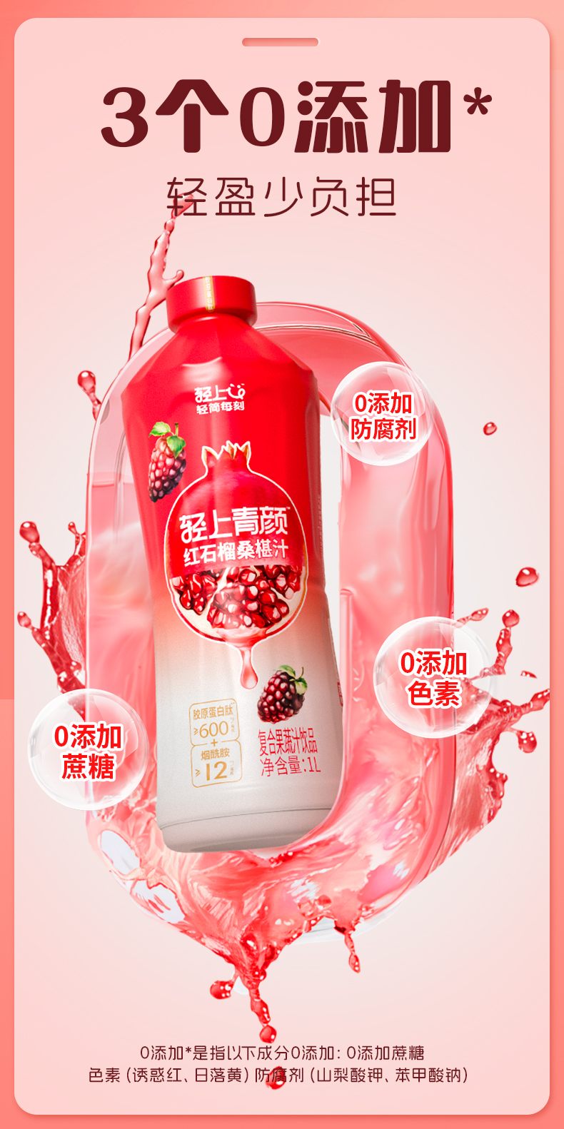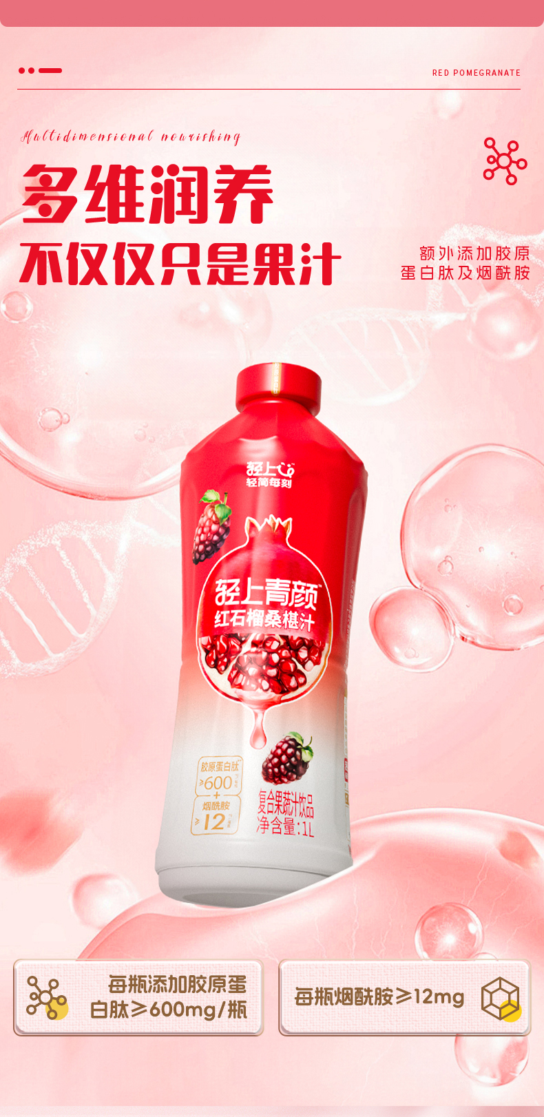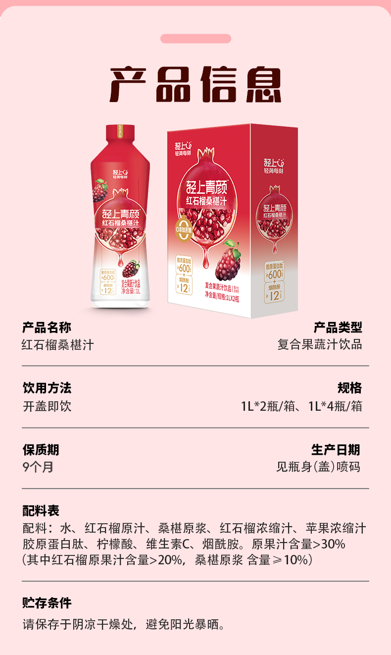 轻上 大瓶装红石榴桑葚汁家庭分享装特别添加烟酰胺和胶原蛋白肽