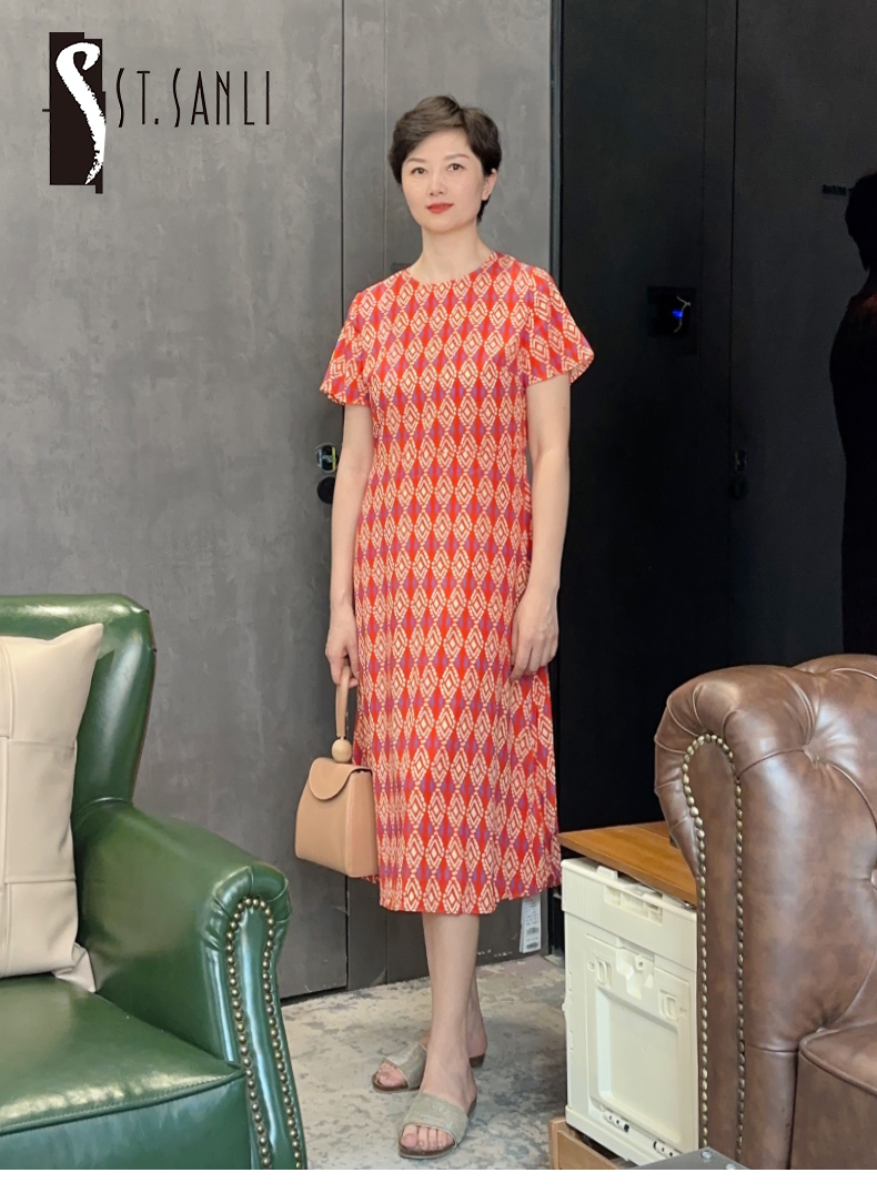 圣三利女装中长款圆领印花镂连衣裙SL1937105