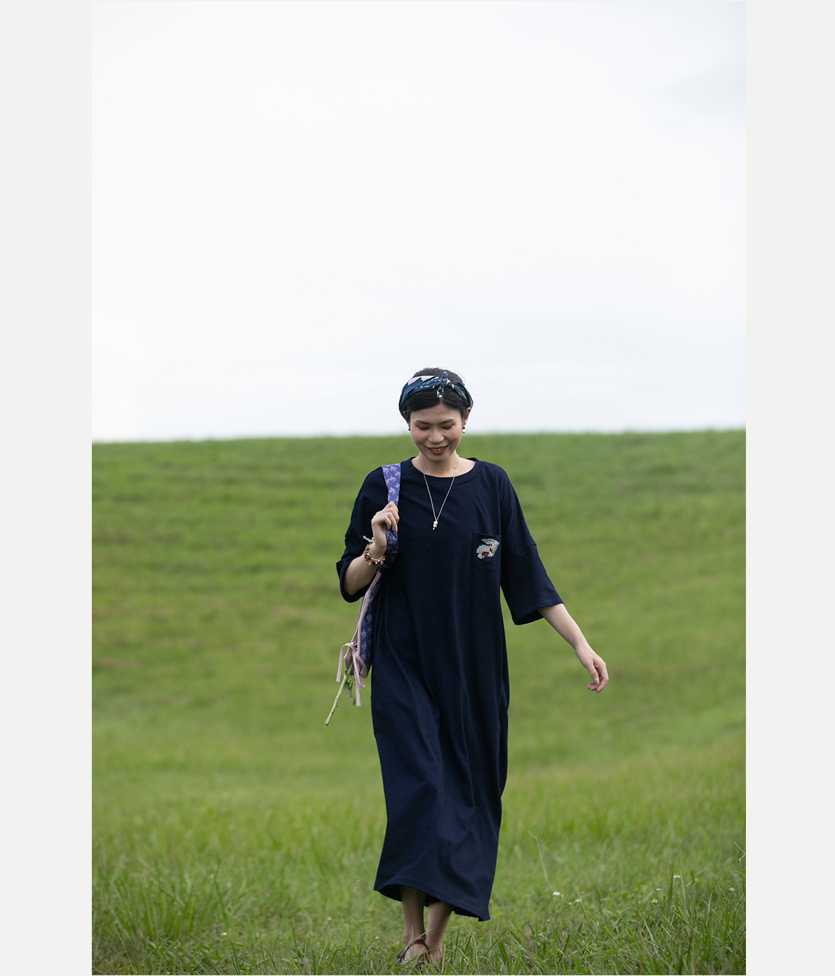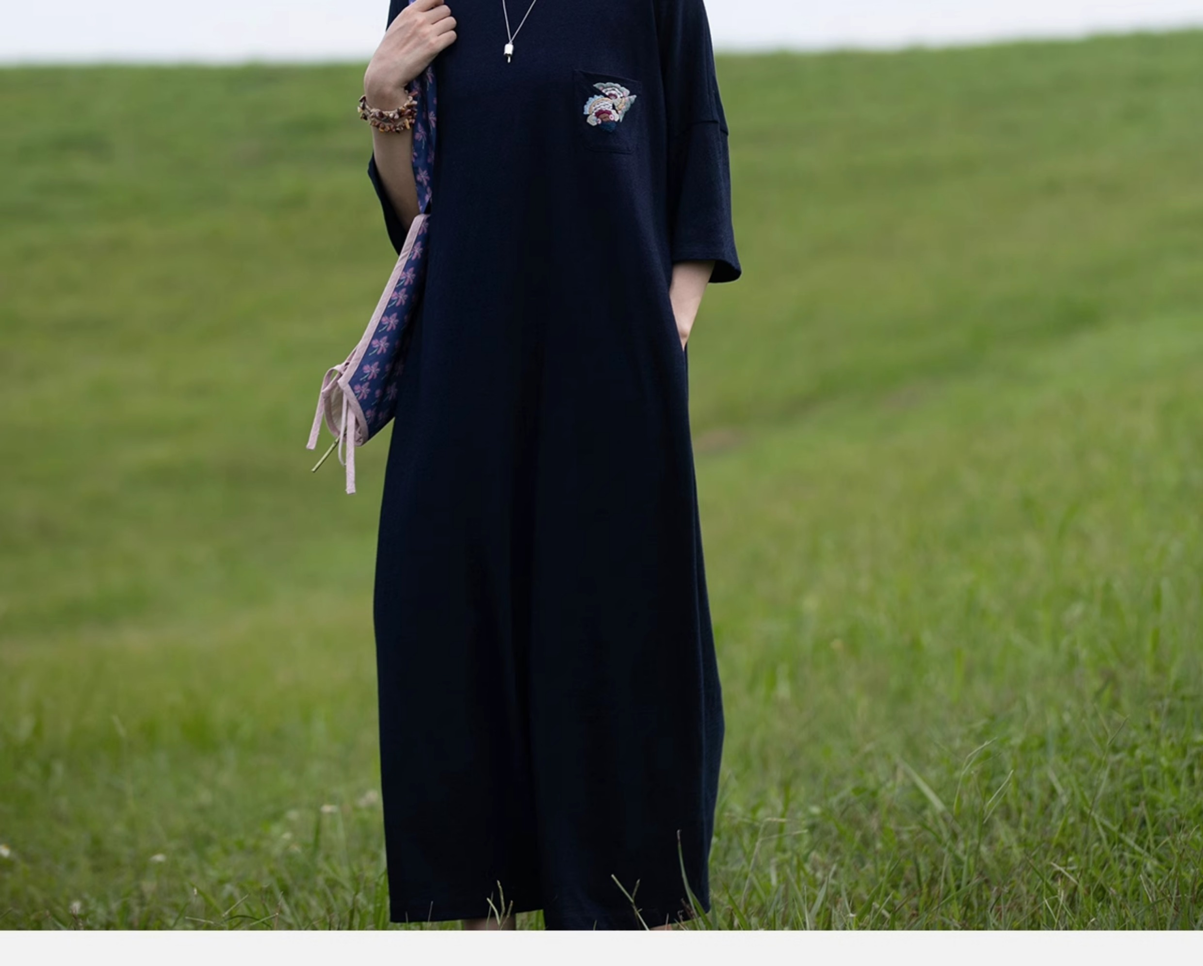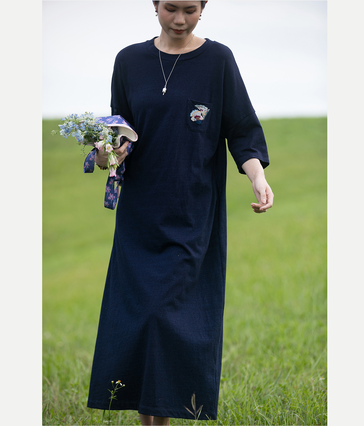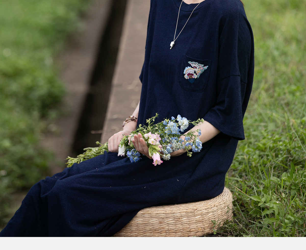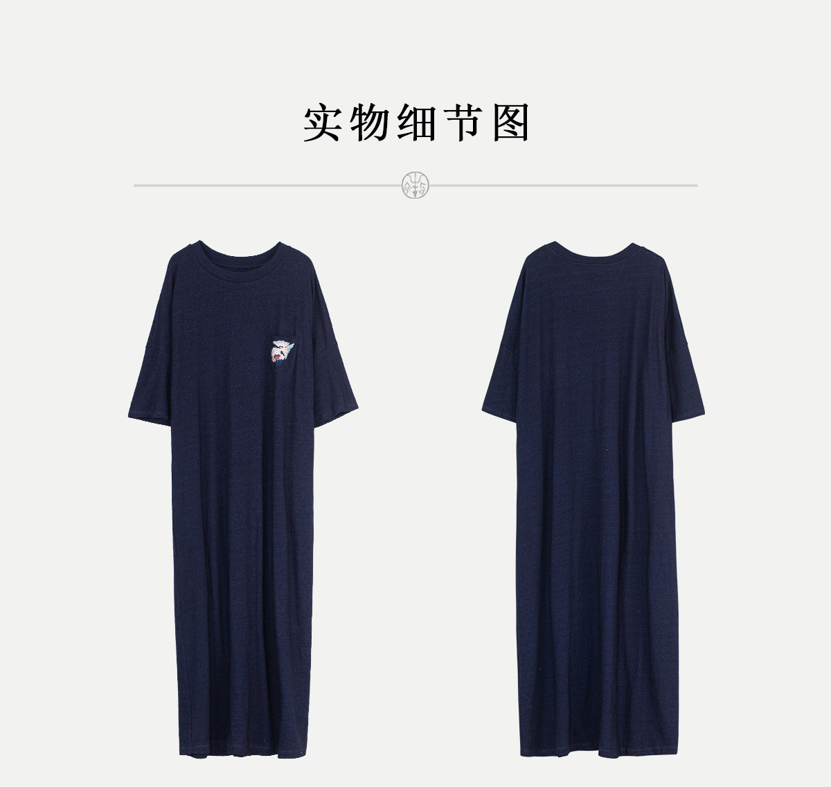 牧衣游原创 酵洗刺绣连衣裙轻薄圆领靛蓝色随性宽松短袖长裙 月景