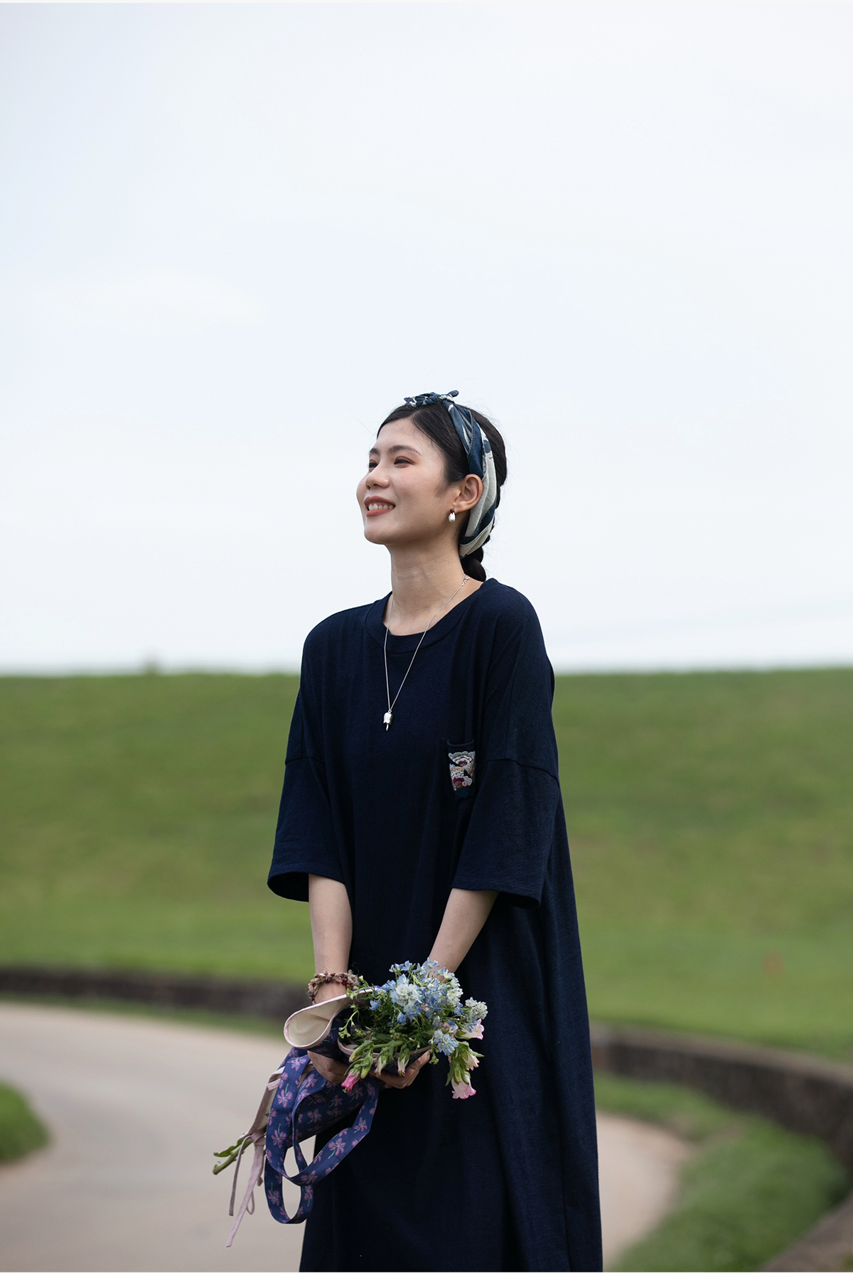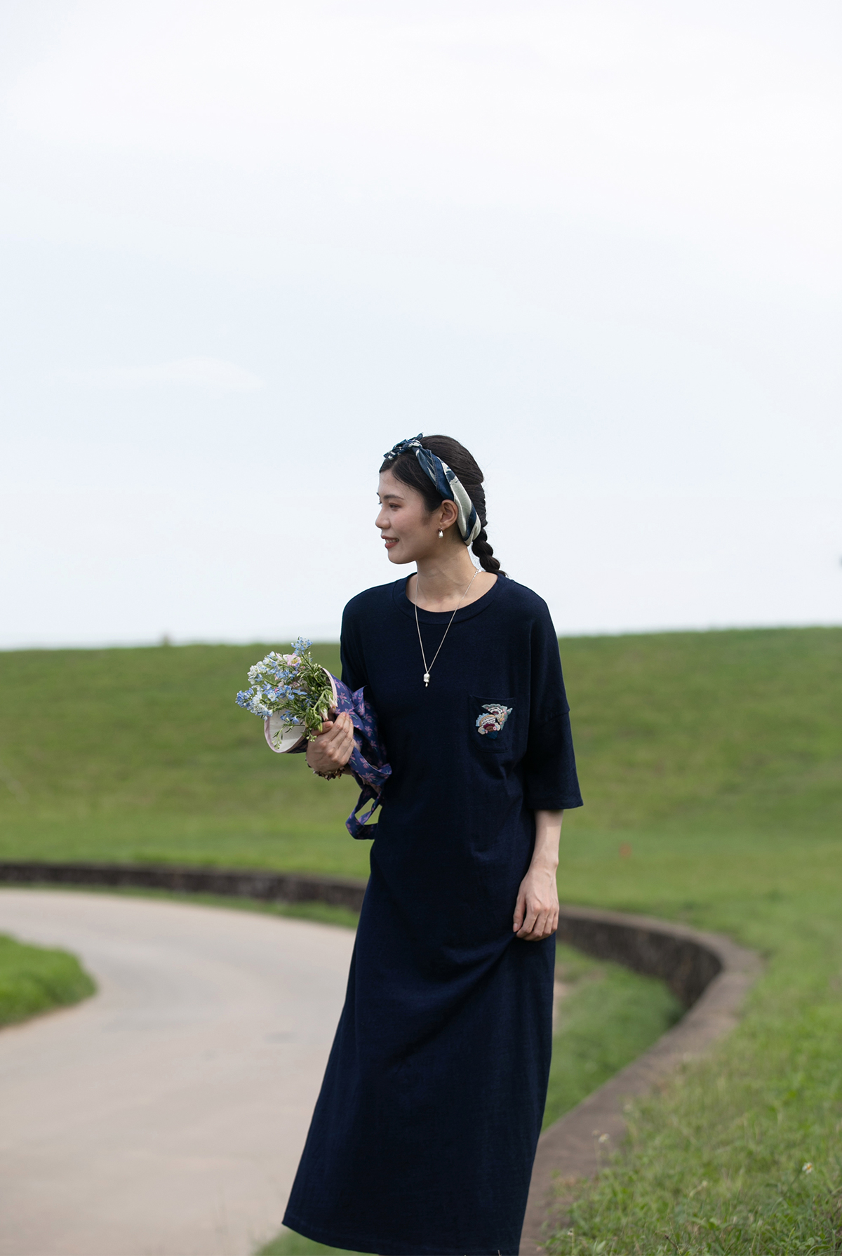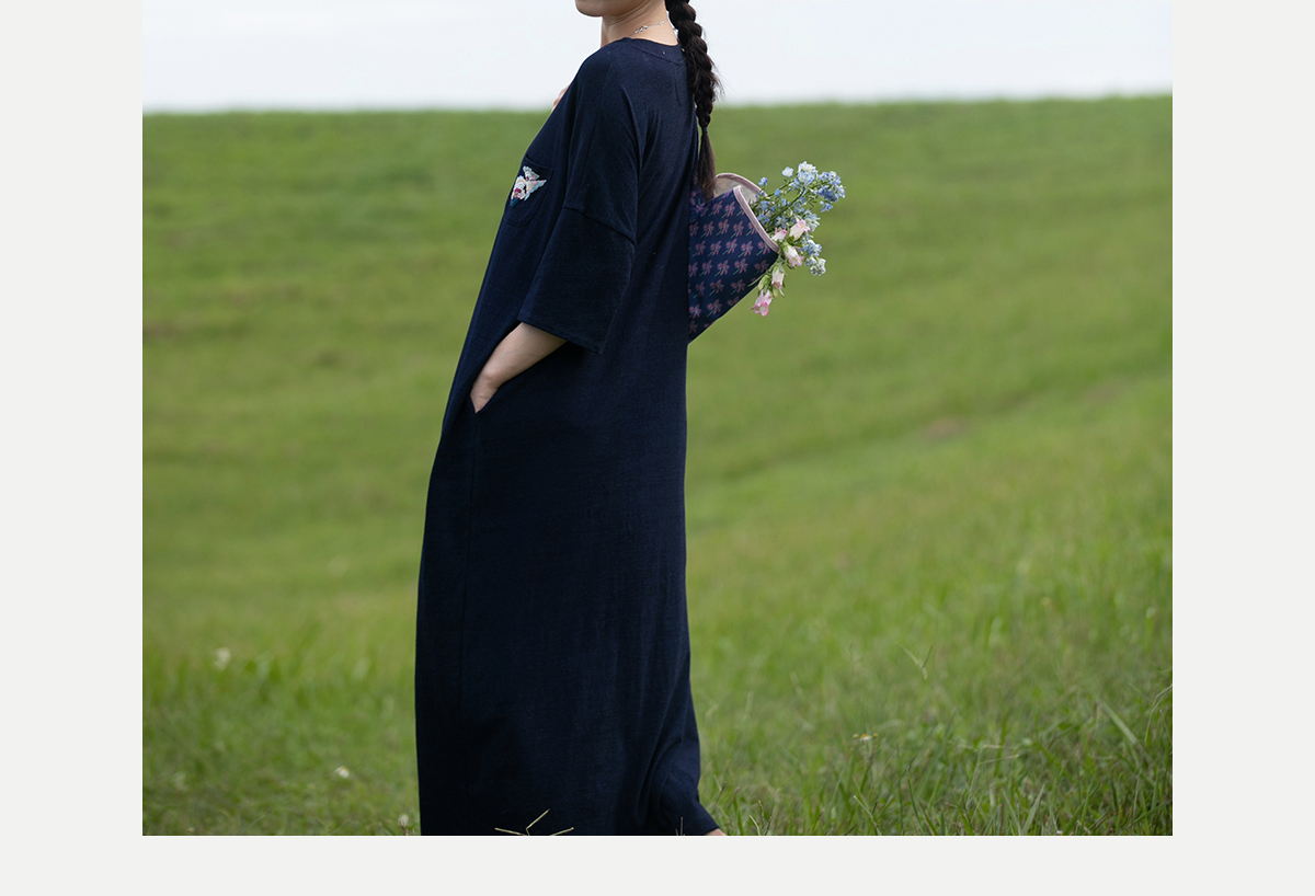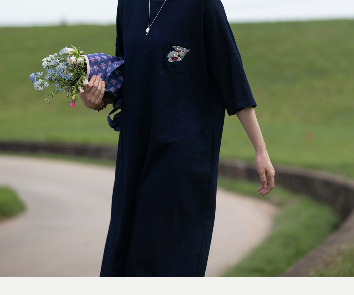 牧衣游原创 酵洗刺绣连衣裙轻薄圆领靛蓝色随性宽松短袖长裙 月景