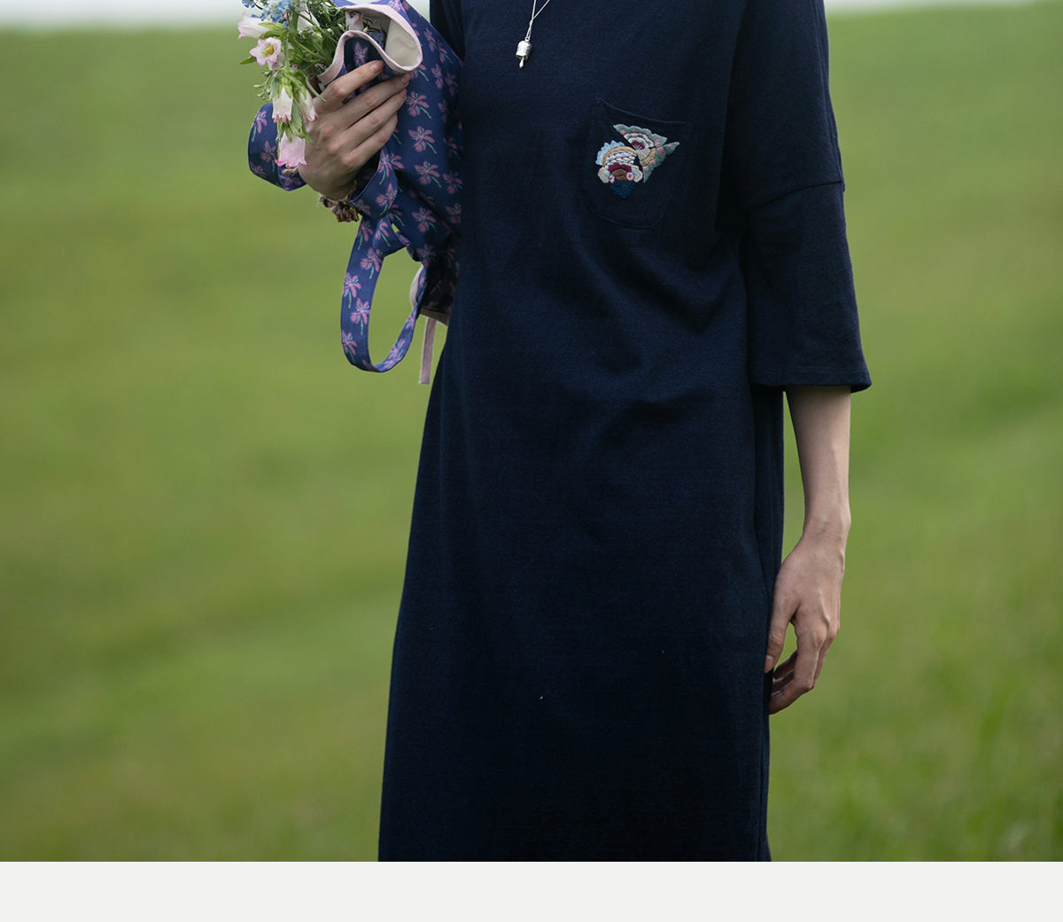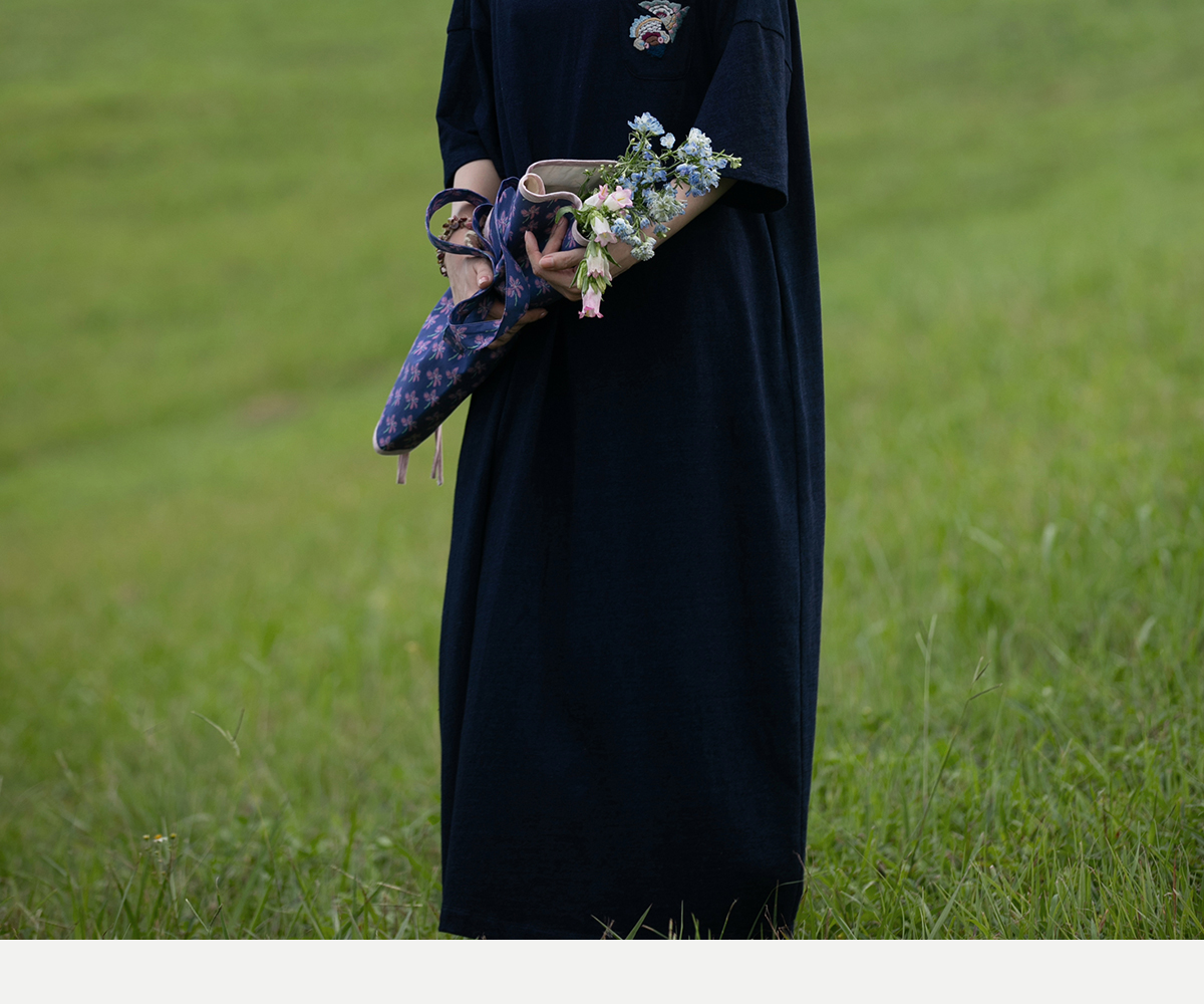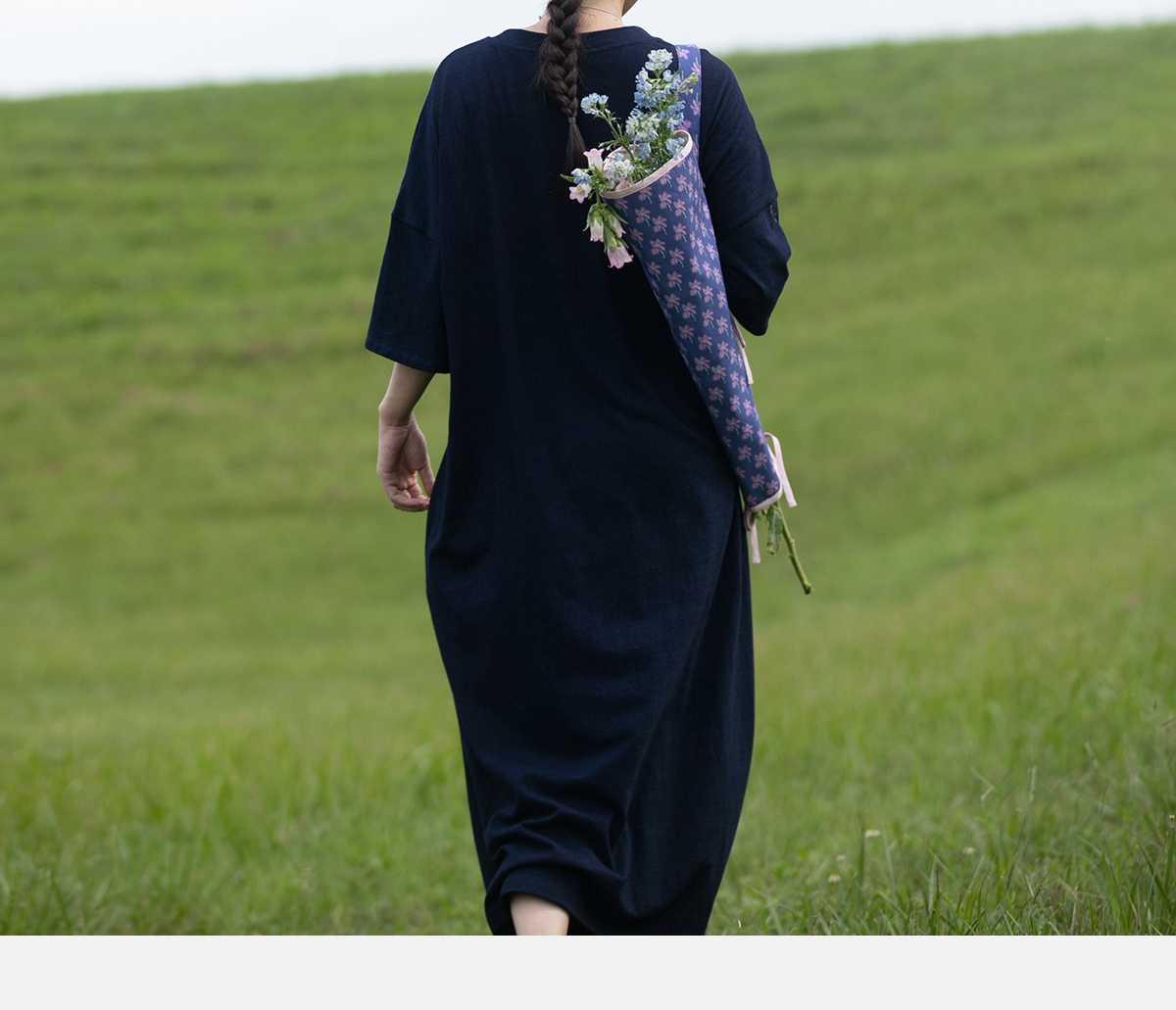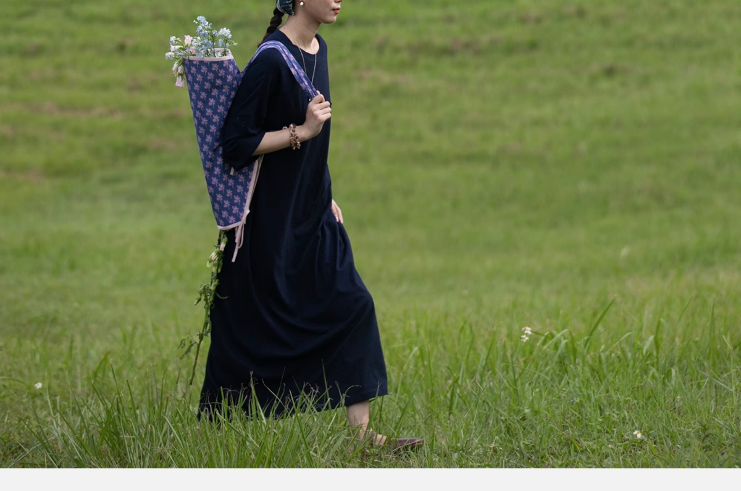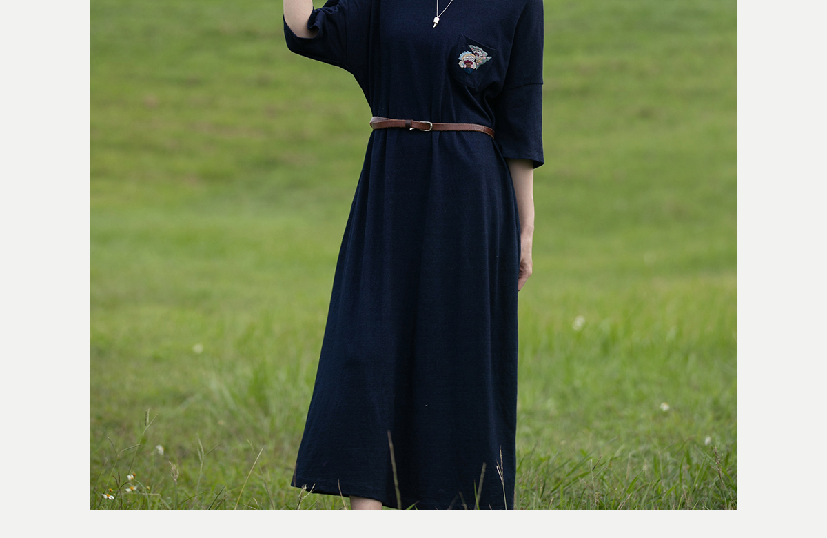 牧衣游原创 酵洗刺绣连衣裙轻薄圆领靛蓝色随性宽松短袖长裙 月景