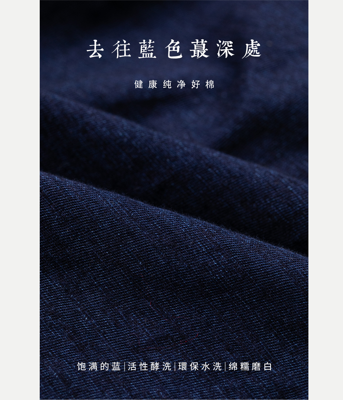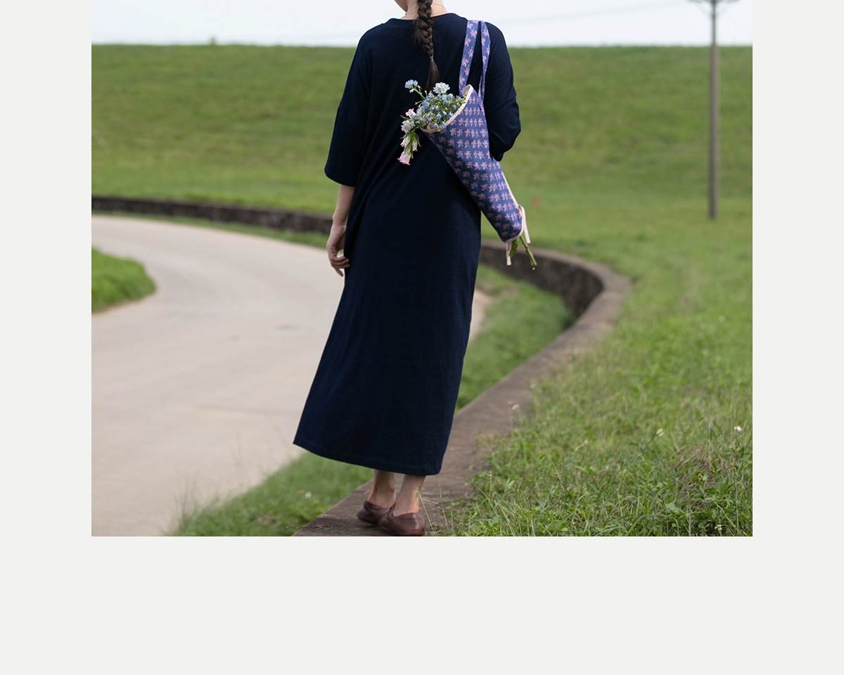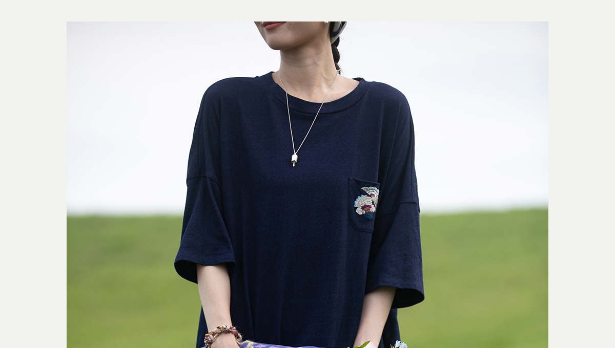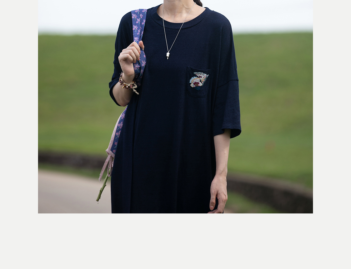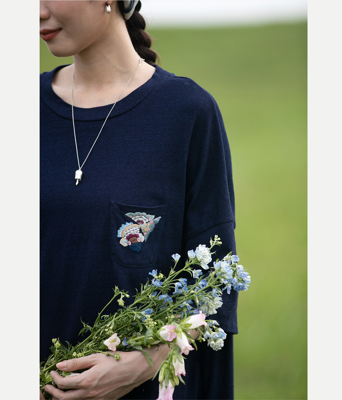 牧衣游原创 酵洗刺绣连衣裙轻薄圆领靛蓝色随性宽松短袖长裙 月景