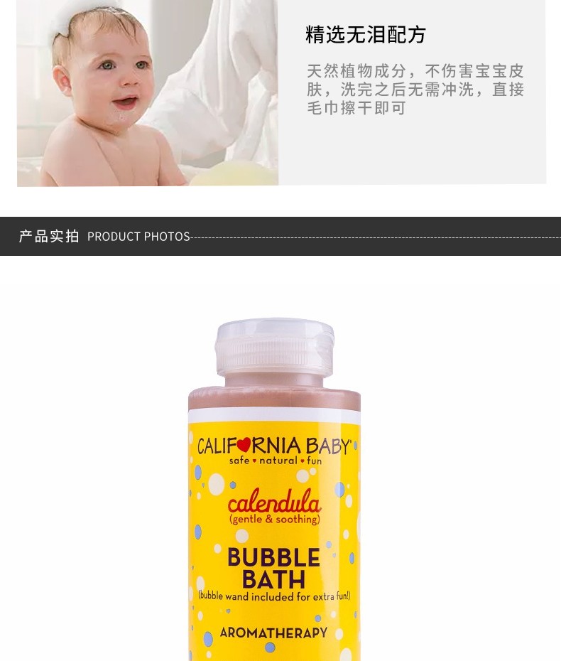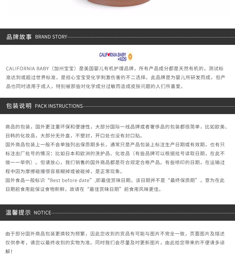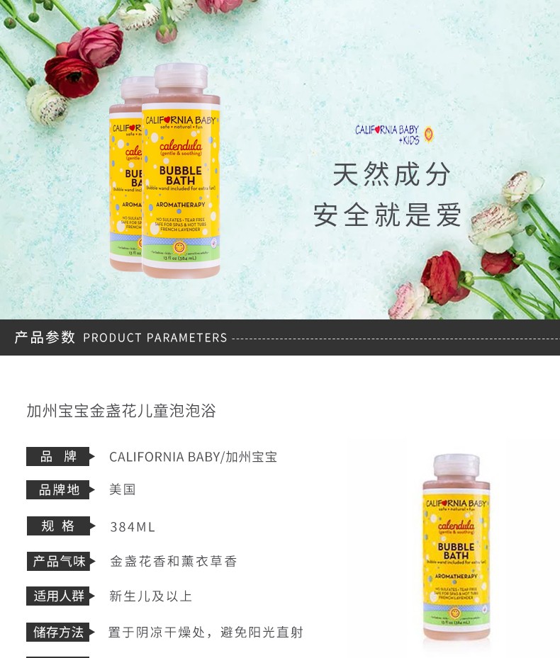 California baby是美国高端商超明星产品,天然有机,无化学添加成分,不会刺激伤害宝宝的娇嫩皮肤,