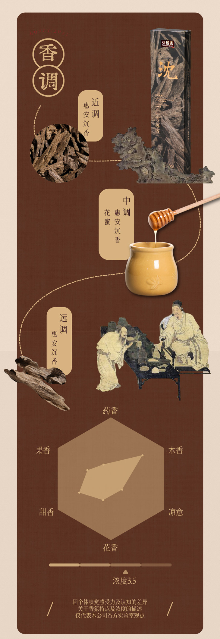弘毅斋品牌高端木香—惠安沉香,以越南野生虫漏沉香为主料,以花蜜复构出泛起花甜,微露凉意的沉香气息,表现沉香变化之美,自然之韵。定心安神,伴您入眠首选。