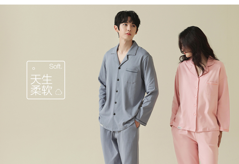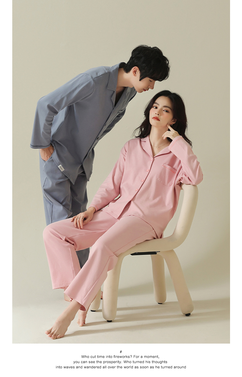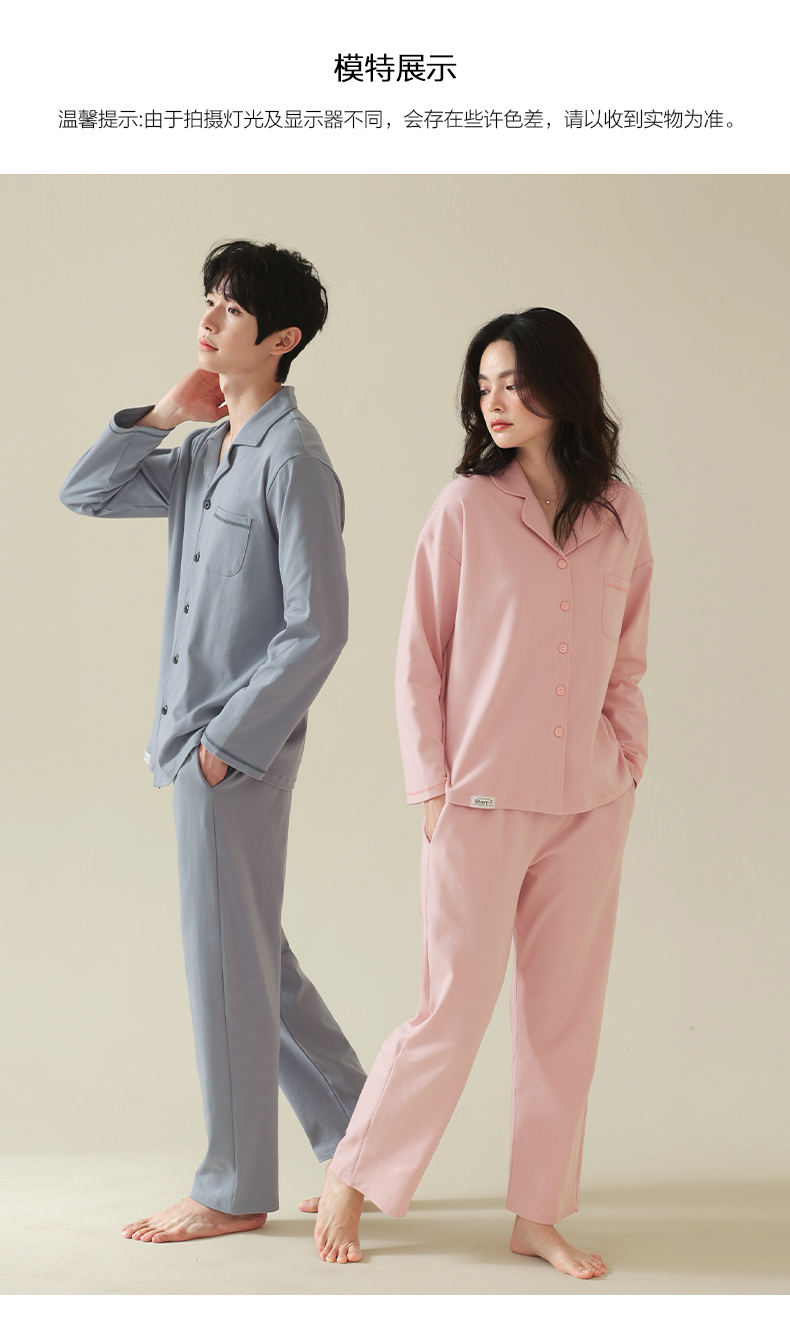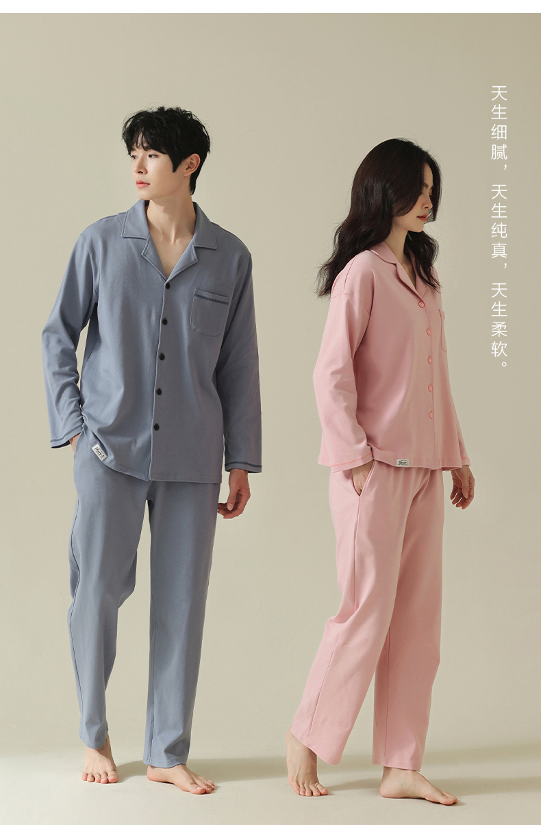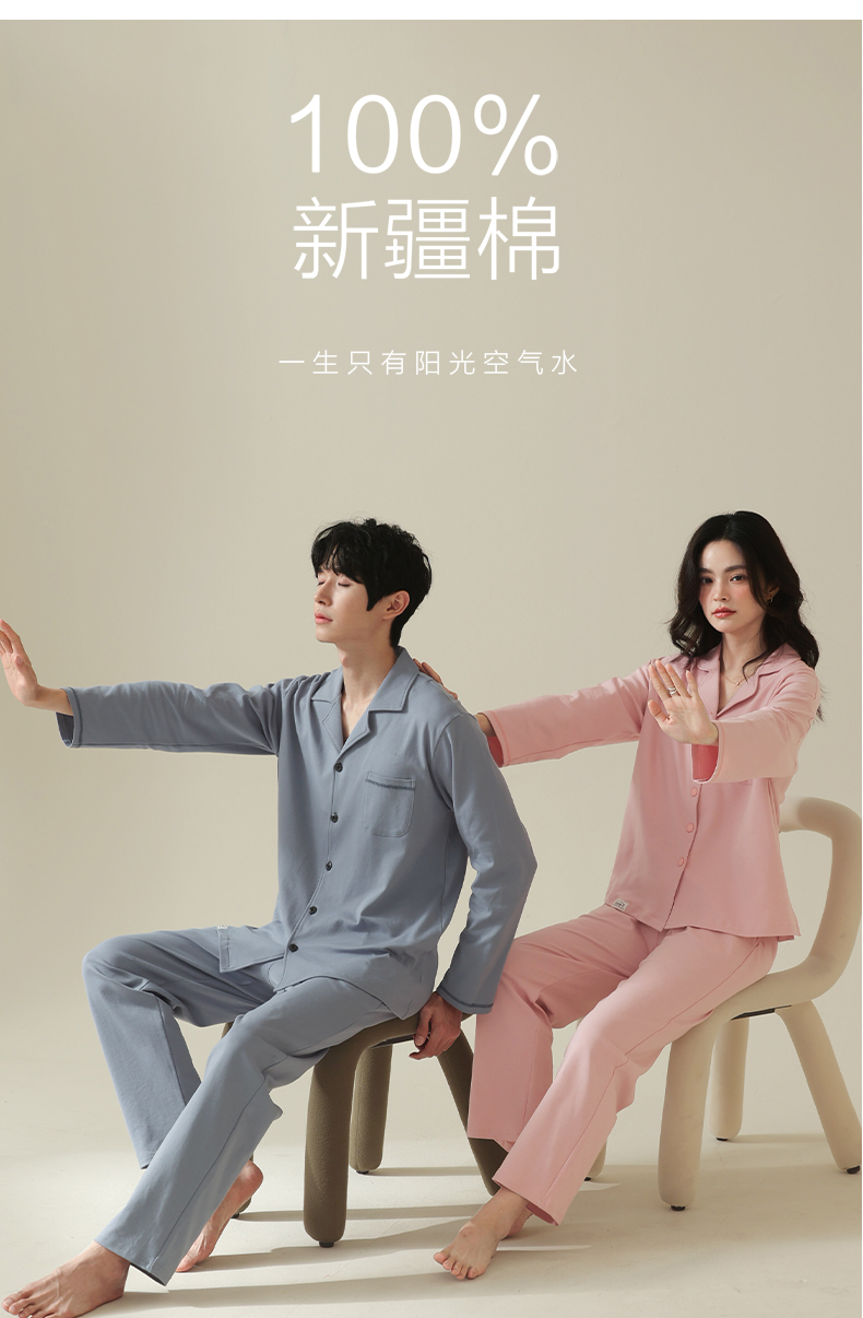 【舒肤棉】自然醒新疆棉情侣睡衣女春季新款长袖翻领开衫素色套装男士家居服可外穿JLM
