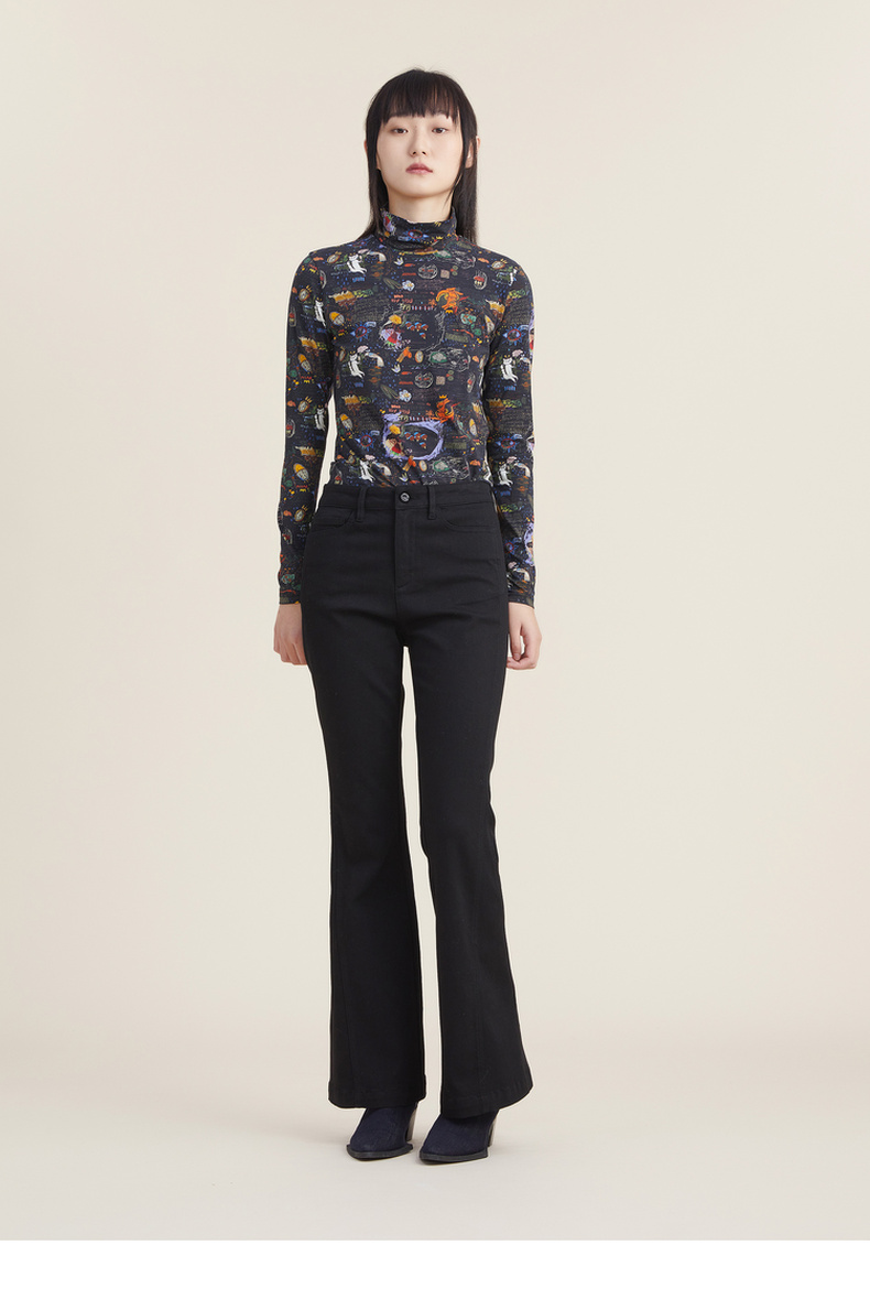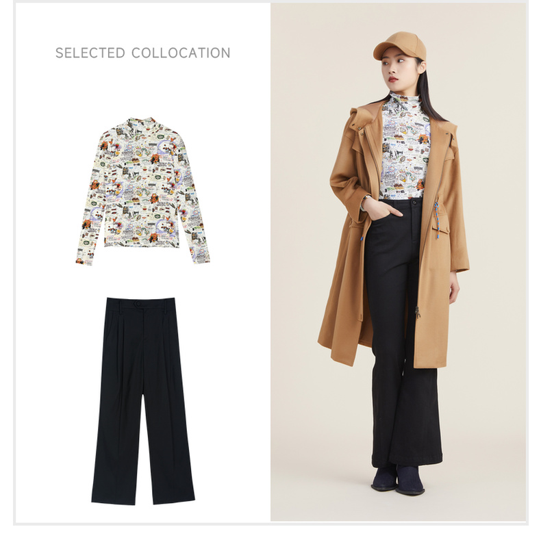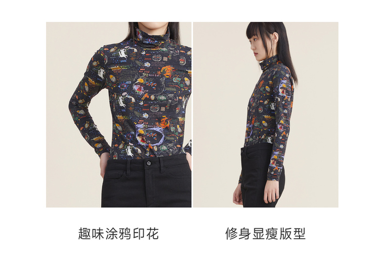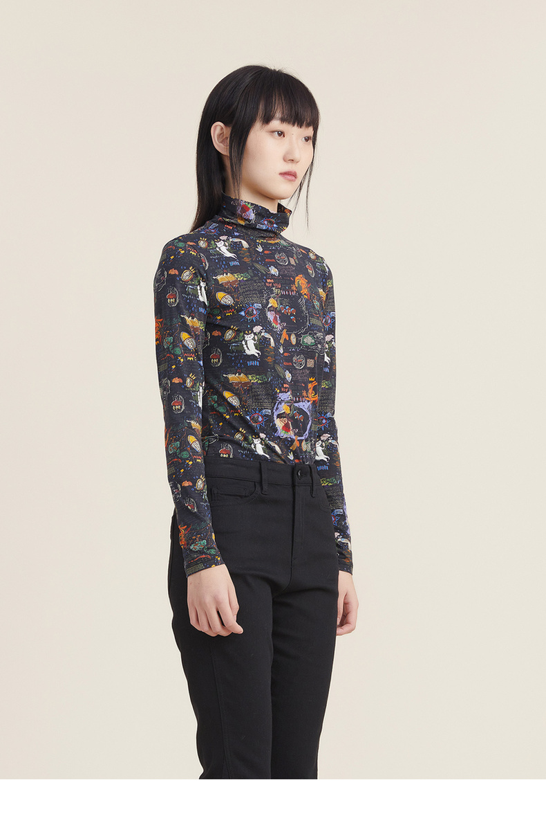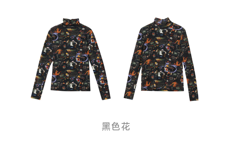 谜底休闲花色长袖半高领T恤女2022秋新款打底衫内搭上衣223MT1026