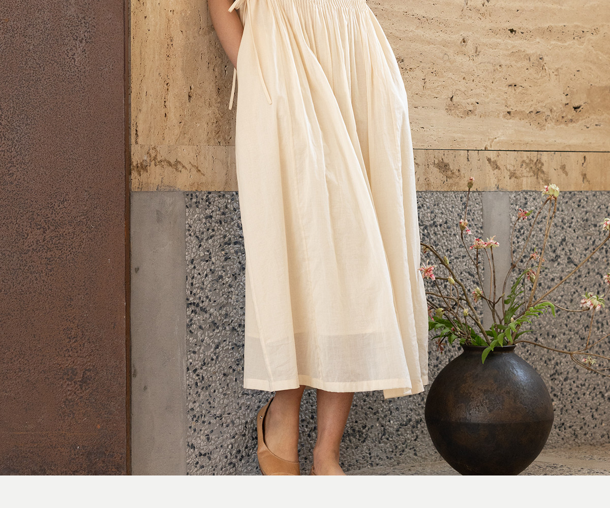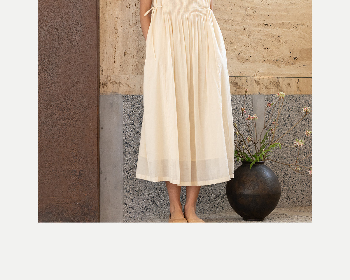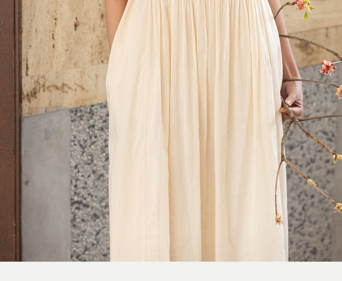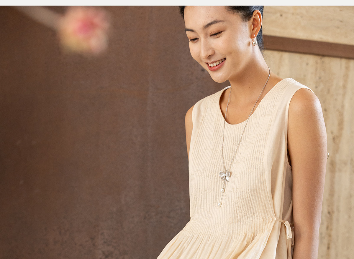 牧衣游原创 100支纯棉净色打条连衣裙女新款气质无袖长裙 花满市