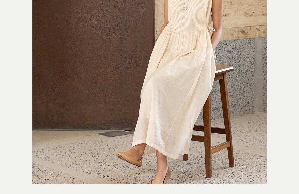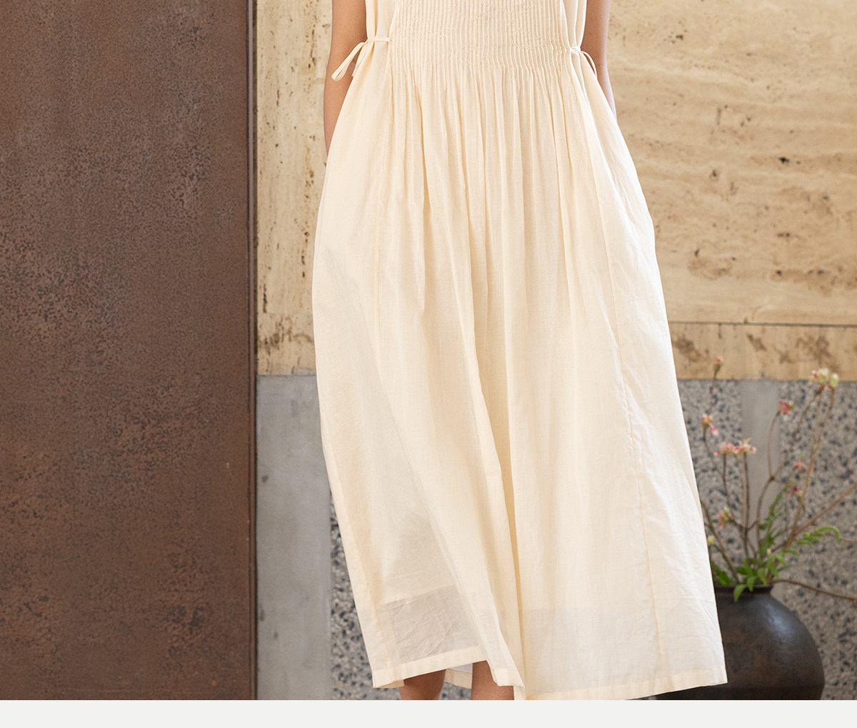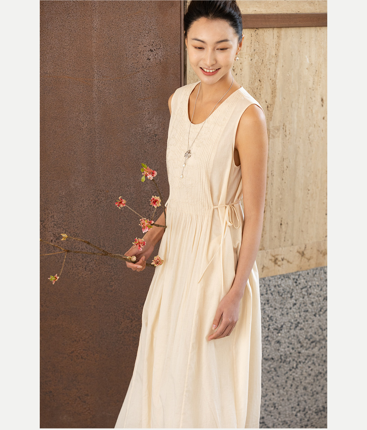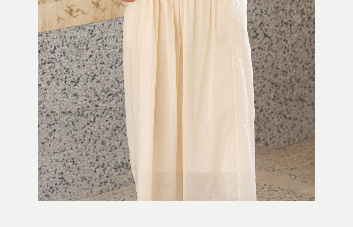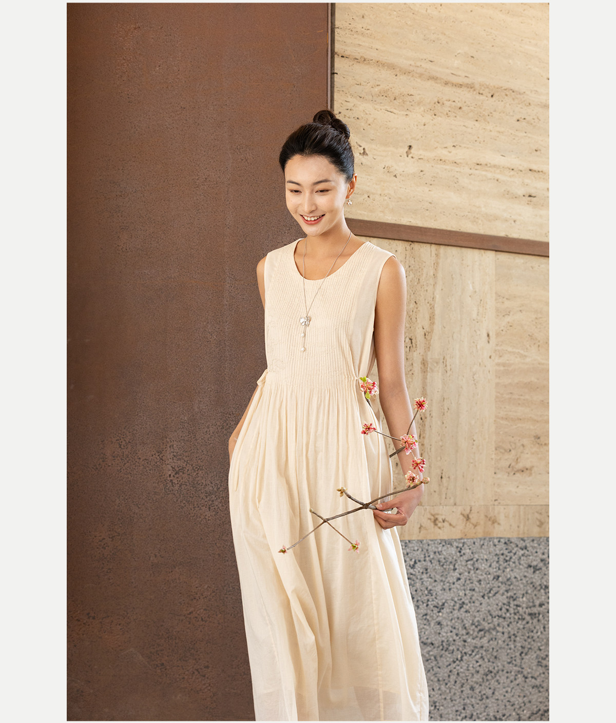 牧衣游原创 100支纯棉净色打条连衣裙女新款气质无袖长裙 花满市