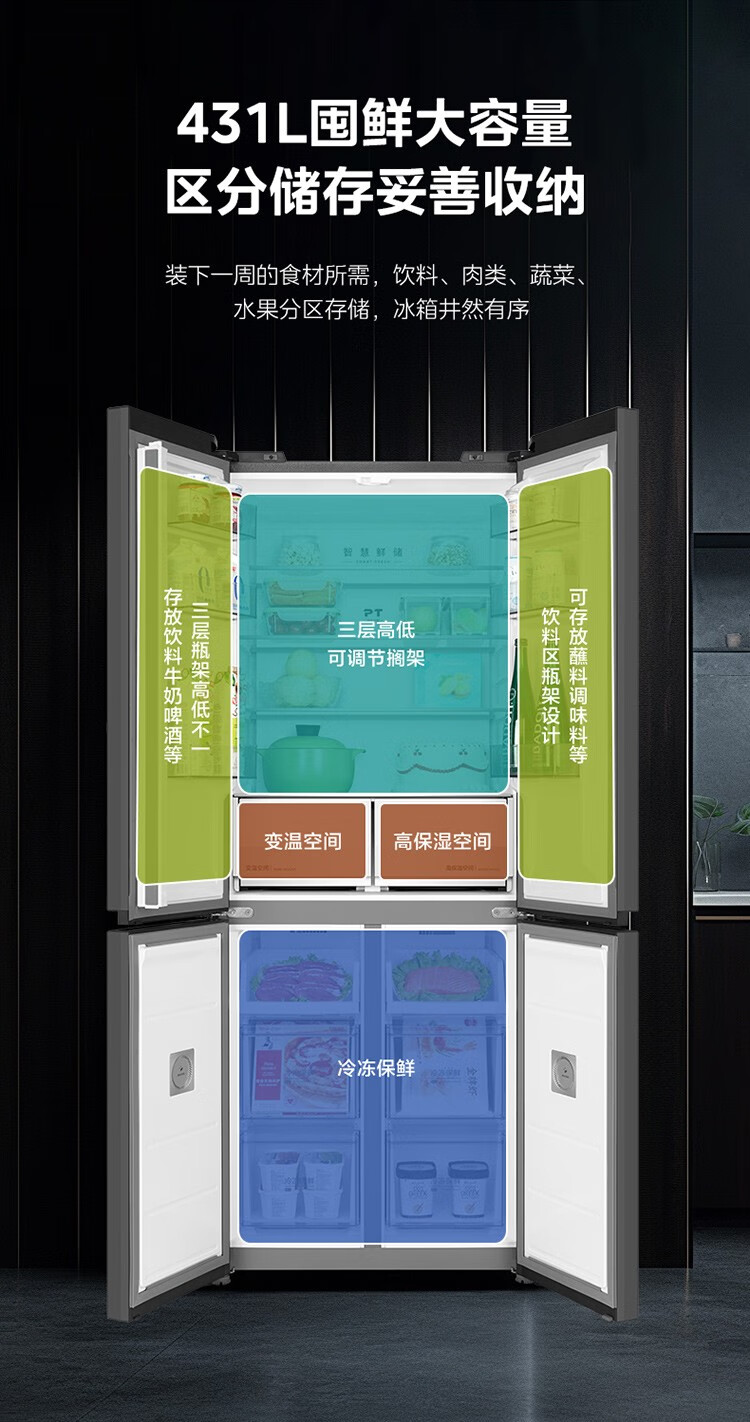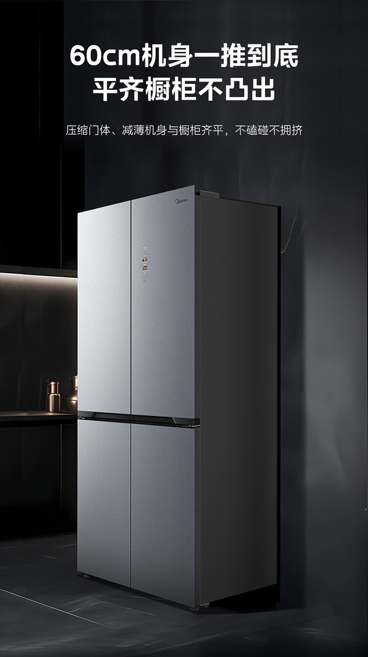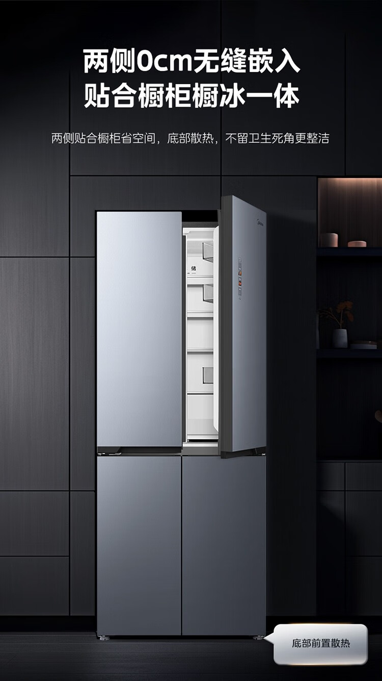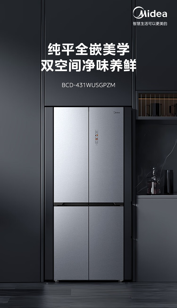 美的十字对开门四门风冷无霜零距离嵌入式一级能效无霜智能家用电冰箱 433升底部散热BCD-433WUSGPZM极地白