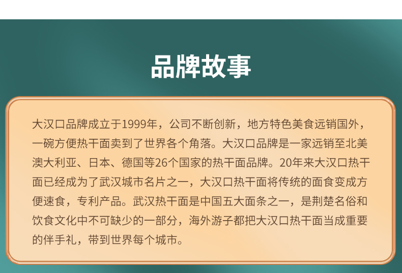 大汉口热干面是武汉城市名片之一,热干面代表企业。卖向全世界多个国家的武汉热干面,全球畅销15年, 全国各麦德龙、山姆、Today超市等大中型商超均有销售。