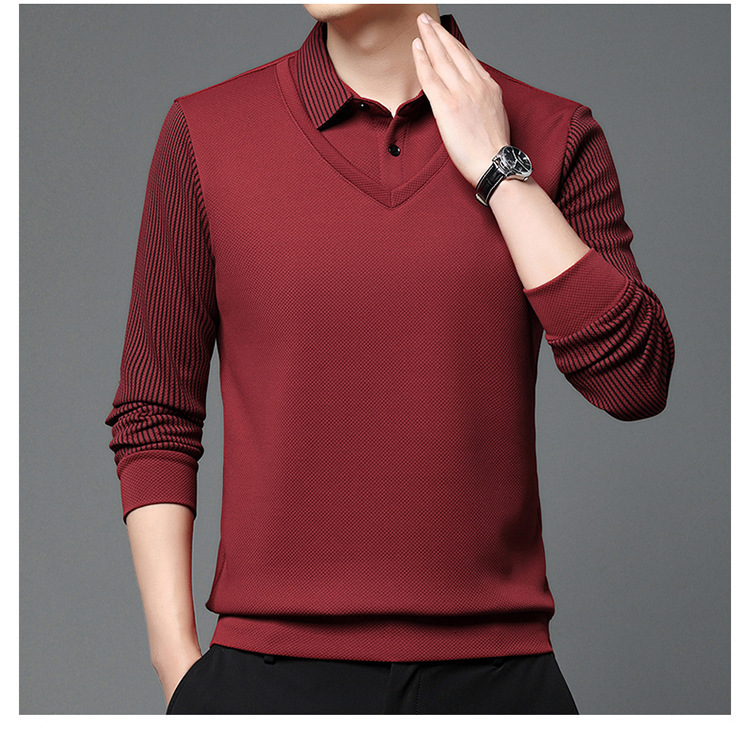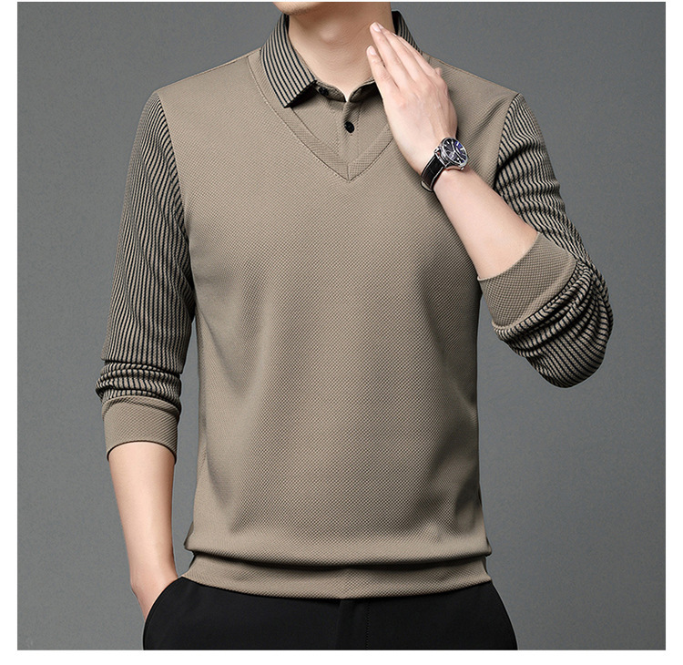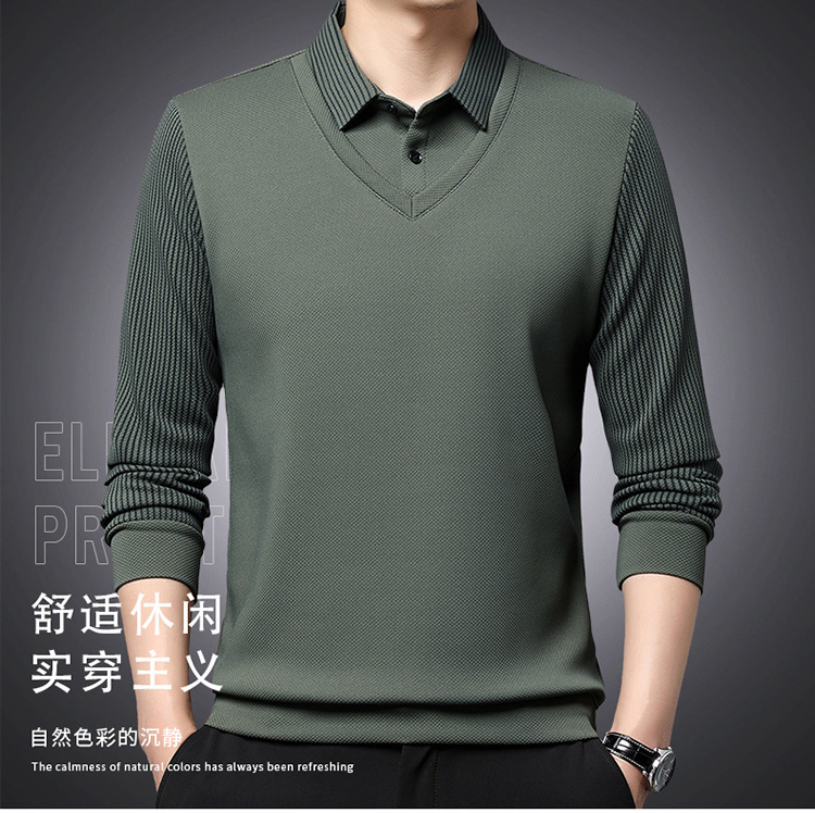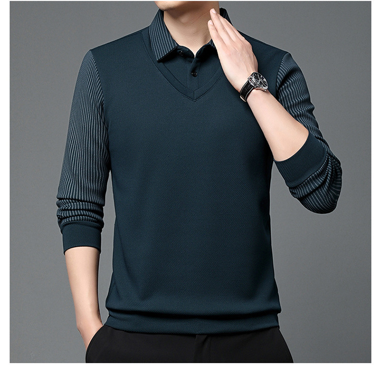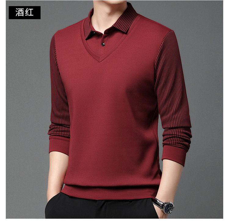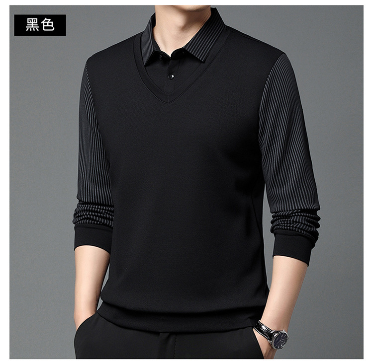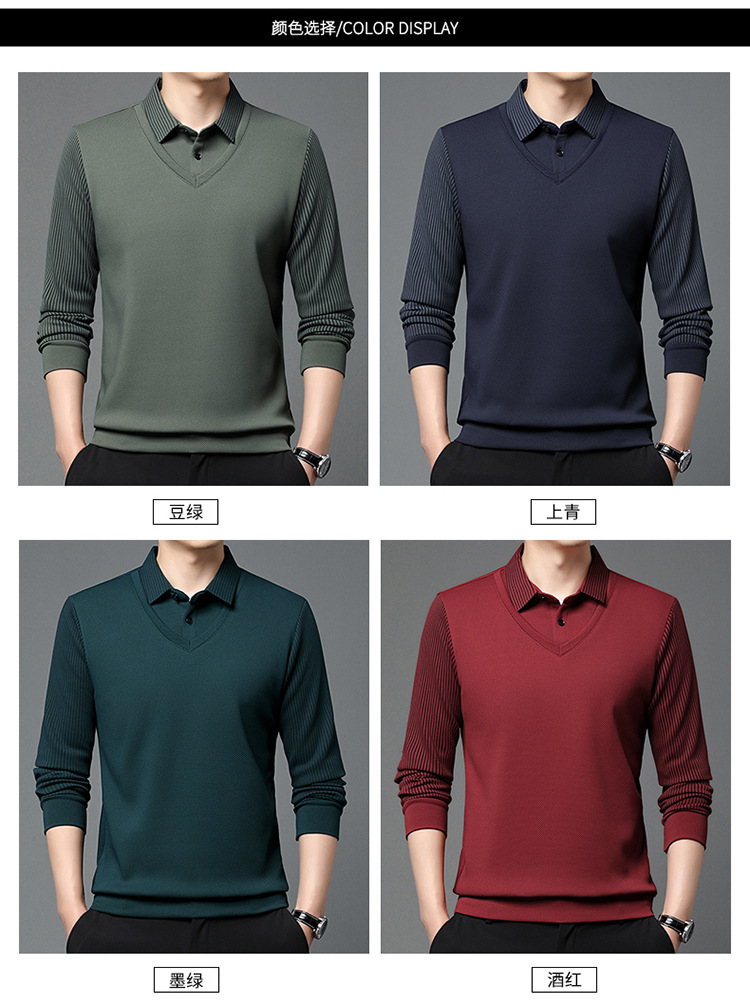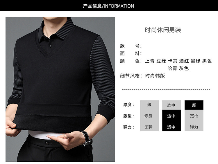 【男士加绒假两件上衣】拼接假两件V领口超级帅2025秋冬季男士加绒加厚假两件上衣男长袖t恤休闲条纹翻领POLO衫