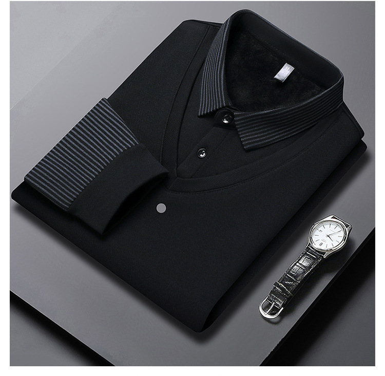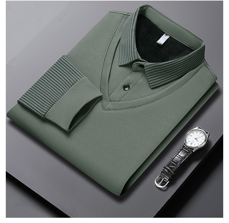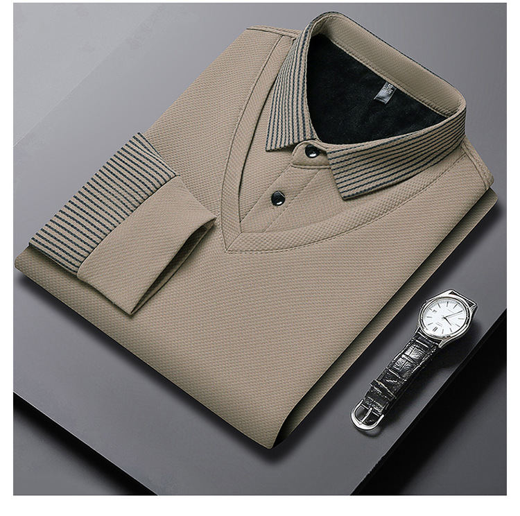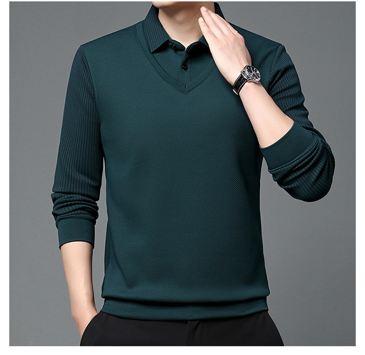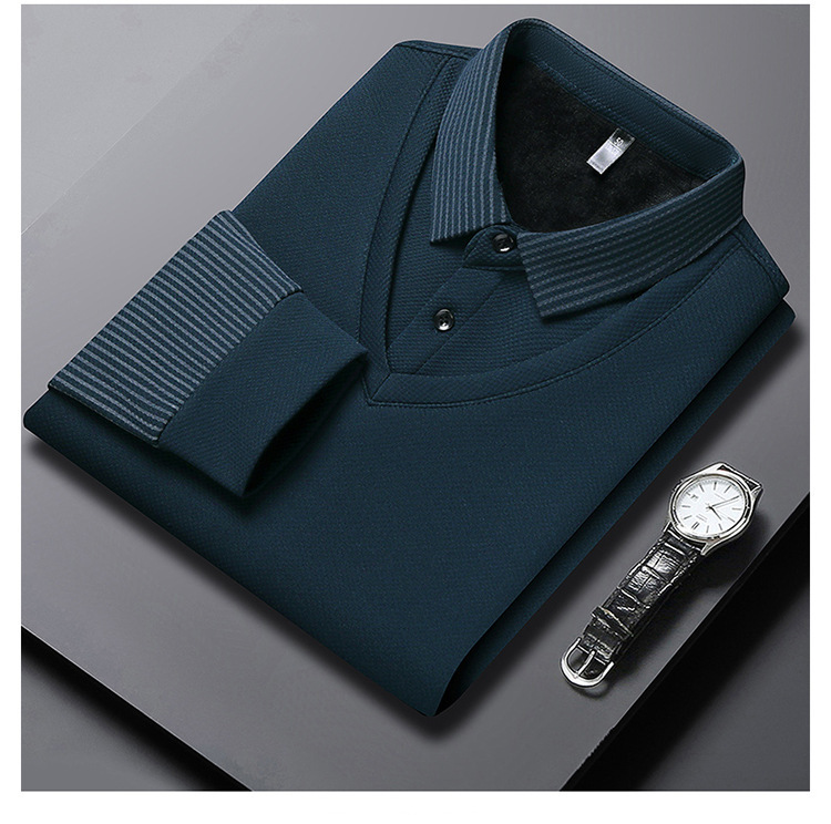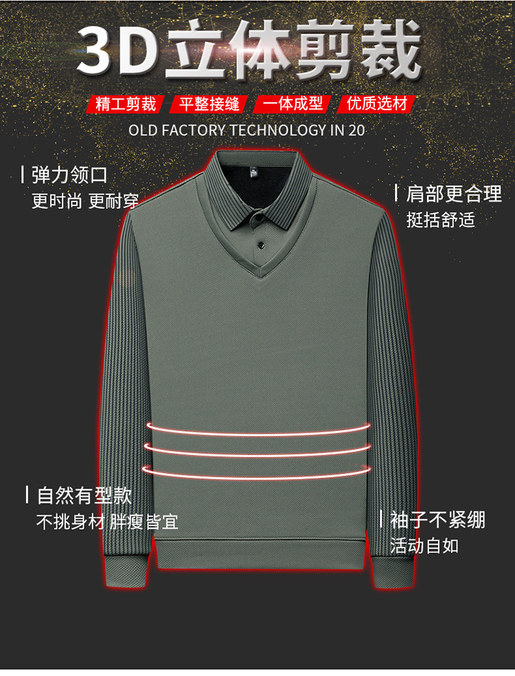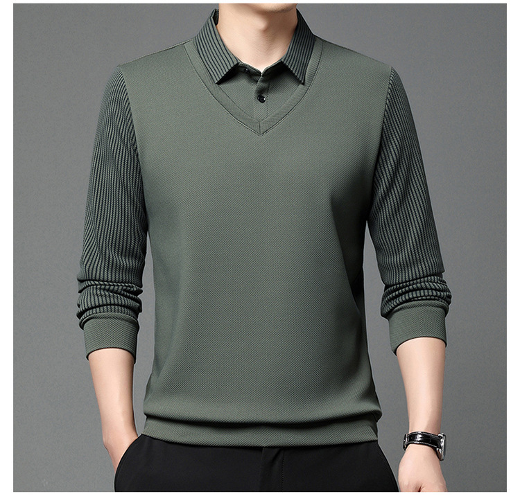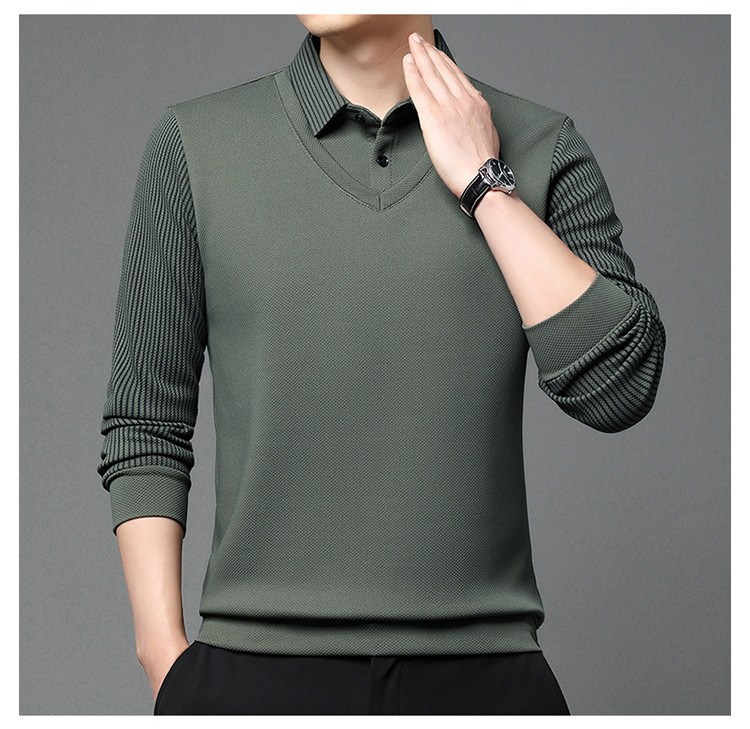 【男士加绒假两件上衣】拼接假两件V领口超级帅2025秋冬季男士加绒加厚假两件上衣男长袖t恤休闲条纹翻领POLO衫