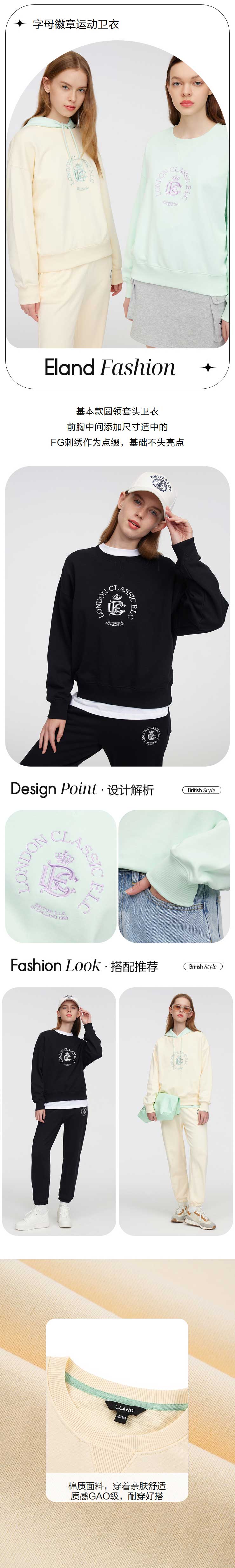 ELAND衣恋2022年春季新款小众洋气宽松设计感字母徽章圆领卫衣女EEMTC12E4M