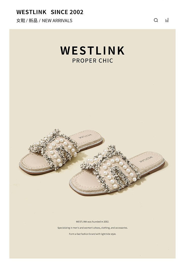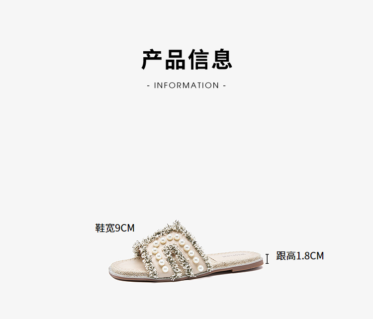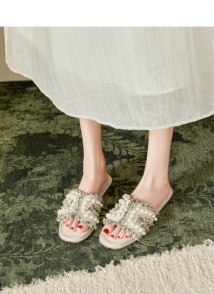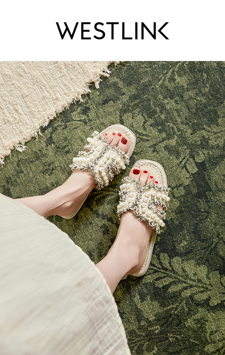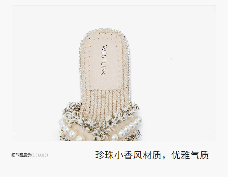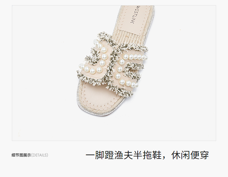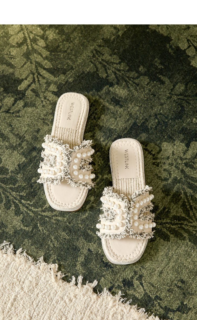 西遇度假凉拖鞋女2026夏季新款草编珍珠绝美平底一脚蹬外穿沙滩鞋V0066408