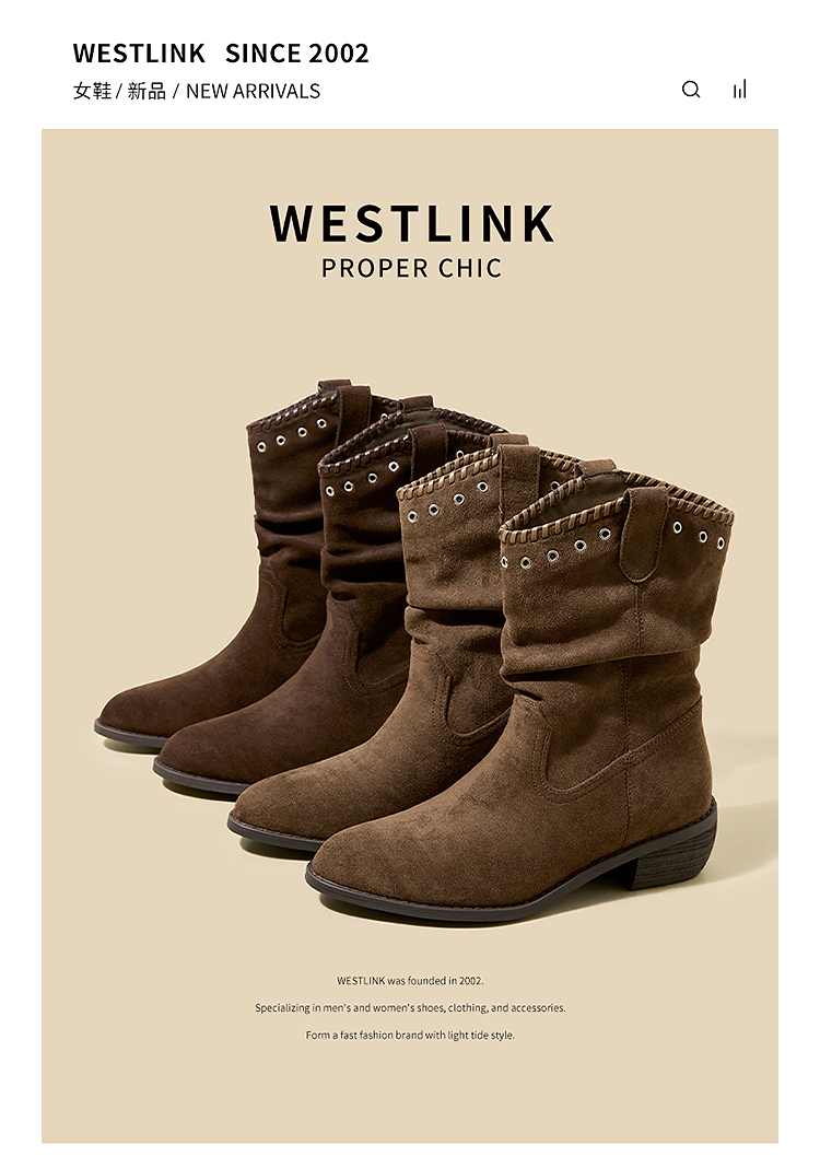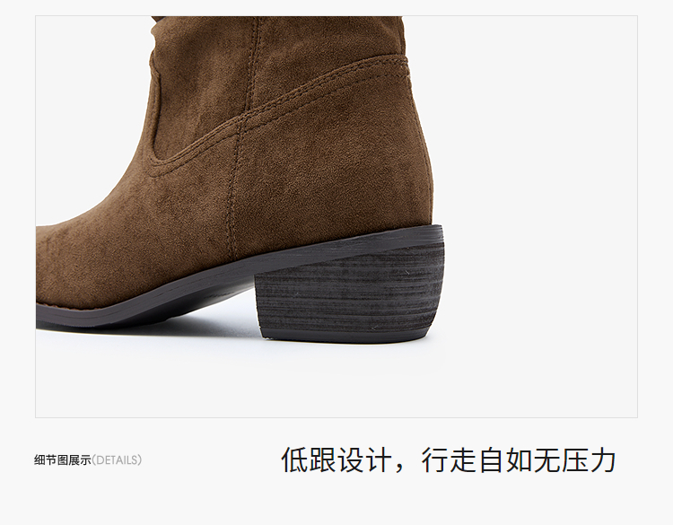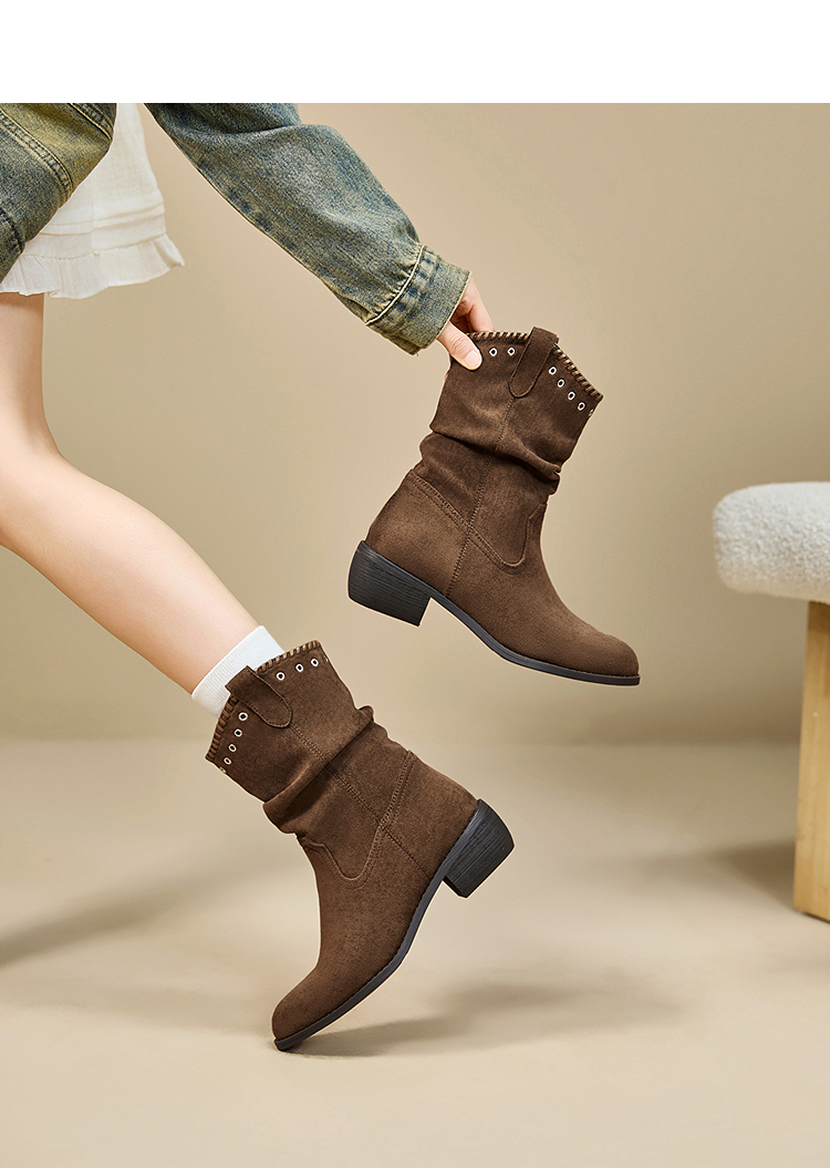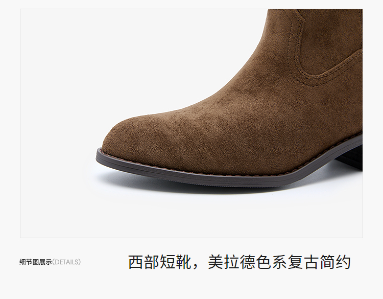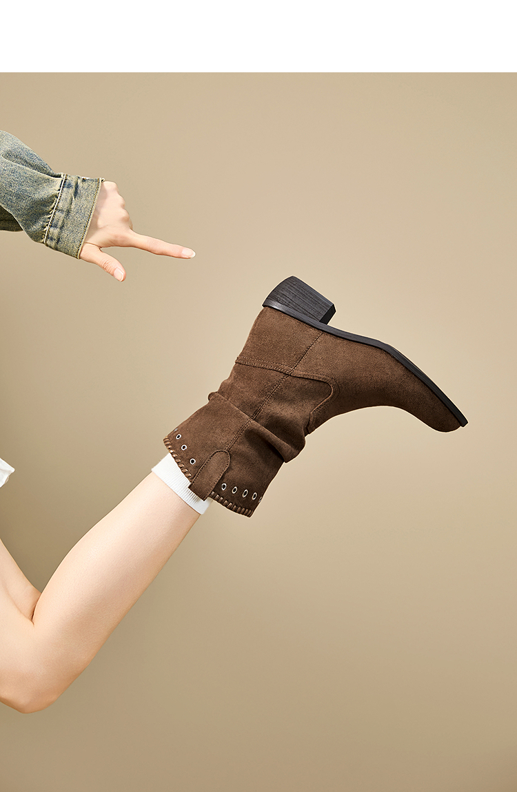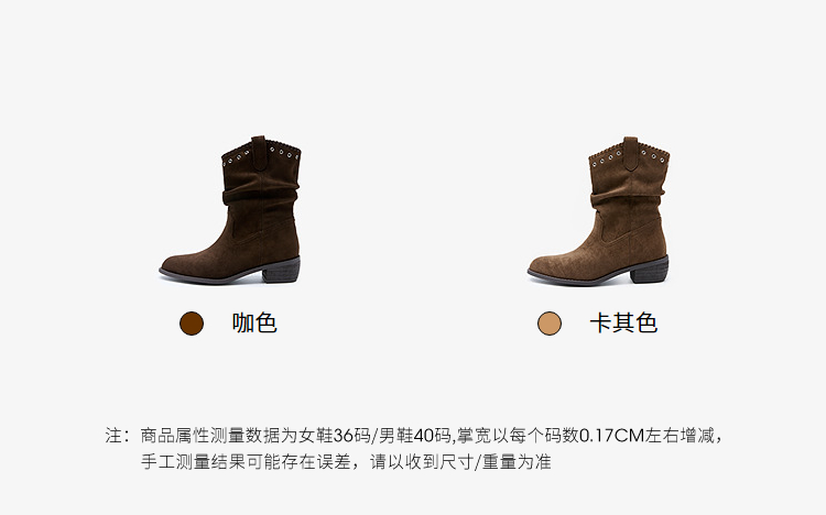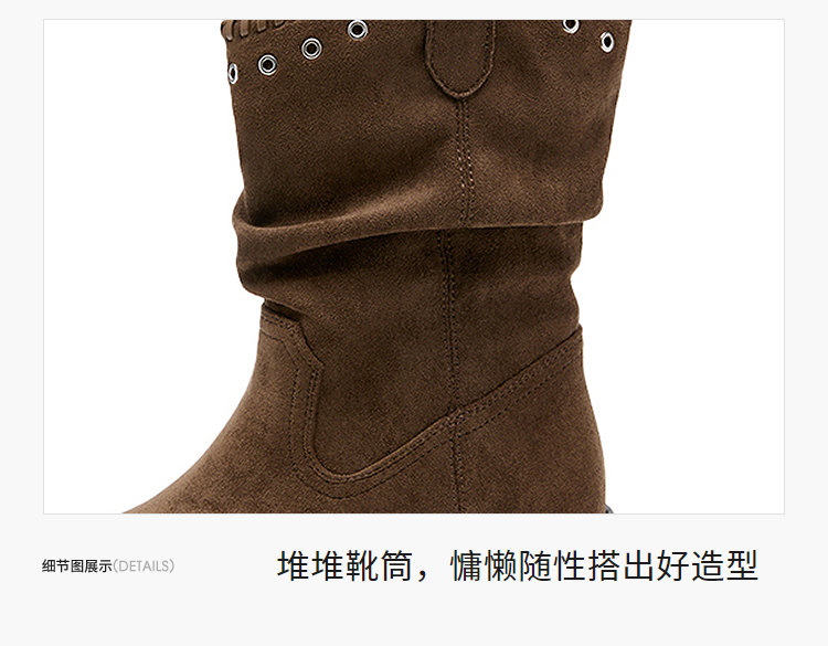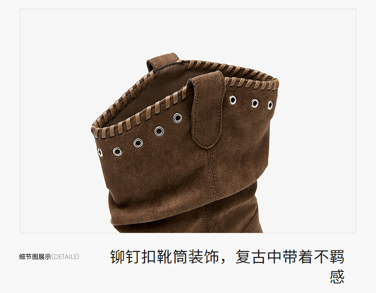 西遇V口西部牛仔靴女新款秋冬复古铆钉绒面堆堆靴黑色短靴子V2257266